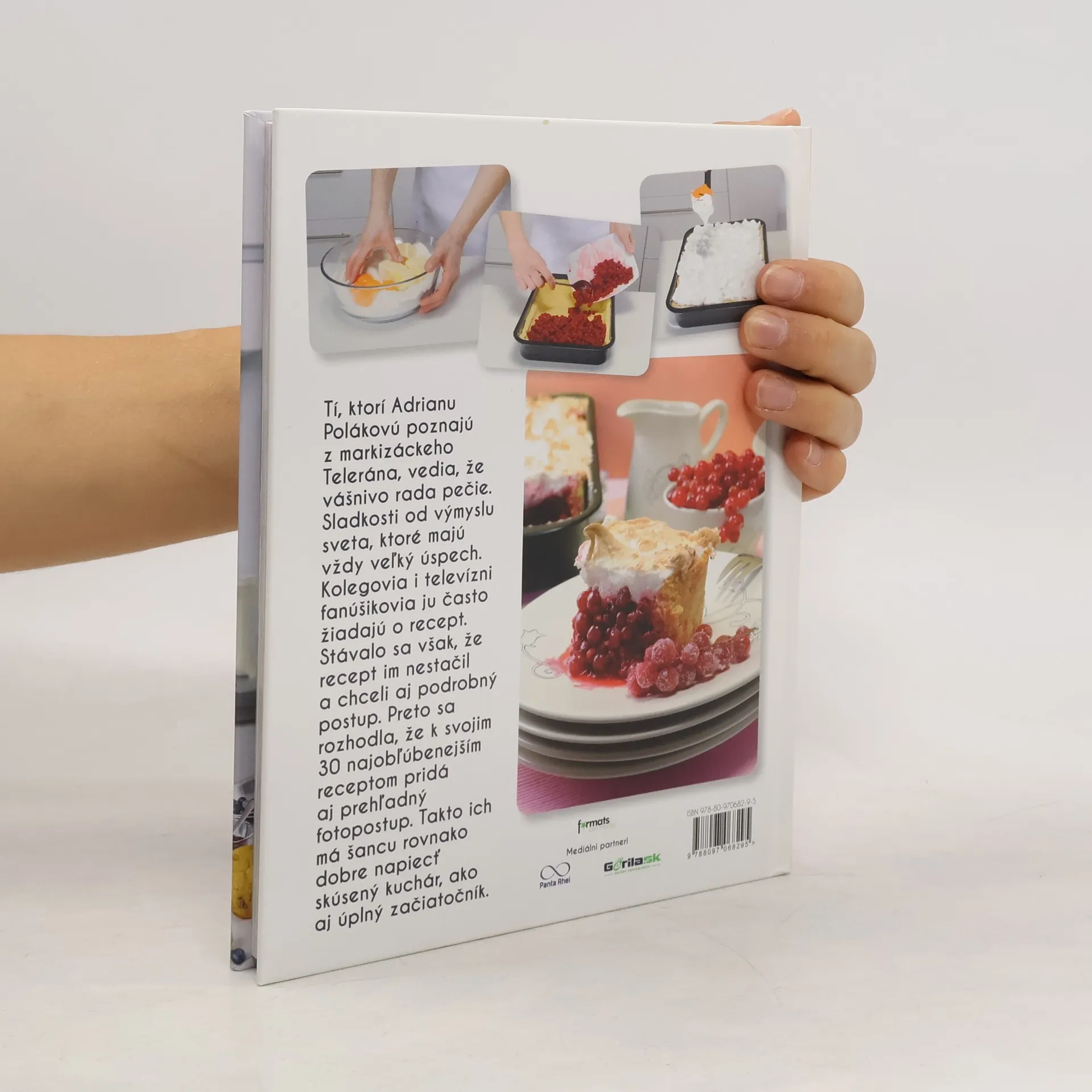 Tí, ktorí Adrianu Polákovú poznajú z markízackeho Telerána vedia, že vášnivo rada pečie. Sladkosti od výmyslu sveta, ktoré majú vždy veľký úspech. Kolegovia i televízni fanúšikovia ju často žiadajú o recept. Stávalo sa však, že recept im nestačil a c hceli aj podrobný postup. Preto sa rozhodla, že k svojim 30 najobľúbenejším receptom pridá aj prehľadný foto-postup. Takto ich má šancu rovnako dobre napiecť skúsený kuchár, ako aj úplný začiatočník. V knihe nájdete recepty na koláče, ovocné, krémové , fit, detské . Vychytávkou je kysnuté cesto a ale aj slané pochúťky . Štruktúra knihy je rozdelená podľa náročnosti a ku každému receptu je detailný foto-postup s popisom. Nechýbajú ani dobré tipy a nápady ako si pečenie ešte vylepšiť. V tejto knih e nájdete dezerty, ktoré sú nie len magnetom pre oči, ale ja delikatesou pre maškrtné jazýčky.