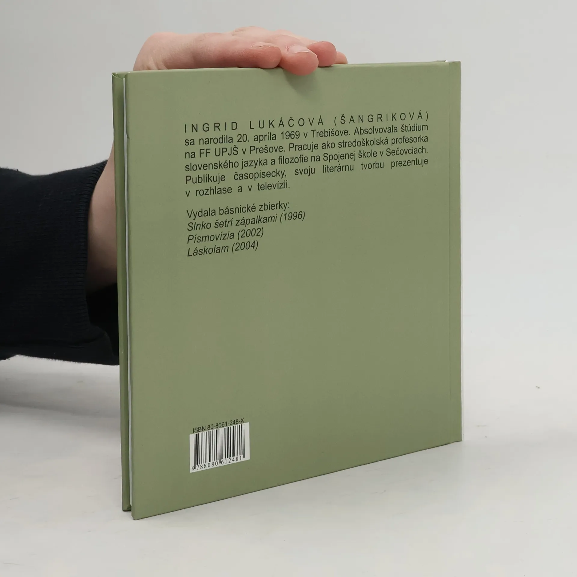 Ingrid Lukáčová, stredoškolská profesorka slovenského jazyka a filozofie, má už sa sebou vydanie troch básnických zbierok: Slnko šetrí zápalkami (1996), Písmovízia (2002) a Láskolam (2004). Preto sa v jej prípade čitateľ môže tešiť na zrelý, harmonický prejav. Rukopis obsahuje 48 básní kompozične roz-delených do dvoch častí (Rezonancia, Si a Ja). Tvorba Ingrid Lukáčovej "ráta" s vnímavou, citovo bohatou čitateľskou verejnosťou, ktorej schopnosti sú naplno rozvinuté i na intelektuálnej úrovni. Autorkina presnosť a miestami až drsnosť je pekne vyvážená ženskou intuitívnosťou a vnikaním do hlbších rovín skutočnosti. Lukáčová disponuje očividným darom slovnej a obrazovej asociácie, ktorý najmä v spoločnosti originálneho uvažovania zaručuje bohatý vnútorný zážitok.