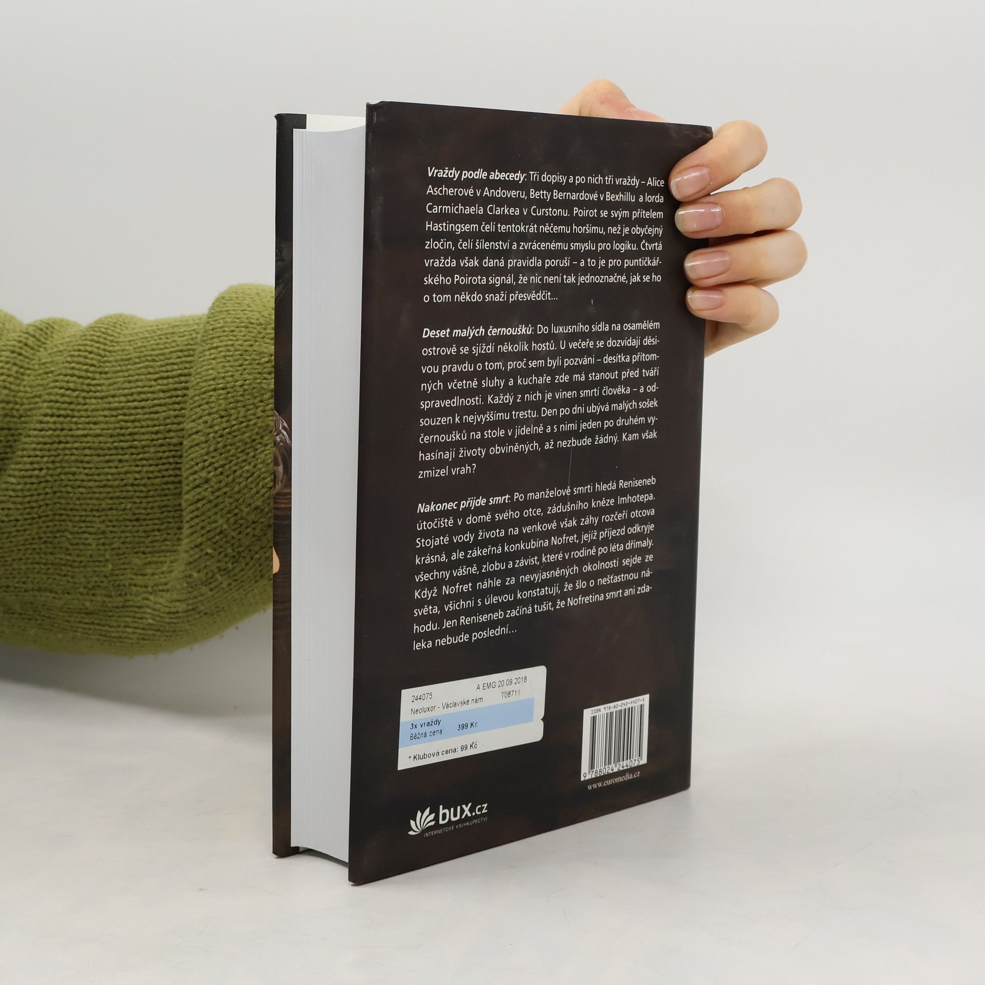 Trojici výjimečných detektivek Agathy Christie tentokrát spojuje motiv několikanásobné vraždy. Po stopách sériového zločince se nejprve vydá slavný belgický detektiv Hercule Poirot, a to v románu z roku 1936 nazvaném Vraždy podle abecedy. V neúprosném rytmu popěvku Deset malých černoušků se vraždí i v jednom z nejslavnějších, nejděsivějších a nejdůmyslněji propracovaných děl detektivní literatury, jež vyšlo v roce 1939. A do třetice příběh o násilných úmrtích, která se odehrála před čtyřmi tisíci lety ve starém Egyptě – tato jediná autorčina detektivka umístěná dějově do pradávné minulosti nese příznačný název Nakonec přijde smrt…