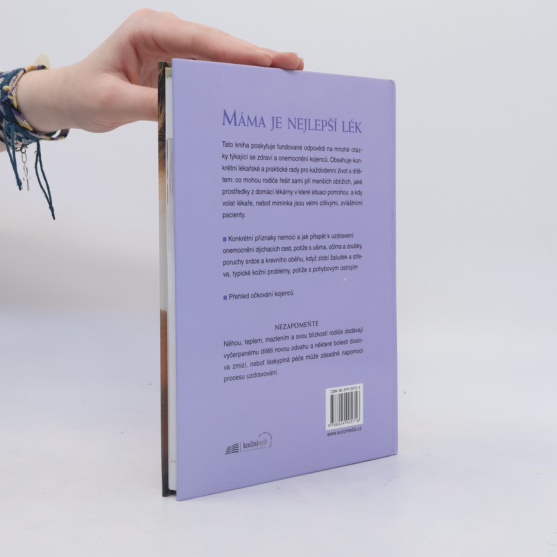 Tato kniha poskytuje fundované odpovědi na mnohé otázky týkající se zdraví a onemocnění kojenců. Obsahuje konkrétní lékařské a praktické rady pro každodenní život s dítětem: co mohou rodiče řešit sami při menších obtížích, které prostředky z domácí lékárny v které situaci pomohou a jsou-li vůbec vhodné, a kdy volat lékaře, neboť miminka jsou velmi citlivými, zvláštními pacienty. - Konkrétní příznaky nemoci a jak napomoci k uzdravení: nemocnění dýchacích cest, potíže s ušima, očima a zuby, poruchy srdce a krevního oběhu, když zlobí žaludek a střeva, typické kožní problémy, potíže s pohybovým ústrojím - Přehled očkování kojenců NEZAPOMEŇTE Něhou, teplem, mazlením a svou blízkostí rodiče dodávají vyčerpanému dítěti novou odvahu a některé bolesti doslova odfouknou, neboť láskyplná péče může zásadně napomoci procesu uzdravování.... celý text