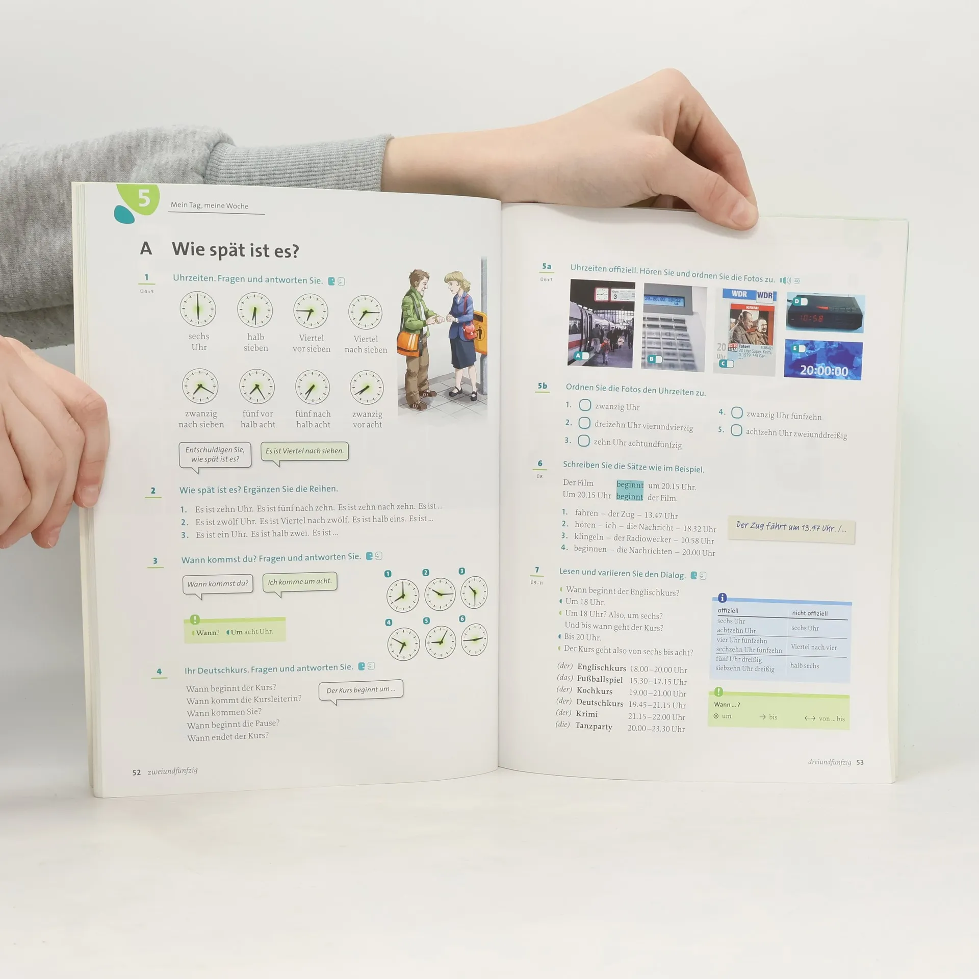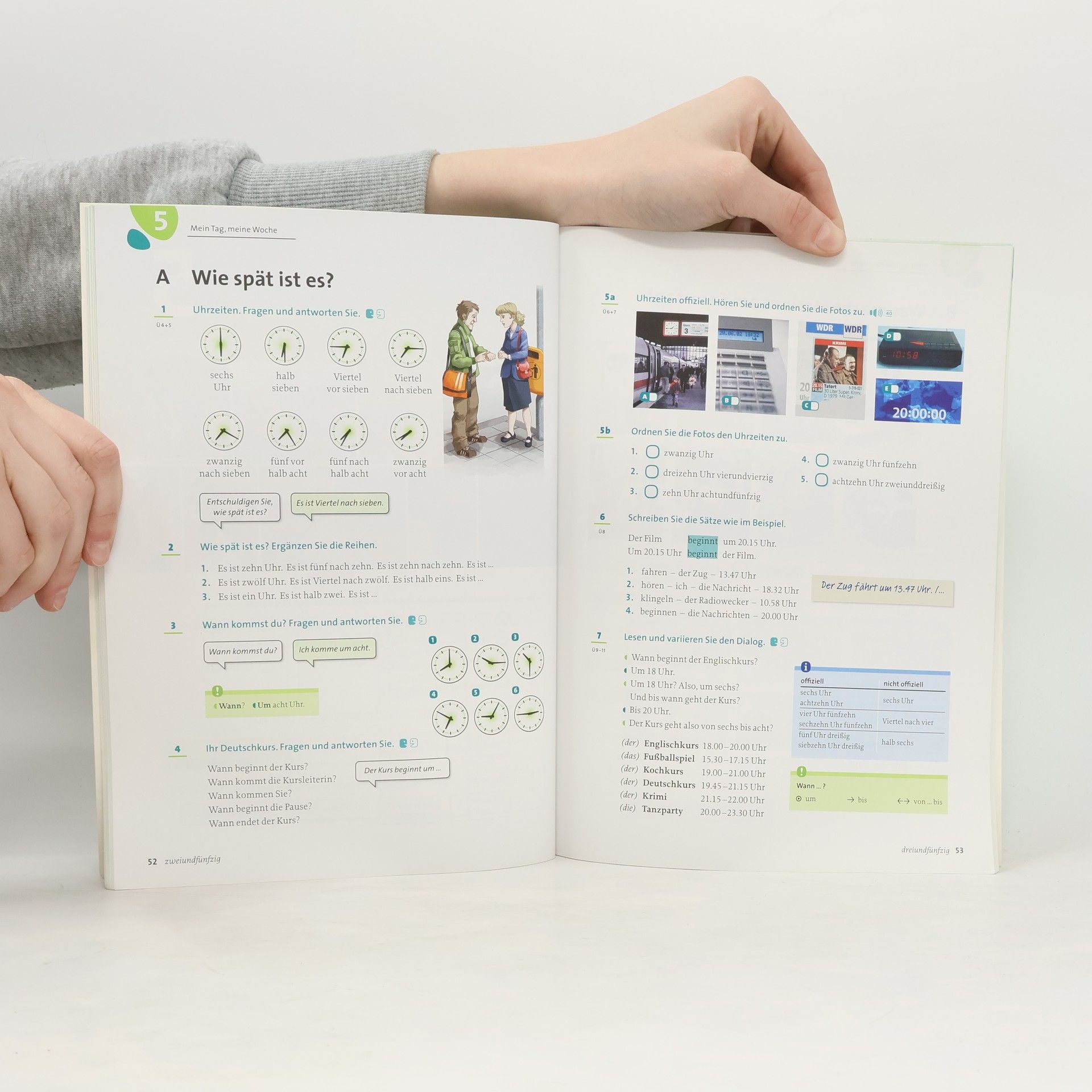 Die KursbücherAlle Lektionen beginnen mit einer großzügig bebilderten Auftaktseite. Am Ende jedes Kapitels stehen zwei Alles-klar!-Seiten zur Selbstevaluation sowie eine Gewusst-wie-Seite: Sie fasst die Redemittel und die grammatischen Strukturen zusammen. Drei Stationen eignen sich zur spielerischen Wiederholung, die vierte Station enthält einen Modelltest. Im Anhang: Phonetikübungen, Grammatikübersicht, alphabetische Wortliste und Bildkarten zu wichtigen Wortfeldern.