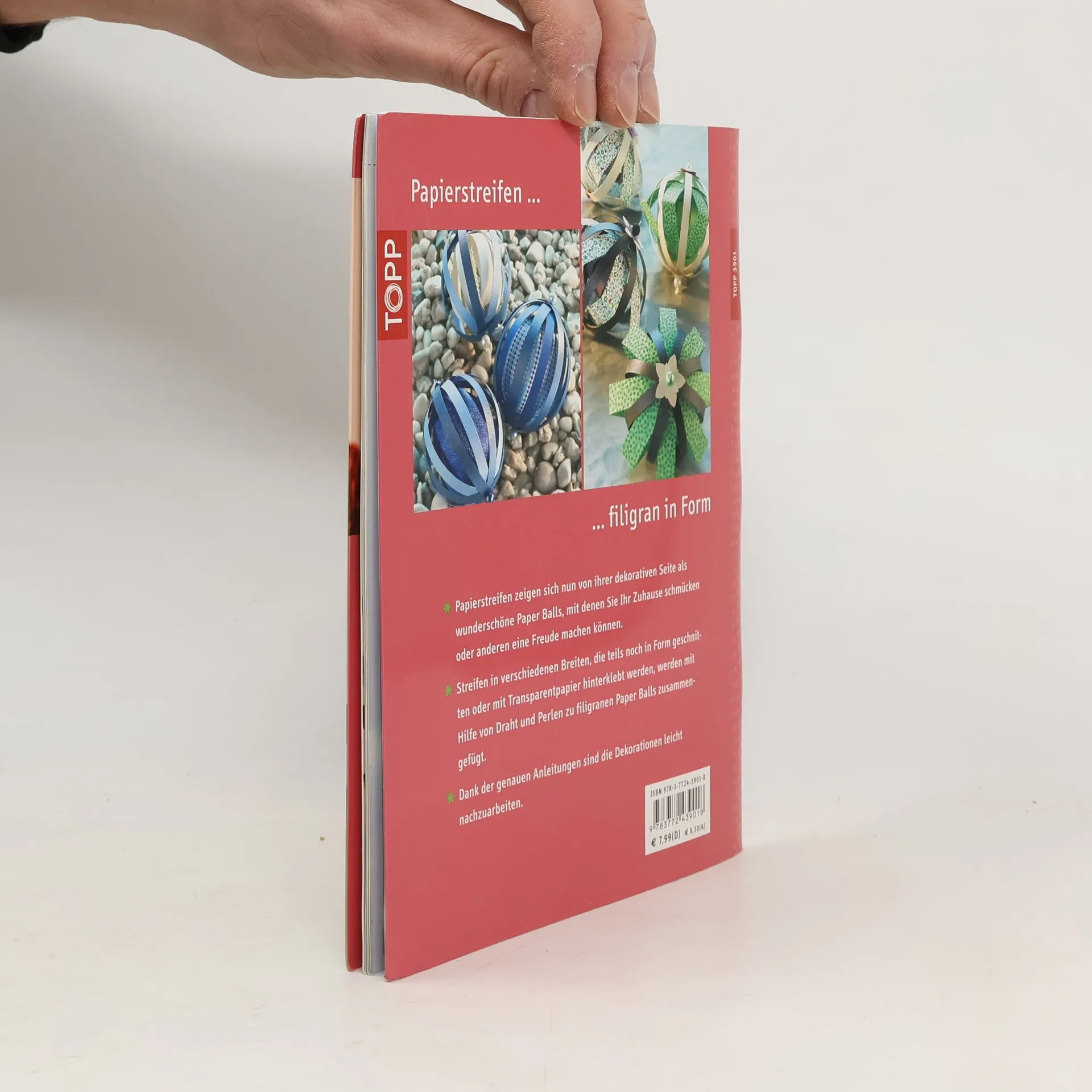 Papierstreifen werden zu plastischen Objekten und wunderschönen filigranen Ornamenten, mit denen Sie Ihr Zuhause schmücken oder anderen eine Freude machen können. Streifen in verschiedenen Breiten, die teils noch in Form geschnitten oder mit Transparentpapier hinterklebt werden, werden mit Hilfe von Draht und Perlen zu filigranen Paper-Balls zusammen- gefügt. Dank der genauen Anleitungen sind die Paper-Balls leicht nachzuarbeiten. 32 Seiten, 17 x 22 cm, Kreativ-Softcover, Umschlagklappen, perforierte Vorlagenbogen, Einsteckhüllen