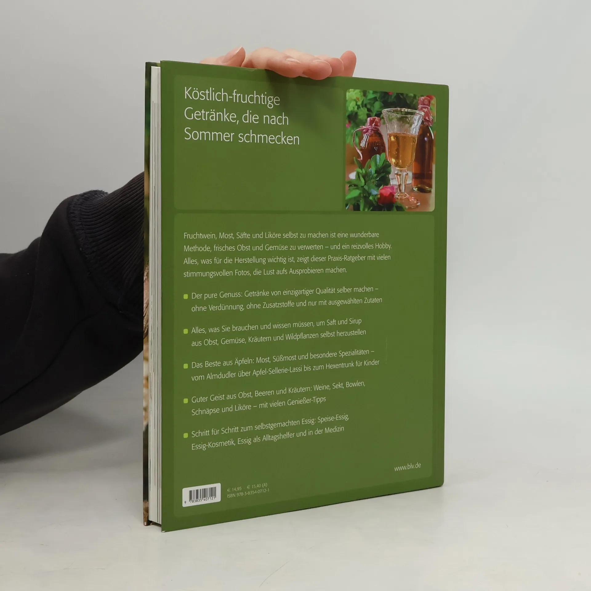 Für die einen ist es eine gute Methode, frisches Obst und Gemüse aus eigenem Anbau zu verwerten. Für die anderen ist es einfach ein reizvolles Hobby. In jedem Fall aber ist es ein köstlicher Genuss! Alles, was für die Herstellung von Getränken wichtig ist, zeigt dieser Praxis-Ratgeber „Fruchtwein, Liköre, Most und Säfte“ (BLV Buchverlag) mit vielen Fotos, die Lust aufs Ausprobieren machen. Es ist der pure Genuss: Getränke von einzigartiger Qualität selbst zu machen – ohne Verdünnung, ohne Zusatzstoffe und nur mit ausgewählten Zutaten. Hier findet man alles, was man dazu braucht und wissen muss, um Saft und Sirup aus Obst, Gemüse, Kräutern und Wildpflanzen selbst herzustellen. Die Rezepte mit vielen Genießer-Tipps zeigen, wie das Beste aus Äpfeln entsteht: Most, Süßmost und besondere Spezialitäten – vom Almdudler über Apfel-Sellerie-Lassi bis zum Hexentrunk für Kinder. Auch ein „guter Geist“ lässt sich aus Obst, Beeren und Kräutern herstellen: Weine, Sekt, Bowlen, Schnäpse und Liköre. Und zum Schluss geht's dann Schritt für Schritt an den selbstgemachten Essig: Speise-Essig, Essig-Kosmetik, Essig als Alltagshelfer und in der Medizin.