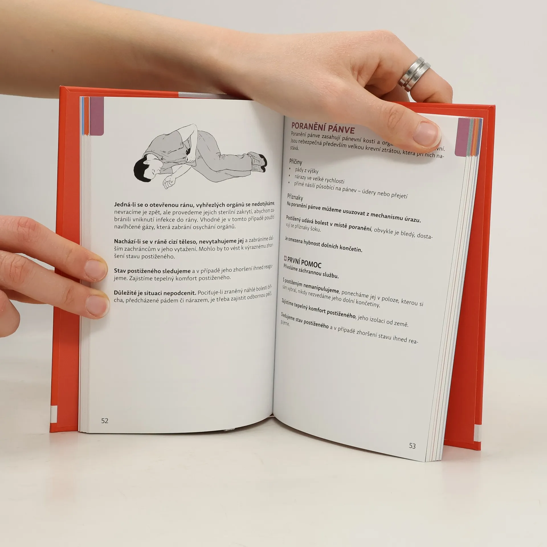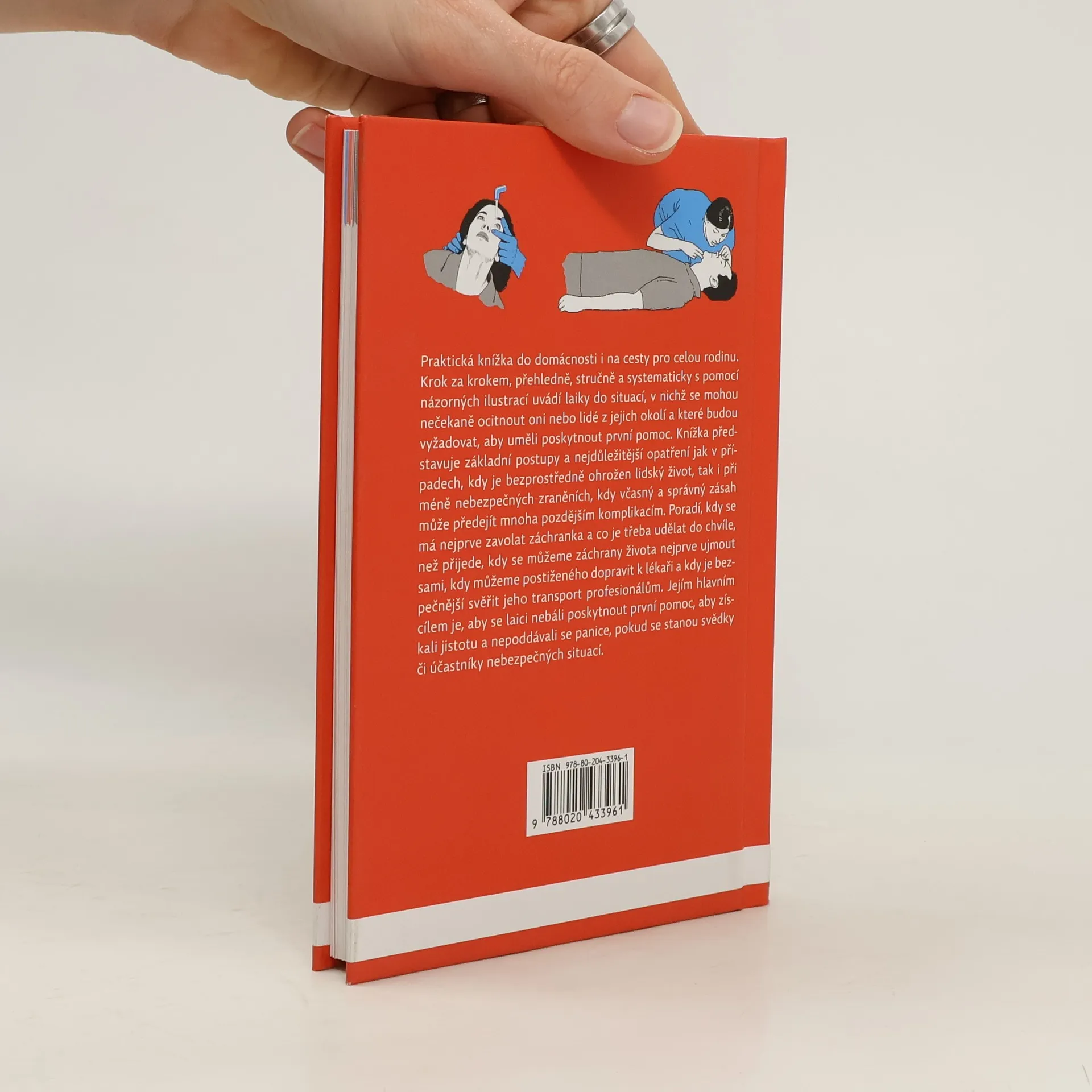Praktická knížka do domácnosti i na cesty pro celou rodinu. Krok za krokem, přehledně, stručně a systematicky s pomocí názorných ilustrací uvádí laiky do situací, v nichž se mohou nečekaně ocitnout oni nebo lidé z jejich okolí a které budou vyžadovat, aby uměli poskytnout první pomoc. Knížka představuje základní postupy a nejdůležitější kroky jak v případech, kdy je bezprostředně ohrožen lidský život, tak i při méně nebezpečných zraněních, kdy včasný a správný zásah může předejít mnoha pozdějším komplikacím. Poradí, kdy se má nejprve zavolat záchranka a co je třeba udělat do chvíle, než přijede, kdy se můžeme záchrany života nejprve ujmout sami, kdy můžeme postiženého dopravit k lékaři a kdy je bezpečnější svěřit jeho transport profesionálům. Jejím hlavním cílem je, aby laici nebáli poskytnout první pomoc, aby získali jistotu a nepoddávali se panice, pokud se stanou svědky nebezpečných situací.