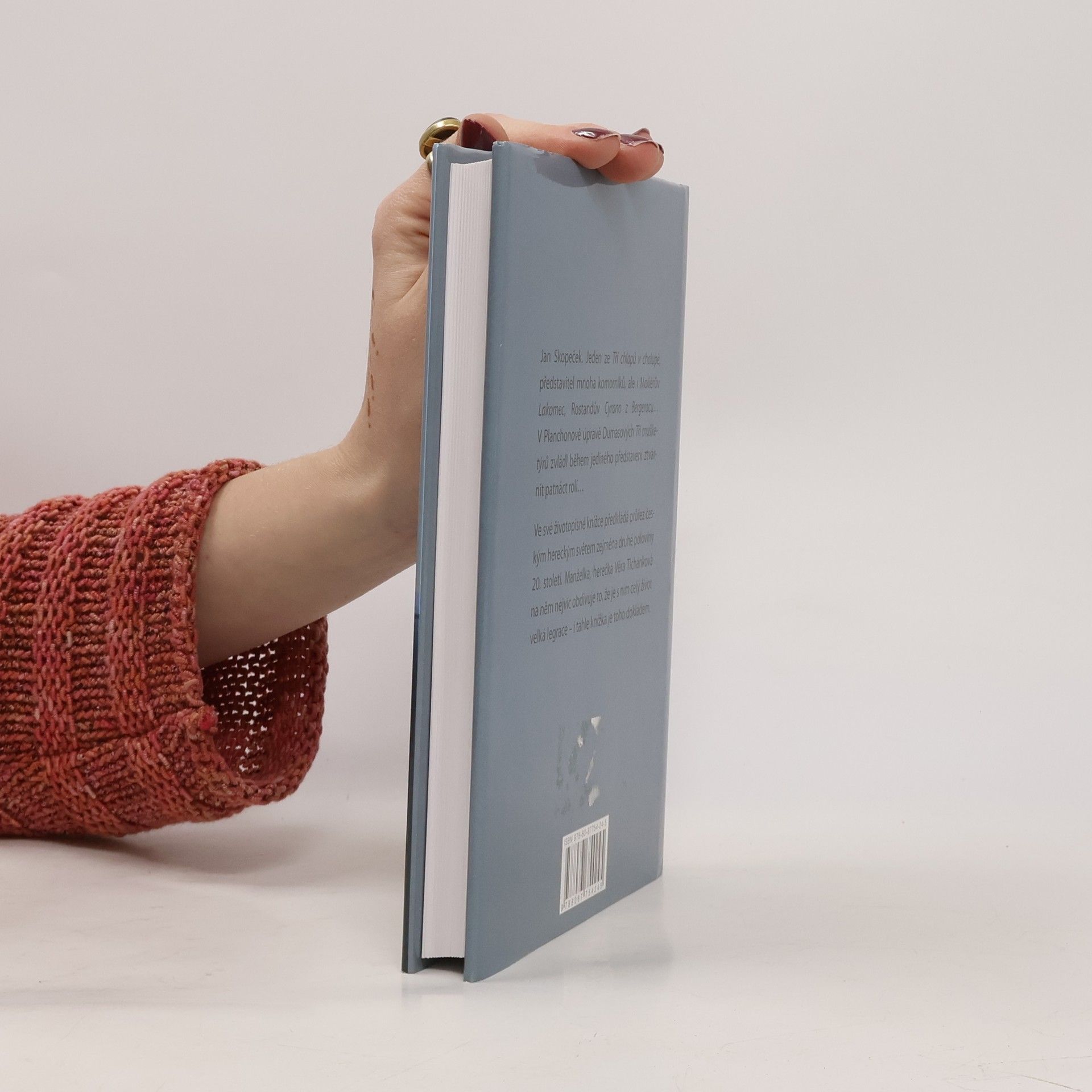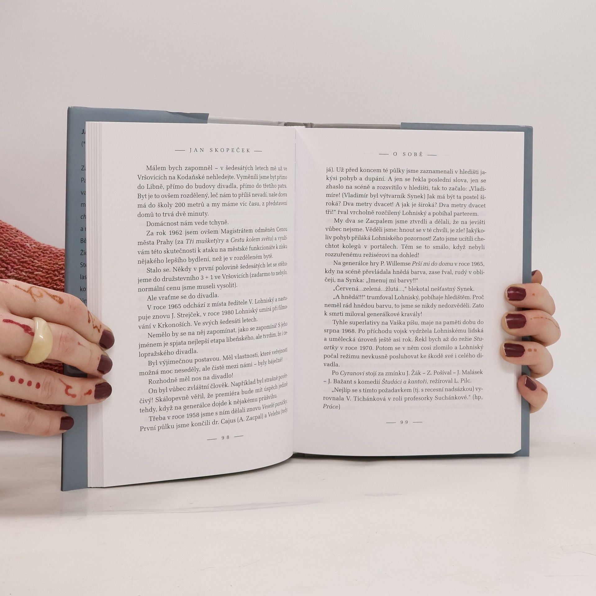 Jan Skopeček. Jeden ze Tří chlapů v chalupě, představitel mnoha komorníků, ale i Molierův Lakomec, Rostandův Cyrano z Bergeracu… V Planchonově úpravě Dumasových Tří mušketýrů zvládl během jediného představení ztvárnit patnáct rolí… Ve své životopisné knížce předkládá průřez českým hereckým světem zejména druhé poloviny 20. století. Manželka, herečka Věra Tichánková na něm nejvíc obdivuje to, že je s ním celý život velká legrace – i tahle knížka je toho dokladem.