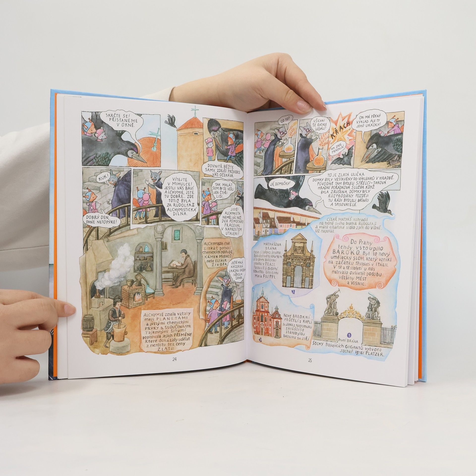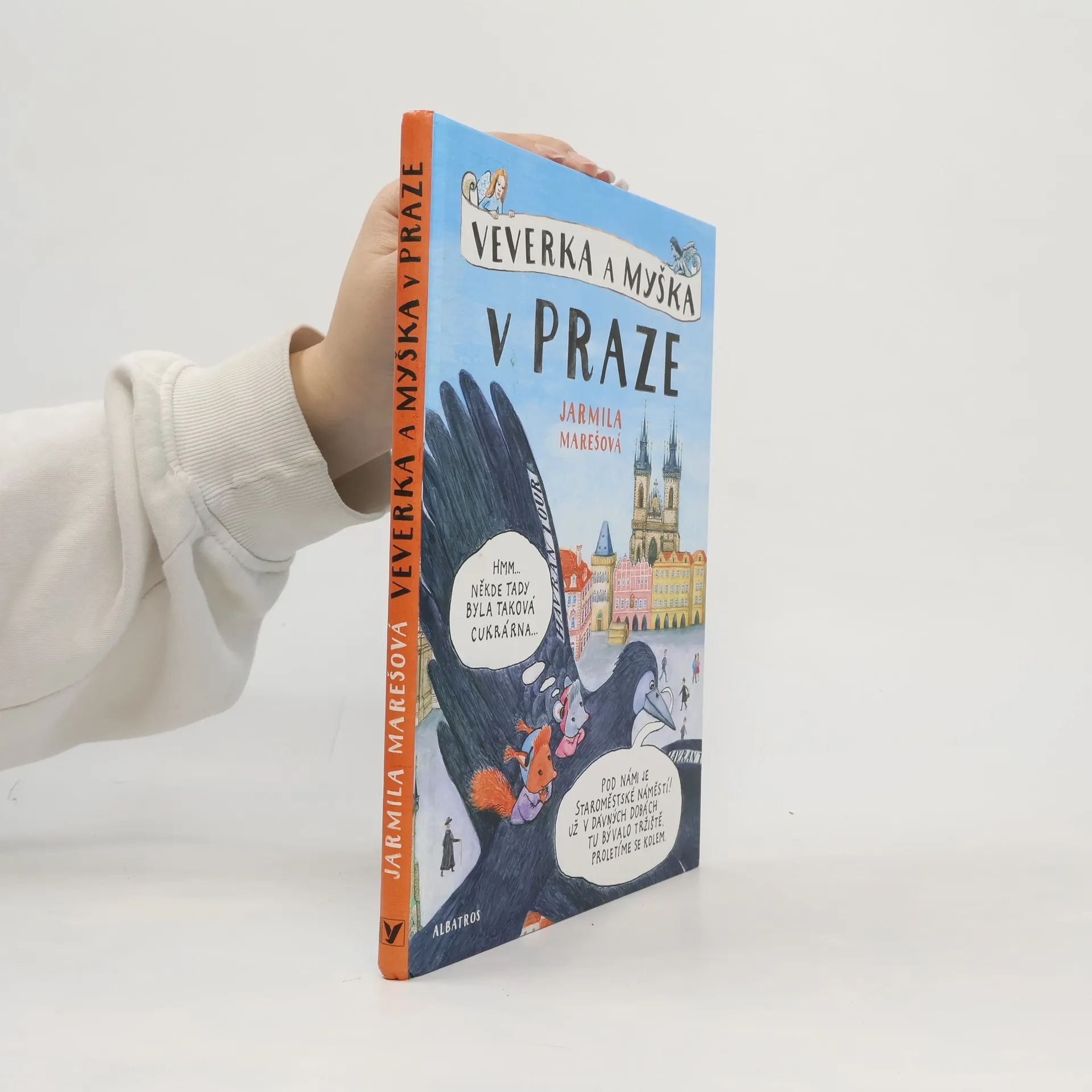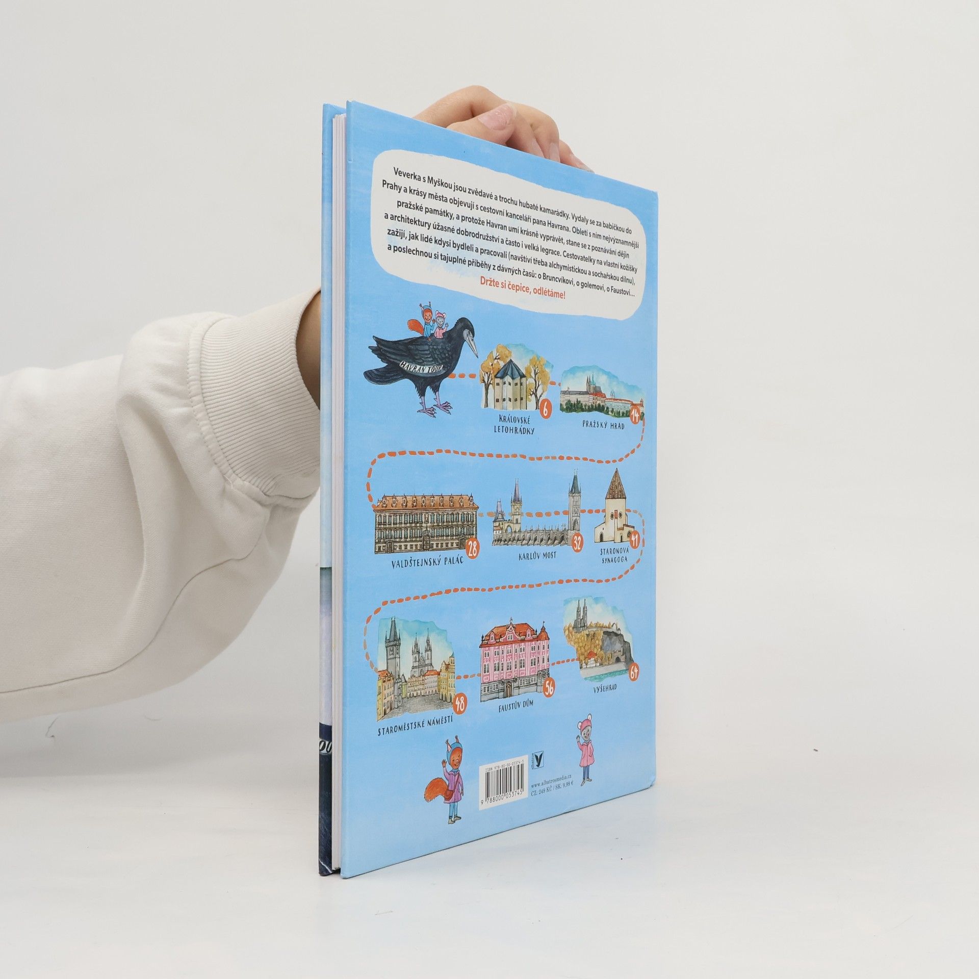 Komiksový průvodce Prahou Veverka s Myškou jsou zvědavé a trochu hubaté kamarádky. Vydaly se za babičkou do Prahy a krásy města objevují s cestovní kanceláří pana Havrana. Obletí s ním nejvýznamnější památky, a protože Havran umí krásně vyprávět, stane se z poznávání dějin úžasné dobrodružství a velká legrace. Cestovatelky na vlastní kožíšky poznají, jak lidé kdysi žili (navštíví třeba alchymistickou dílnu), a poslechnou si i tajuplné pražské legendy. Držte si čepice, odlétáme!
