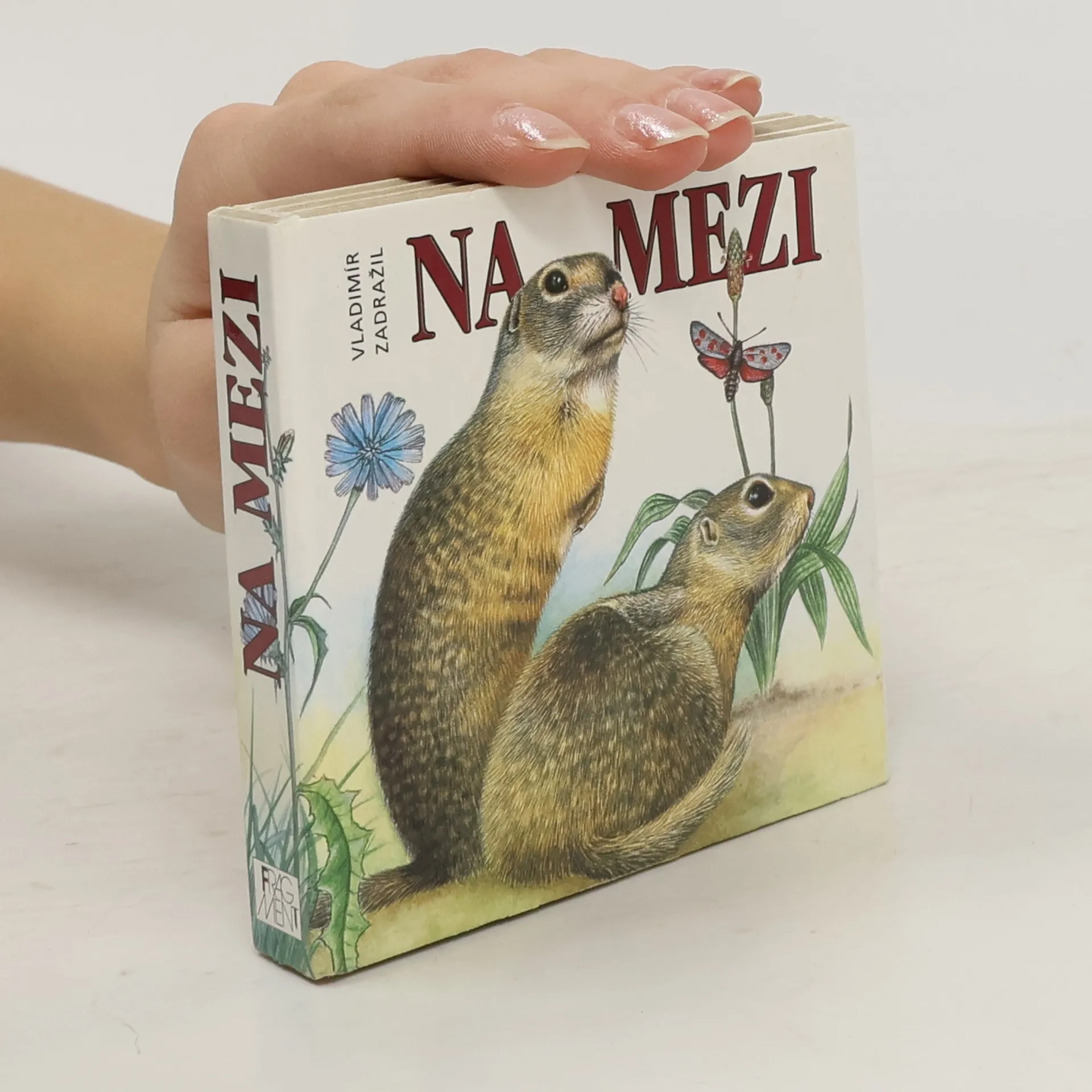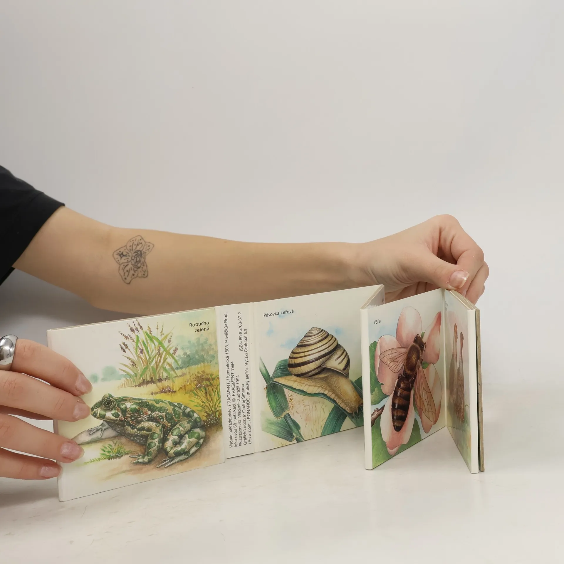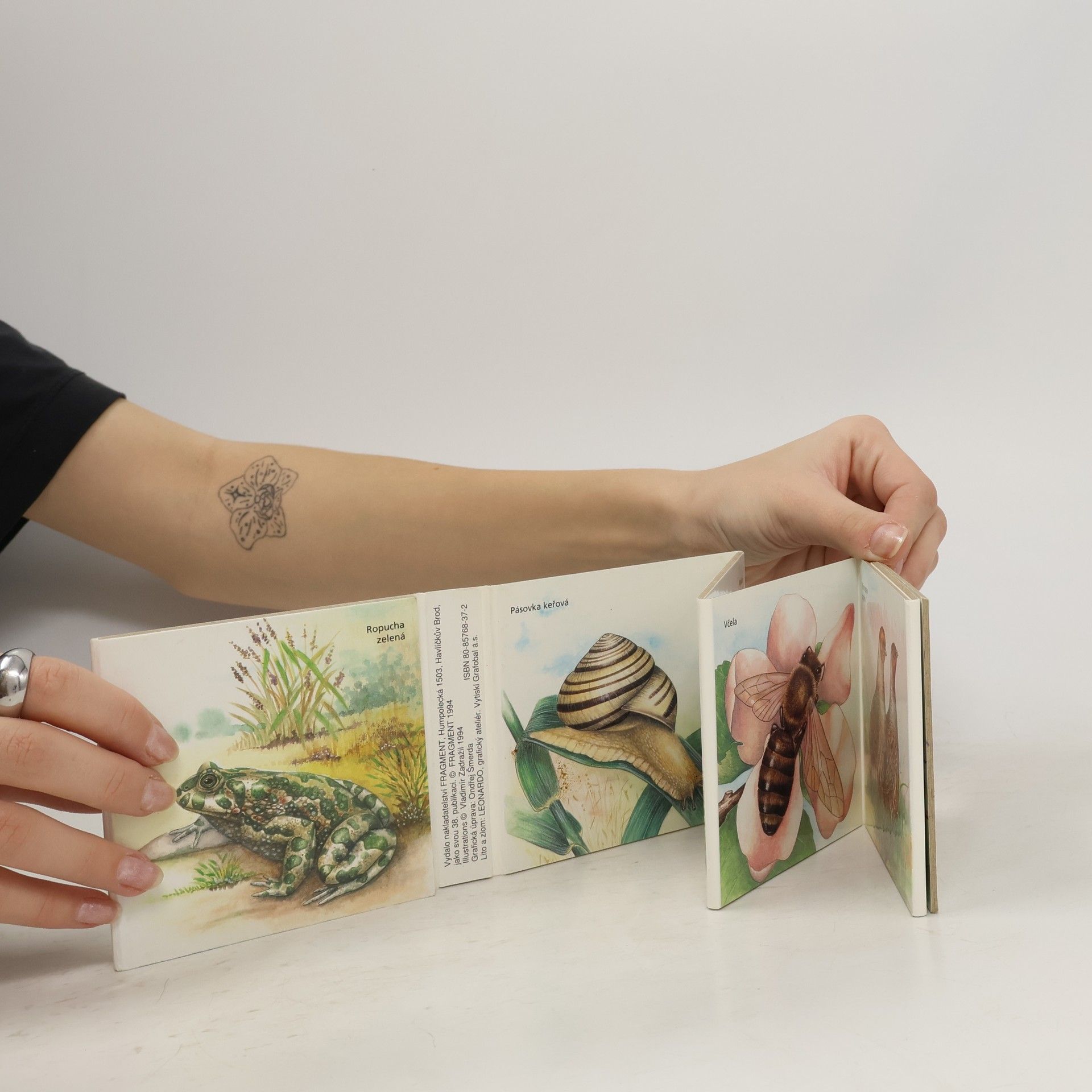 Rozkládací šestnáctiobrázkové leporelo pro nejmenší s obrázky zvířátek, která je možno potkat na louce nebo na mezi.