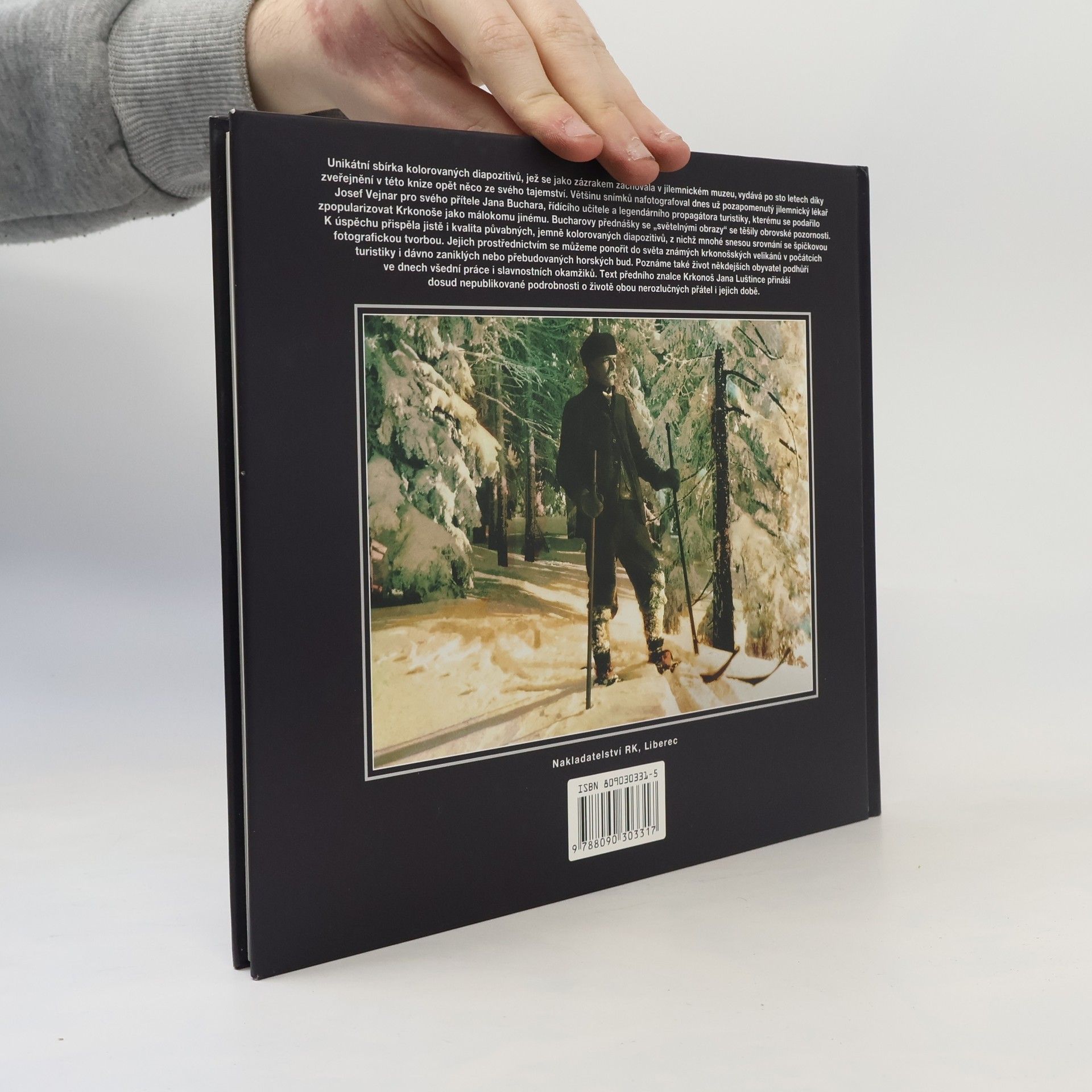 Unikátní sbírka kolorovaných diapozitivů, jež se jako zázrakem zachovala v jilemnickém muzeu, vydává po sto letech díky zveřejnění v této knize opět něco ze svého tajemství. Řídící učitel Jan Buchar, velký propagátor turistiky, uspořádal několik stovek přednášek se "světelnými obrazy", které pro něj nafotografoval dnes pozapomenutý přítel, jilemnický lékař Josef Vejnar. Prostřednictvím půvabných, jemně kolorovaných diapozitivů se před námi rozprostře svět známých krkonošských velikánů, které dobře poznáváme i po sto letech, ale také dávno zaniklých nebo přebudovaných horských bud i dnes již k nepoznání změněných obcí a městeček v údolí pod horami. Nahlédneme také do života někdejších horalů ve dnech všední práce i slavnostních okamžiků. Čtivý a zasvěcený text přináší dosud nepublikované podrobnosti o počátcích české organizované turistiky a lyžování i o životě legendárního propagátora českého severu Jana Buchara a jeho přátel. Knihu napsal přední znalec historie Krkonoš a ředitel muzea v Jilemnici Dr. Jan Luštinec.