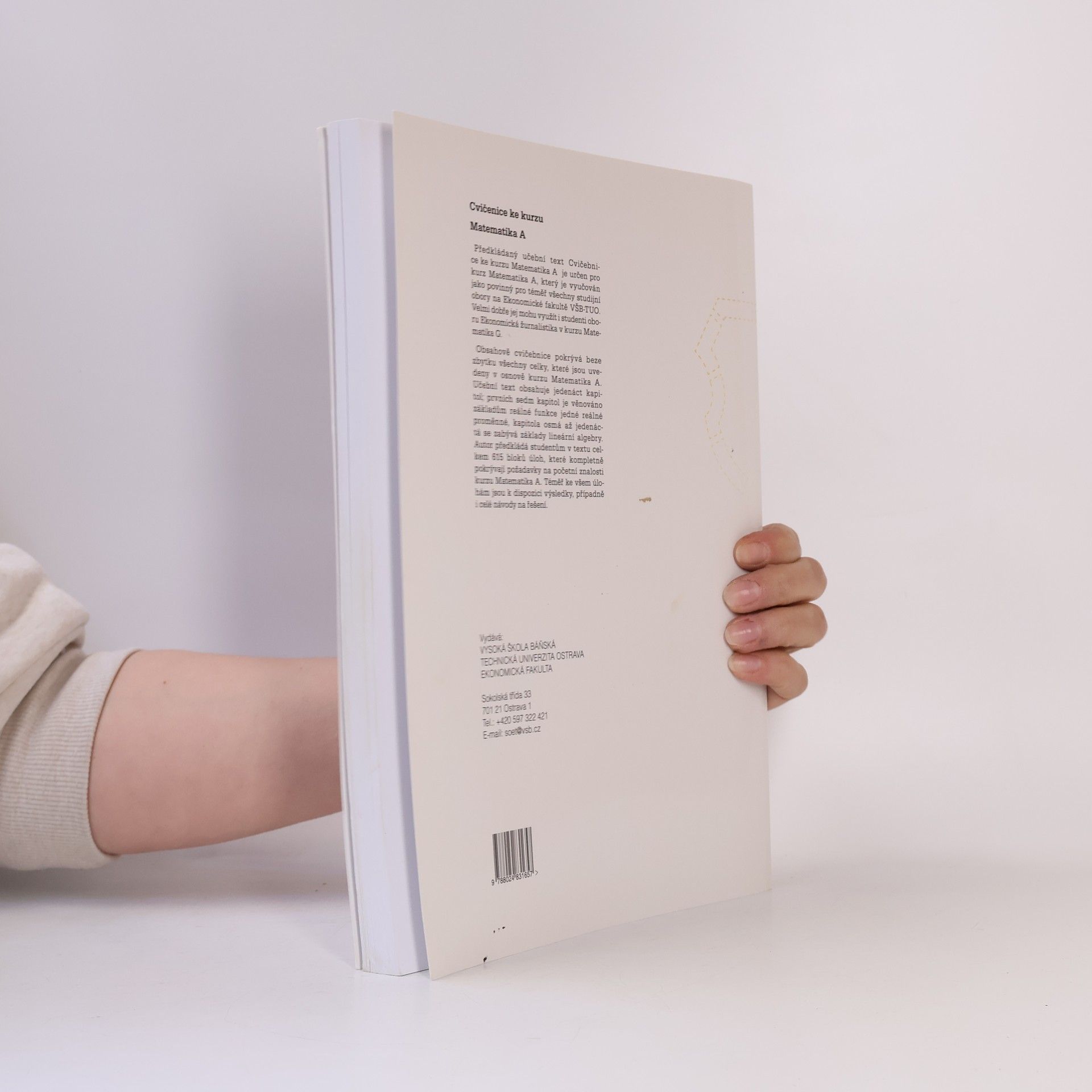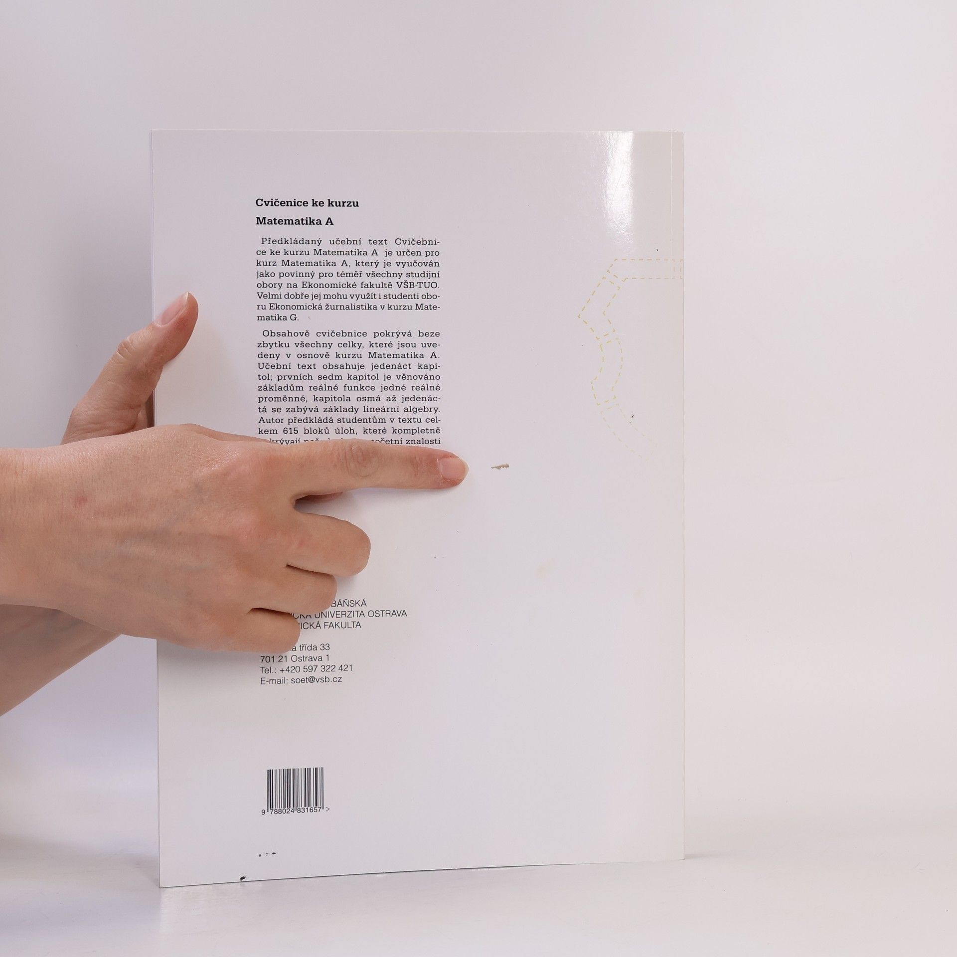 Obsahově cvičebnice pokrývá beze zbytku všechny celky, které jsou uvedeny v osnově kurzu Matematika A na Ekonomické fakultě VŠB - TU Ostrava. Učební text obsahuje jedenáct kapitol: prvních sedm kapitol je věnováno základům reálné funkce jedné reálné proměnné, kapitola osmá až jedenáctá se zabývá základy lineární algebry. Autor předkládá studentům v textu celkem 615 blohů úloh, které kompletně pokrývají požadavky na početní znalosti kurzu Matematika A. Téměř ke všem úlohám jsou k dispozici výsledky, případně i celé návody k řešení.