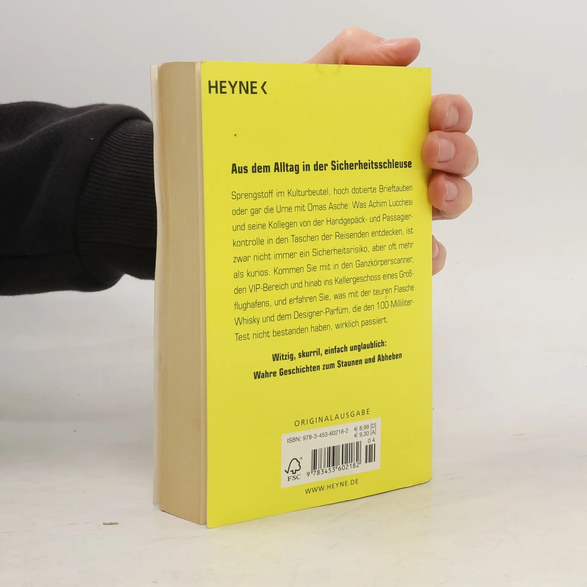 Witzig, skurril, einfach unglaublich – aus dem Alltag in der Sicherheitsschleuse Sprengstoff im Kulturbeutel, hoch dotierte Brieftauben oder gar die Urne mit Omas Asche: Was Achim Lucchesi und seine Kollegen von der Handgepäck- und Passagierkontrolle in den Taschen der Reisenden entdecken, ist zwar nicht immer ein Sicherheitsrisiko, aber oft mehr als kurios. Er nimmt seine Leser mit auf eine Reise in den Ganzkörperscanner, den VIP-Bereich und hinab ins Kellergeschoss eines Großflughafens und erzählt, was mit der teuren Flasche Whisky und dem Fläschchen Designer-Parfüm, die den 100-Milliliter-Test nicht bestanden haben, wirklich passiert. Unglaubliche, aber wahre Geschichten zum Staunen und Abheben.