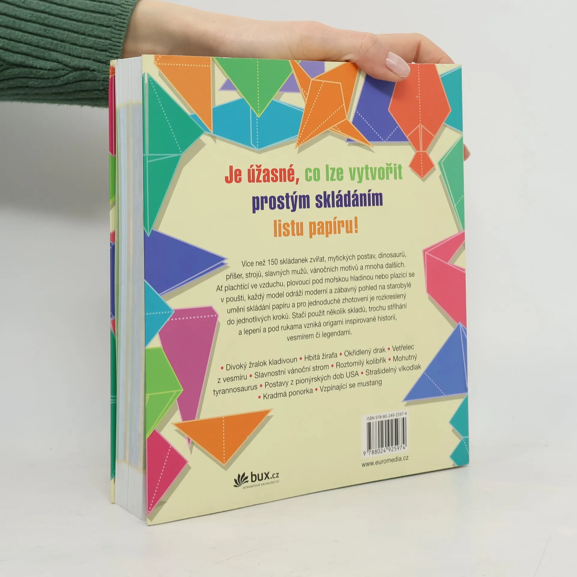 Více než 150 modelů – tolik origami pohromadě, že můžete skládat každý víkendový den a ještě během všech svátků v roce! Drak, žirafa, ponorka, bojový letoun, tančící Elvis, prezident Lincoln, příšera z vesmíru – vyberte si. Kniha ukazuje, jak skládat origami z obyčejných papírů nebo neobvyklých formátů, např. z bankovek. Každý model je rozkreslen po jednotlivých krocích. Ať už plachtící ve vzduchu, plovoucí pod hladinou nebo plazící se v poušti, každý model odráží moderní pohled na starobylé umění skládání papíru.