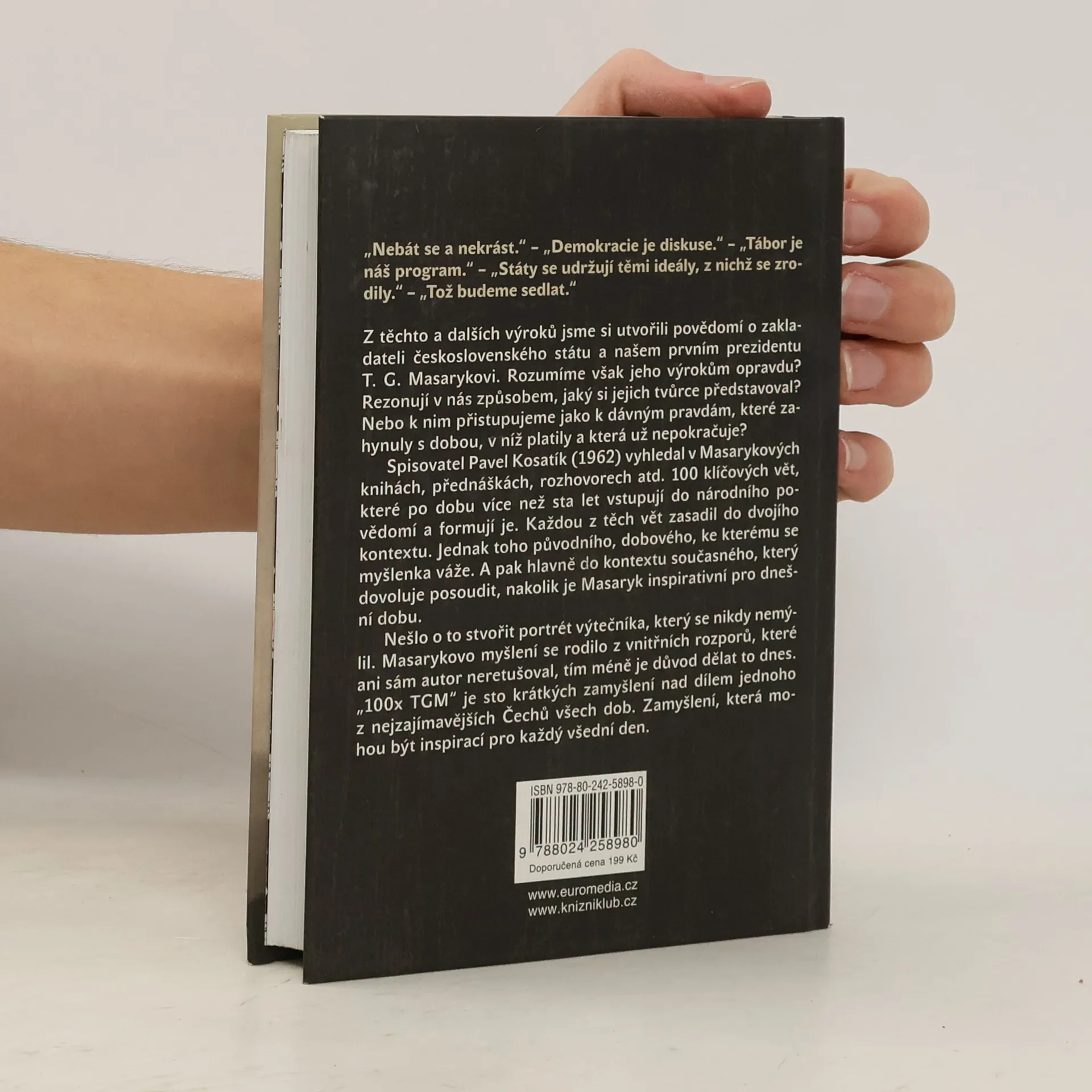 100 moudrých i vtipných, slavných i neznámých, ale vždy zajímavých výroků T. G. Masaryka, které mohou být užitečné a posloužit k zamyšlení i v současnosti. Malá čítanka Masarykových výroků s komentářem a výkladem, která TGM přibližuje dnešním čtenářům.