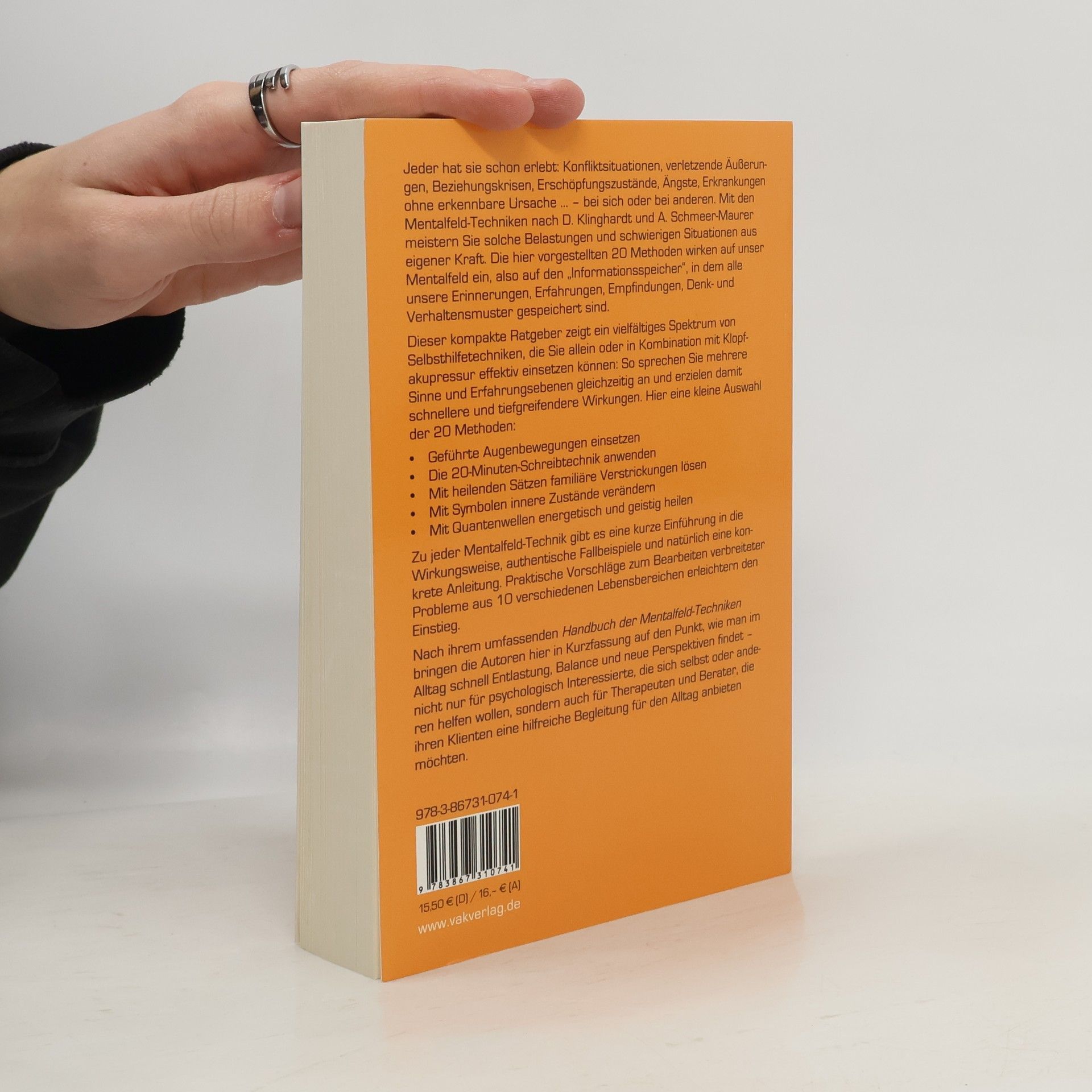 Jeder hat sie schon erlebt: Konfliktsituationen, verletzende Äußerungen, Beziehungskrisen, Erschöpfungszustände, Ängste. – bei sich oder bei anderen. In diesem Buch werden ausgewählte Selbsthilfetechniken mit der bewährten Klopfakupressur kombiniert. Durch das Zusammenwirken wird die Wirkung potenziert: Es werden mehrere Sinne und Erfahrungsebenen gleichzeitig angesprochen und so die heilenden Wirkungen intensiviert und damit noch tiefgreifender und rascher wirksam. Zu jeder Mentalfeld-Technik* gibt es eine allgemein verständliche Einführung in die Wirkungsweise und eine kompakte praktische Anleitung. Psychologisch Interessierte, die sich selbst oder anderen helfen wollen, finden hier leicht anwendbare und sofort nutzbare Techniken. Therapeuten und Berater, Heilpraktiker und Ärzte können den kompakten Überblick ihren Klienten als begleitende Hilfe für zu Hause anbieten. * Das Mentalfeld ist eine Art psychophysiologischer Informationsspeicher, es umfasst unsere Gedanken, Erinnerungen, Sinneseindrücke, unser Gedächtnis. Alle Informationen, alle Erlebnisse, alle Gedanken, alles, was wir je erfahren haben, ist in diesem Feld enthalten.