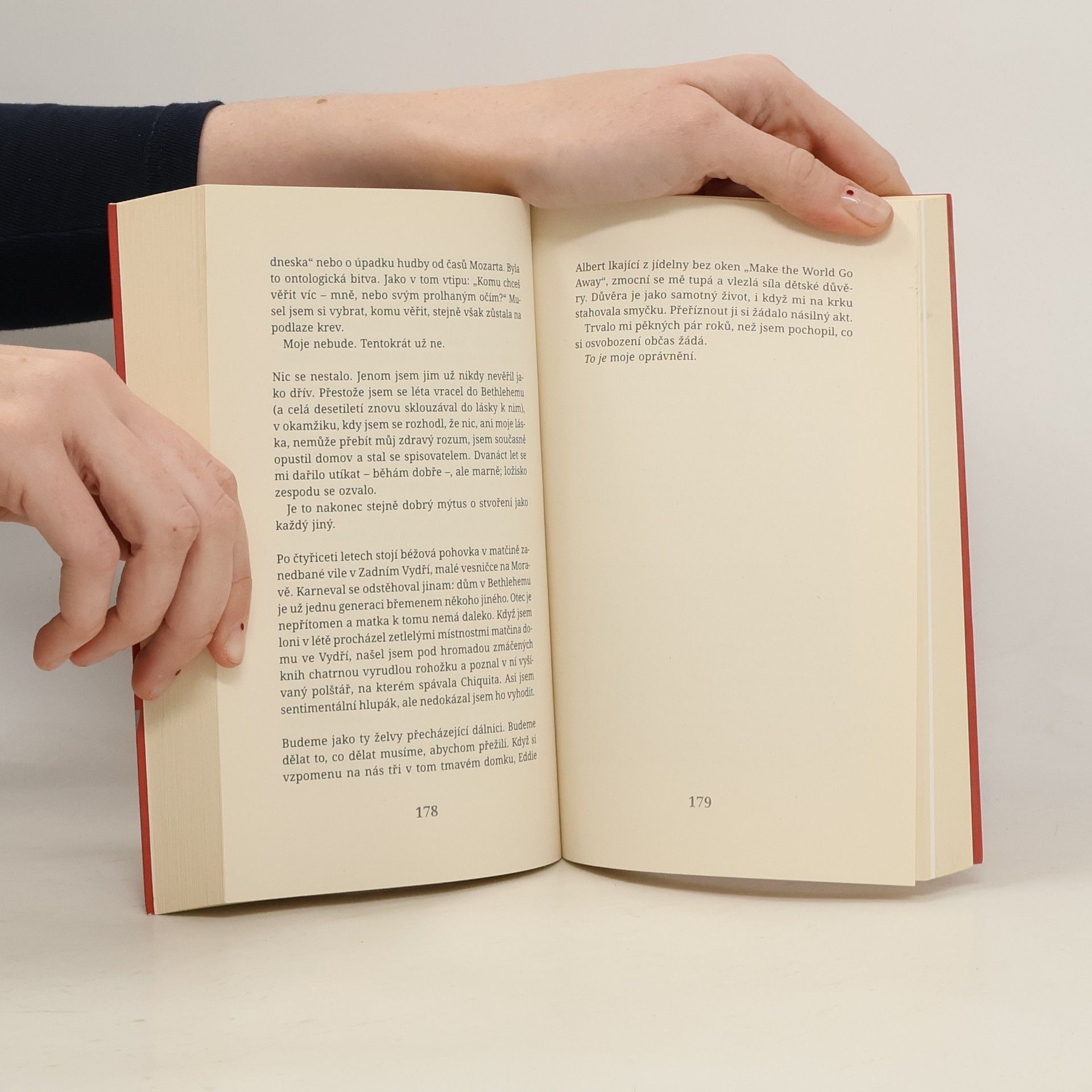 Ve své vzpomínkové próze skládá Mark Slouka, syn českých rodičů, kteří po únorovém puči odešli do Spojených států, spletitou a často pochmurnou mozaiku svého života. Rozhodl se odhalit své nitro, použít psaní jako určitou formu terapie a strhnout závoj z dětských vzpomínek na rodiče. Centrálním bodem memoárů je především jeho matka, která pro mladého chlapce znamenala během dospívání celý svět a po dlouhou dobu byla nejdůležitější osobou jeho života. Jak stárnul, jeho vztah k ní se proměňoval a právě tuto ambivalenci, toto přelévání mezi láskou a nenávistí, autor pozoruhodným způsobem vykresluje a vyrovnává se tak s traumaty, jež ho provázela až do dospělosti. Slouka ve své próze citlivě, avšak nanejvýš pravdivě zaznamenal křehkost vztahu mezi matkou a jejím synem, nesnáze dospívání a často složitý život emigrantů v cizí zemi.