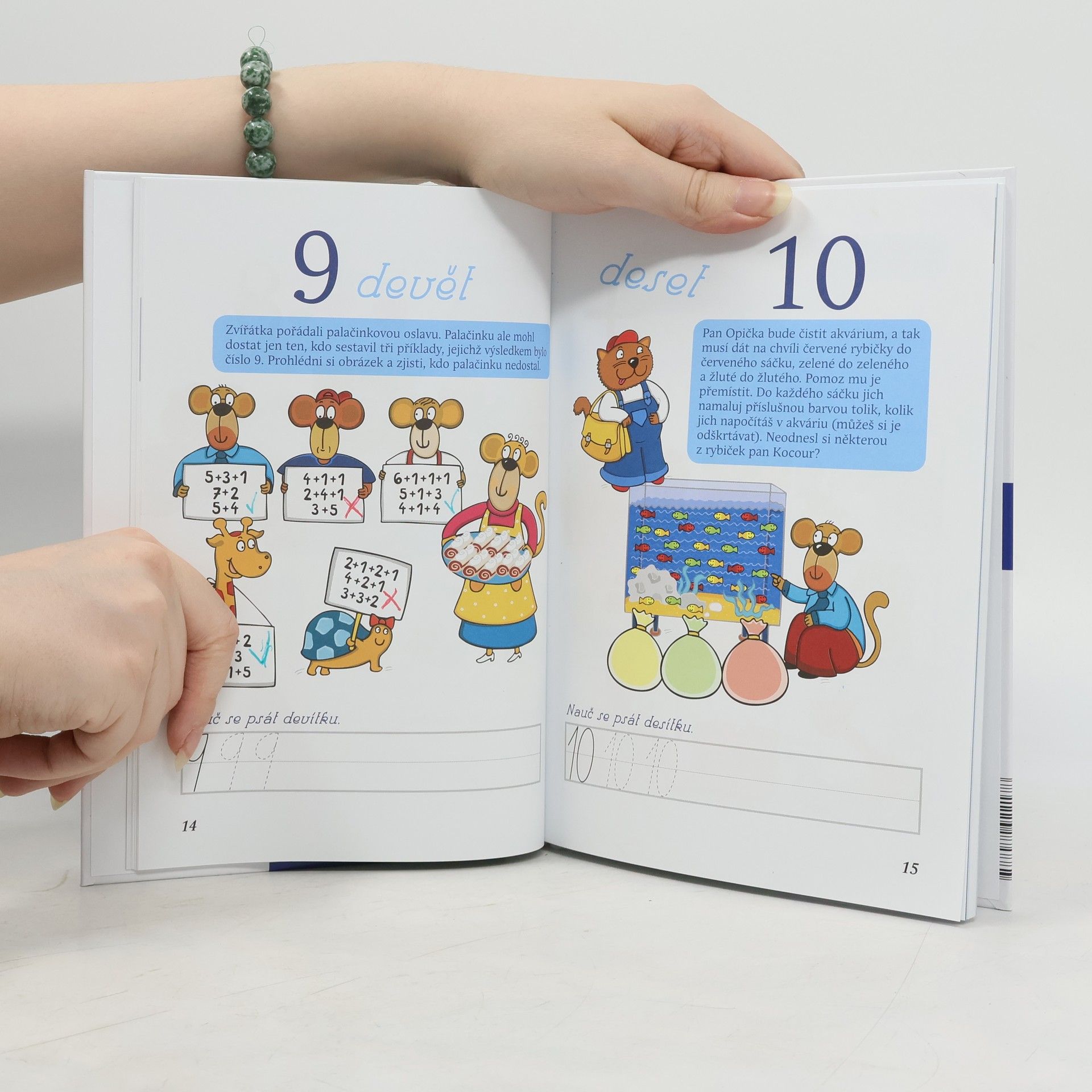 Kniha učí příjemným způsobem poznat základní číslice od 1 do 10, nácvik psaní číslic a úkoly s procvičováním