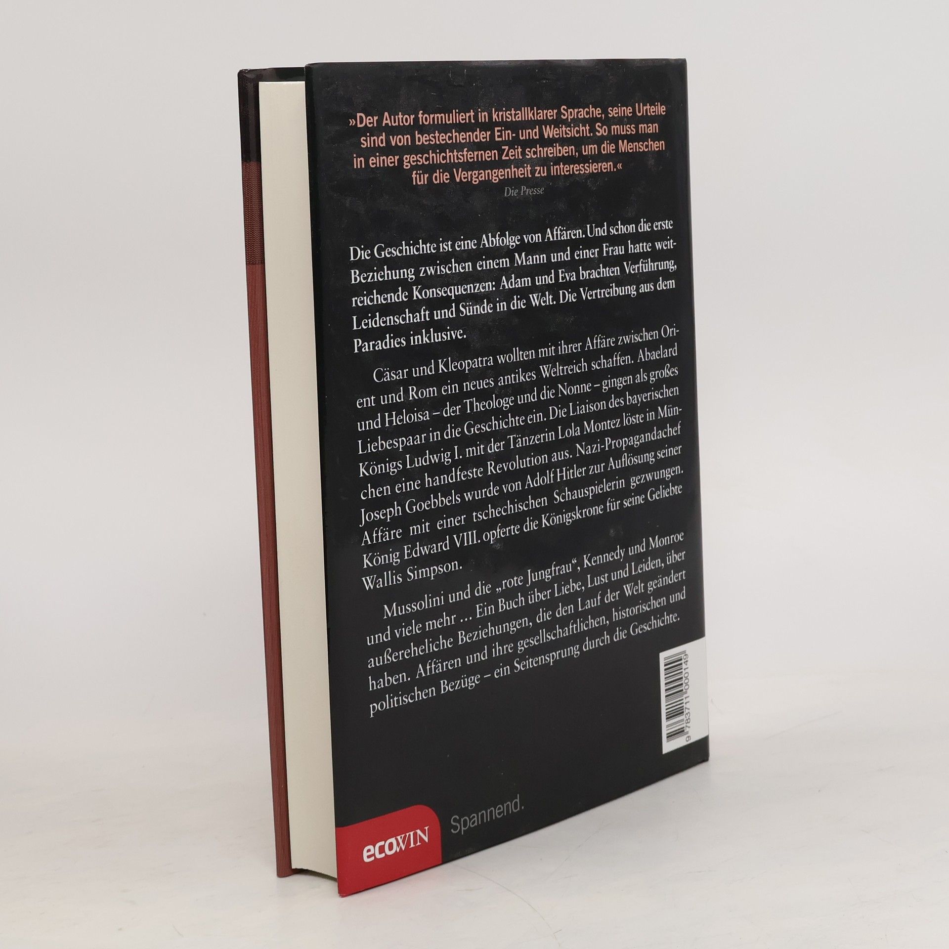 Die Geschichte ist eine Abfolge von Affären. Und schon die erste Beziehung zwischen einem Mann und einer Frau hatte weitreichende Konsequenzen: Adam und Eva brachten Verführung, Leidenschaft und Sünde in die Welt. Die Vertreibung aus dem Paradies inklusive. Wäre Geschichte, wären Mythen, Künste ohne Leidenschaft und ohne Leiden denkbar? Wie stark und mächtig ist ein Gefühl, das den Verstand ausschaltet, die Vorsicht außer Kraft setzt, das Königskronen aufs Spiel setzt und für Momente der Lust den Tod riskiert? Cäsar und Cleopatra wollten mit ihrer Affäre zwischen Orient und Rom ein neues antikes Weltreich schaffen. Abälard und Heloise. Die Nonne und der Theologe gingen als großes Liebespaar in die Geschichte ein. Elizabeth I., „jungfräuliche“ Königin von England, steht gar in Verdacht die Ehefrau ihres Geliebten ermordet zu haben. Nazi-Propagandachef Joseph Goebbels wurde von Adolf Hitler zur Auflösung seiner Affäre mit einer tschechischen Schauspielerin gezwungen. über die sexuellen Eskapaden des britischen Ministers Profumo stolperte Londons Regierung. Ein Buch über außereheliche Beziehungen, die Geschichte gemacht haben: Affären und ihre gesellschaftlichen, historischen und politischen Bezüge. Affären, die Geschichte – und Geschichten– machten.