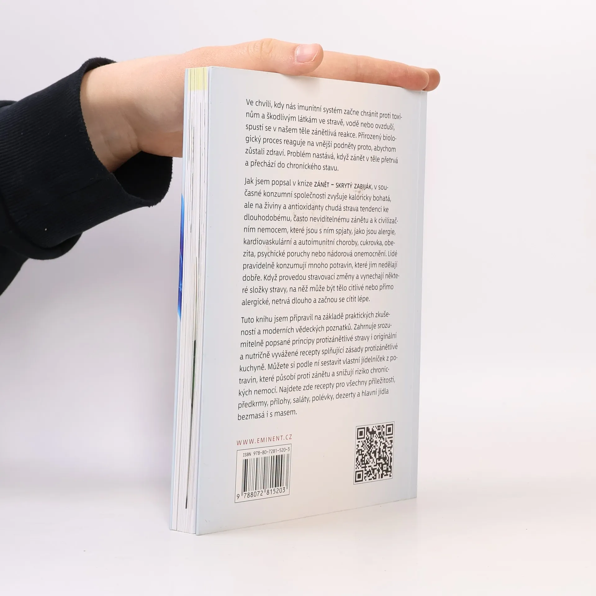 Ve chvíli, kdy nás imunitní systém začne chránit proti toxinům a škodlivým látkám ve stravě, vodě nebo ovzduší, spustí se v našem těle zánět. Jako přirozený biologický proces reaguje na vnější podněty proto, abychom zůstali zdraví. Problém nastává tehdy, když v těle přetrvává a přechází do chronického stavu. Jak autor popsal ve své knize Zánět - skrytý zabiják, zvyšuje kaloricky bohatá, na živiny a antioxidanty chudá strava v současné konzumní společnosti tendenci k dlouhodobému a často neviditelnému zánětu a s ním spojených civilizačních nemocí, jako jsou alergie, autoimunitní nemoci, cukrovka, obezita, srdečněcévní nemoci, psychické poruchy nebo nádorová onemocnění. Lidé pravidelně konzumují mnoho potravin, které jim nedělají dobře. Po provedení stravovacích změn a vynechání některých druhů, na které může tělo být citlivé nebo přímo alergické, zpravidla netrvá dlouho a začnou se cítit lépe. Tuto knihu jsem autor připravoval na základě praktických zkušeností a moderních vědeckých poznatků. Zahrnuje srozumitelně popsané principy protizánětlivé stravy i originální a nutričně vyvážené recepty splňující zásady protizánětlivé stravy. Je návodem, který vám pomůže sestavit si vlastní jídelníček z potravin, které působí protizánětlivě a snižují riziko chronických nemocí. Najdete zde recepty pro všechny příležitosti, předkrmy, přílohy, saláty, polévky, hlavní jídla bezmasá i s masem a dezerty.