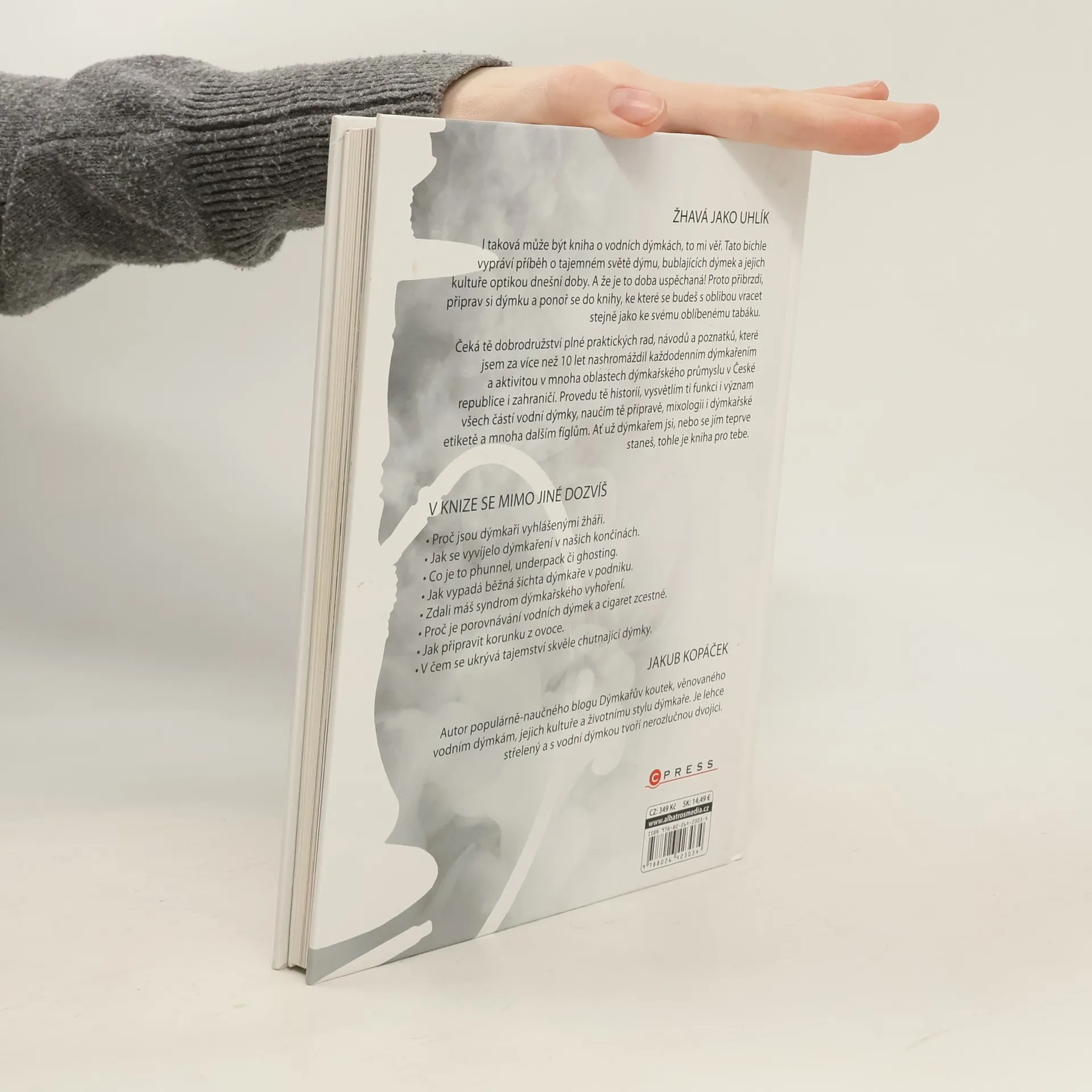 ŽHAVÁ JAKO UHLÍK I taková může být kniha o vodních dýmkách, to mi věř. Tato bichle vypráví příběh o tajemném světě dýmu, bublajících dýmek a jejich kultuře optikou dnešní doby. A že je to doba uspěchaná! Proto přibrzdi, připrav si dýmku a ponoř se do knihy, ke které se budeš s oblibou vracet stejně, jako ke svému oblíbenému tabáku. Čeká tě dobrodružství plné praktických rad, návodů a poznatků, které jsem za více než 10 let nashromáždil každodenním dýmkařením a aktivitou v mnoha oblastech dýmkařského průmyslu v České republice i zahraničí. Provedu tě historií, vysvětlím ti funkci i význam všech částí vodní dýmky, naučím tě přípravě, mixologii i dýmkařské etiketě a mnoha dalším fíglům. Ať už dýmkařem jsi, nebo se jím teprve staneš, tohle je kniha pro tebe. V KNIZE SE MIMO JINÉ DOZVÍŠ • Proč jsou dýmkaři vyhlášenými žháři. • Jak se vyvíjelo dýmkaření v našich končinách. • Co je to phunnel, underpack či ghosting. • Jak vypadá běžná šichta dýmkaře v podniku. • Zdali máš syndrom dýmkařského vyhoření. • Proč je porovnávání vodních dýmek a cigaret zcestné. • Jak připravit korunku z ovoce. • V čem se ukrývá tajemství skvěle chutnající dýmky. JAKUB KOPÁČEK Autor populárně-naučného blogu Dýmkařův koutek věnovaného vodním dýmkám, jejich kultuře a životnímu stylu dýmkaře. Je lehce střelený a s vodní dýmkou tvoří nerozlučnou dvojici.