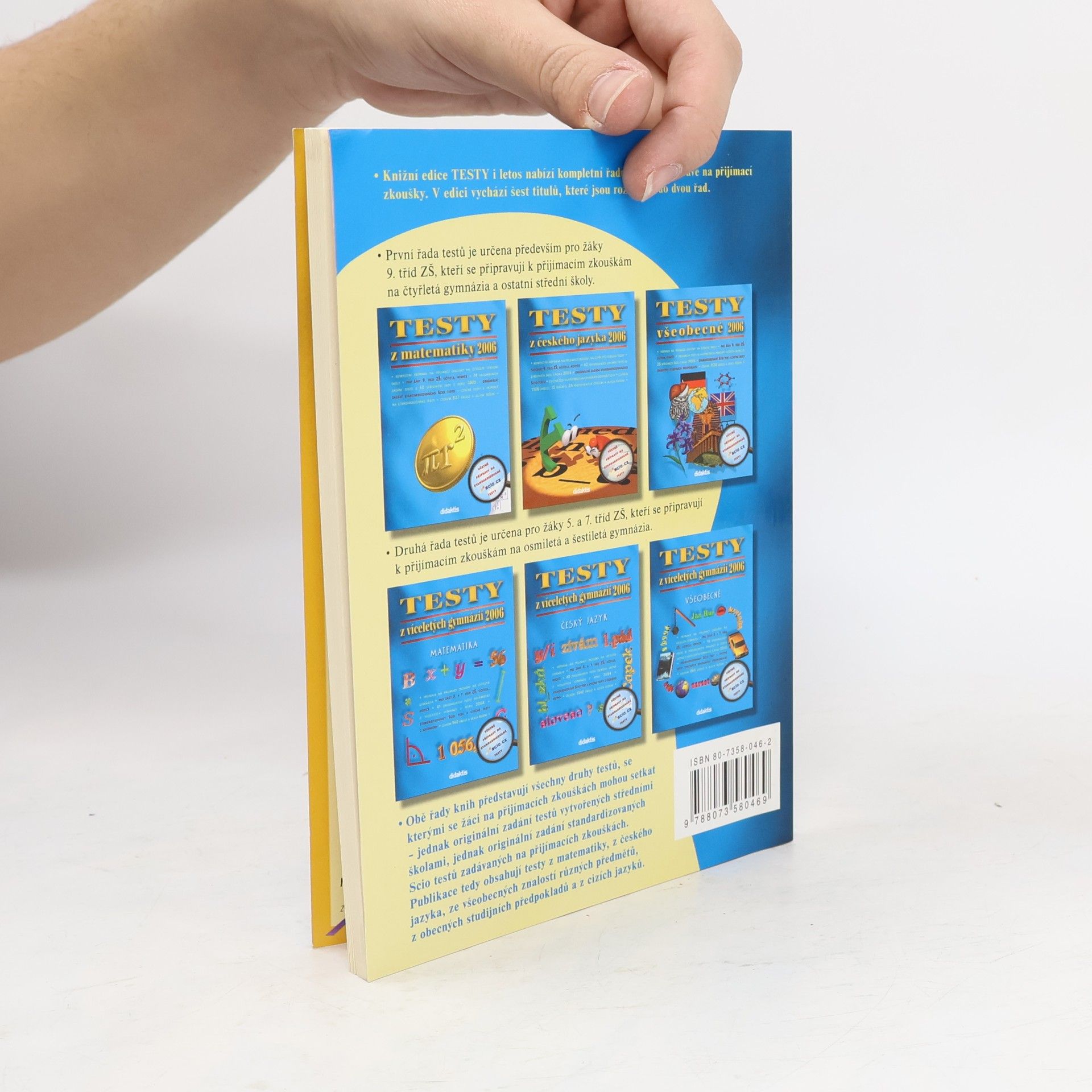 Originální zadání testů ze všeobecných znalostí, cizích jazyků a jiných předmětů zadaných na přijímacích zkouškách na víceletá gymnázia v roce 2005 v ČR. Originální zadání standardizovaného Scio testu z obecných studijních předpokladů zadaného na přijímacích zkouškách na víceletá gymnázia v ČR. Cvičné modelové testy k přípravě na standardizované testy. Aktuální rejstřík škol, řešení všech testů a originální hodnocení. Určeno všem žákům 5.a 7. tříd připravujícím se na přijímací zkoušky na víceletá gymnázia, jejich učitelům a rodičům. Vhodné ke skupinové přípravě ve třídě i k samostatné práci doma.