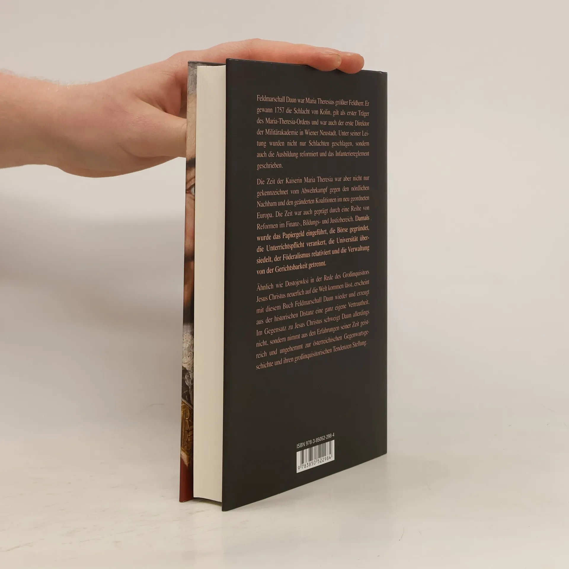 Feldmarschall Daun war Maria Theresias größter Feldherr. Er gewann 1757 die Schlacht von Kolin, gilt als erster Träger des Maria-Theresia-Ordens und war auch der erste Direktor der Militärakademie in Wiener Neustadt. Unter seiner Leitung wurden nicht nur Schlachten geschlagen, sondern auch die Ausbildung reformiert und das Infanteriereglement geschrieben. Die Zeit der Kaiserin Maria Theresia war aber nicht nur gekennzeichnet vom Abwehrkampf gegen den nördlichen Nachbarn und den geänderten Koalitionen im neu geordneten Europa. Die Zeit war auch geprägt durch eine Reihe von Reformen im Finanz-, Bildungs- und Justizbereich. Damals wurde das Papiergeld eingeführt, die Börse gegründet, die Unterrichtspflicht eingeführt, die Universität übersiedelt, der Föderalismus relativiert und die Verwaltung von der Gerichtsbarkeit getrennt.Ähnlich wie Dostojewksi in der Rede des Großinquisitors Jesus Christus neuerlich auf die Welt kommen lässt, erscheint mit diesem Buch Feldmarschall Daun wieder und erzeugt aus der historischen Distanz eine ganz eigene Vertrautheit. Im Gegensatz zu Jesus Christus schweigt Daun allerdings nicht, sondern nimmt aus den Erfahrungen seiner Zeit geistreich und ungehemmt zur österreichischen Gegenwartsgeschichte und ihren großinquisitorischen Tendenzen Stellung.
