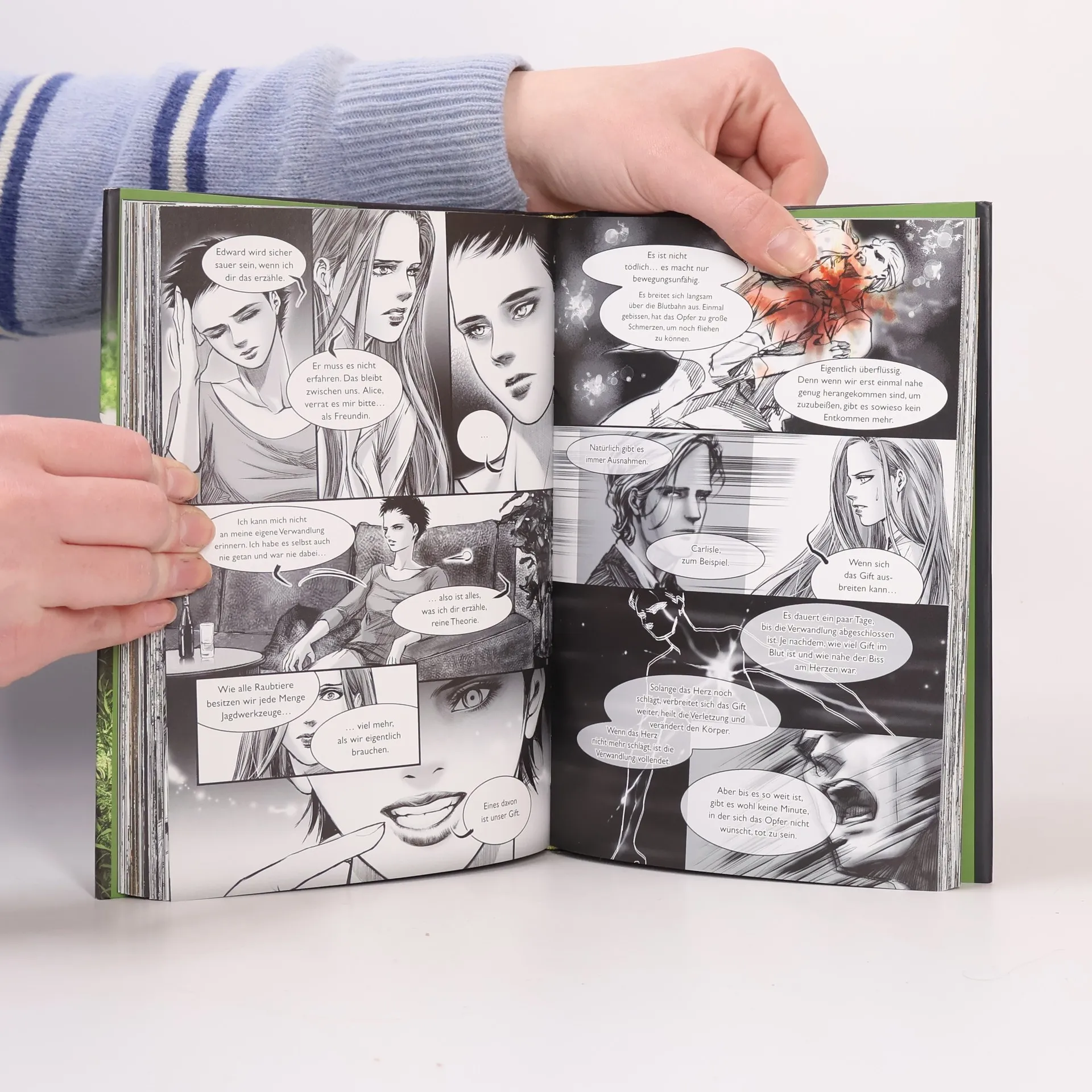 In "Twilight: Biss zum Morgengrauen - der Comic" verwandelte die koreanische Zeichnerin Young Kim Stephenie Meyers Worte in eine packende Comicgeschichte, die in stimmungsvollen Bildern von Bellas und Edwards Leben in Forks erzählt. Mit Romantik oder gar Leidenschaft hätte Bella ihren Umzug nach Forks, einer langweiligen, ständig verregneten Kleinstadt in Washington State, kaum in Verbindung gebracht. Bis sie den geheimnisvollen und attraktiven Edward kennen lernt. Er fasziniert sie, obwohl irgendetwas mit ihm nicht zu stimmen scheint. So gut aussehend und stark wie er kann kein gewöhnlicher Mensch sein. Aber was ist er dann? Die Geschichte einer verbotenen Liebe, einer Liebe gegen alle Vernunft. Die so viele Hindernisse überwinden muss, dass man auf jeder Seite mitfiebert. So romantisch und spannend, dass dem Leser bei diesem wunderschön geschriebenen Buch eine Gänsehaut über den Rücken läuft.