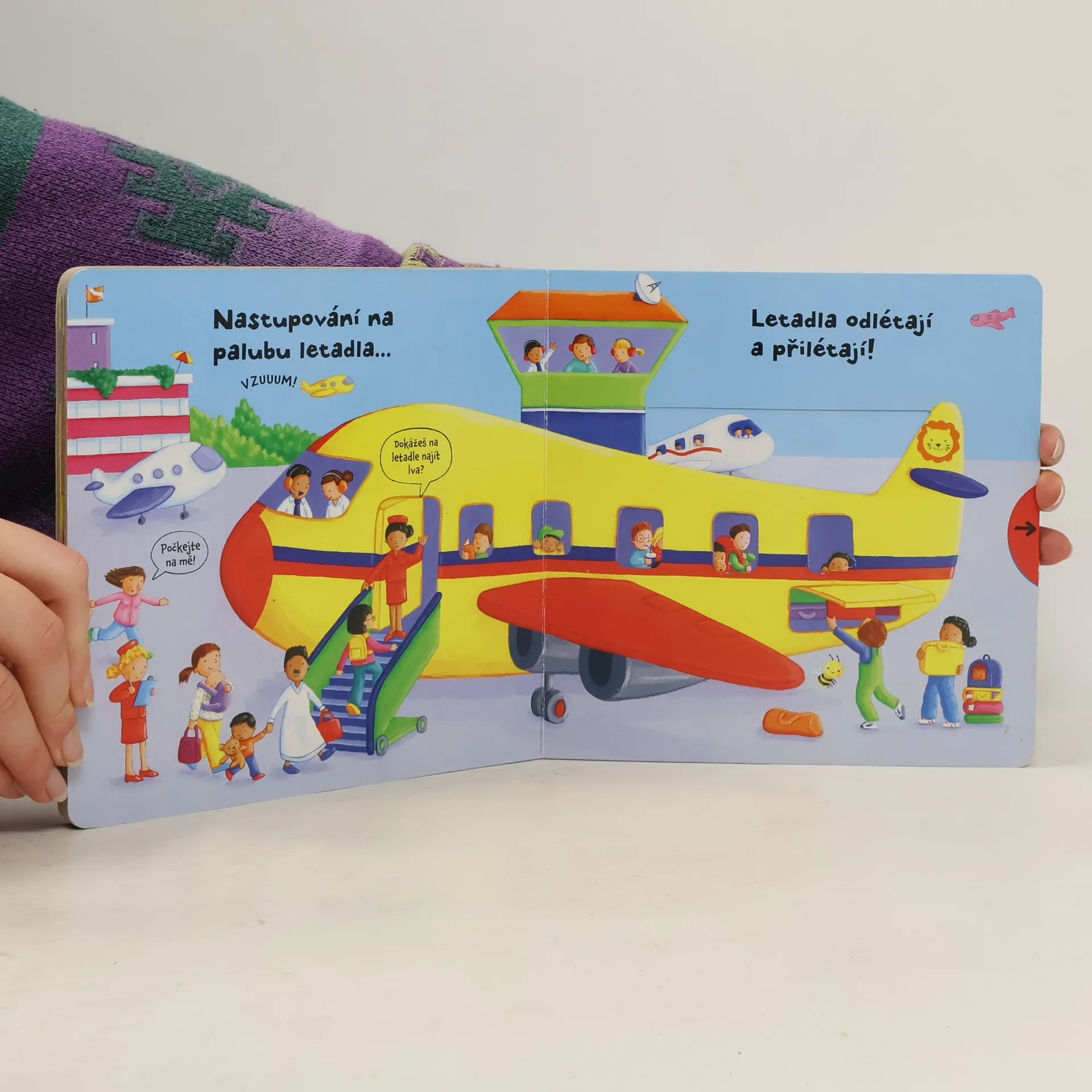 Leporelo je určeno pro děti od jednoho roku. Má pevné stránky s posuvnými a otočnými prvky, a tak si malý pilot při prohlížení procvičí i jemnou motoriku. Vítejte na letišti! Je na něm opravdu velmi rušno. Zavazadla se odbavují. Už letíte! Podívejte se z okénka letadla na lidi dole na zemi!... Toto dětské leporelo je určeno pro děti od jednoho roku. Má pevné stránky s posuvnými a otočnými prvky, a tak si malý pilot při prohlížení knížky současně procvičí jemnou motoriku – může na jednotlivých stránkách posouvat, tahat, otáčet. Objeví nové věci a může si o nich povídat! Tak vzhůru na letiště – je tam opravdu živo!