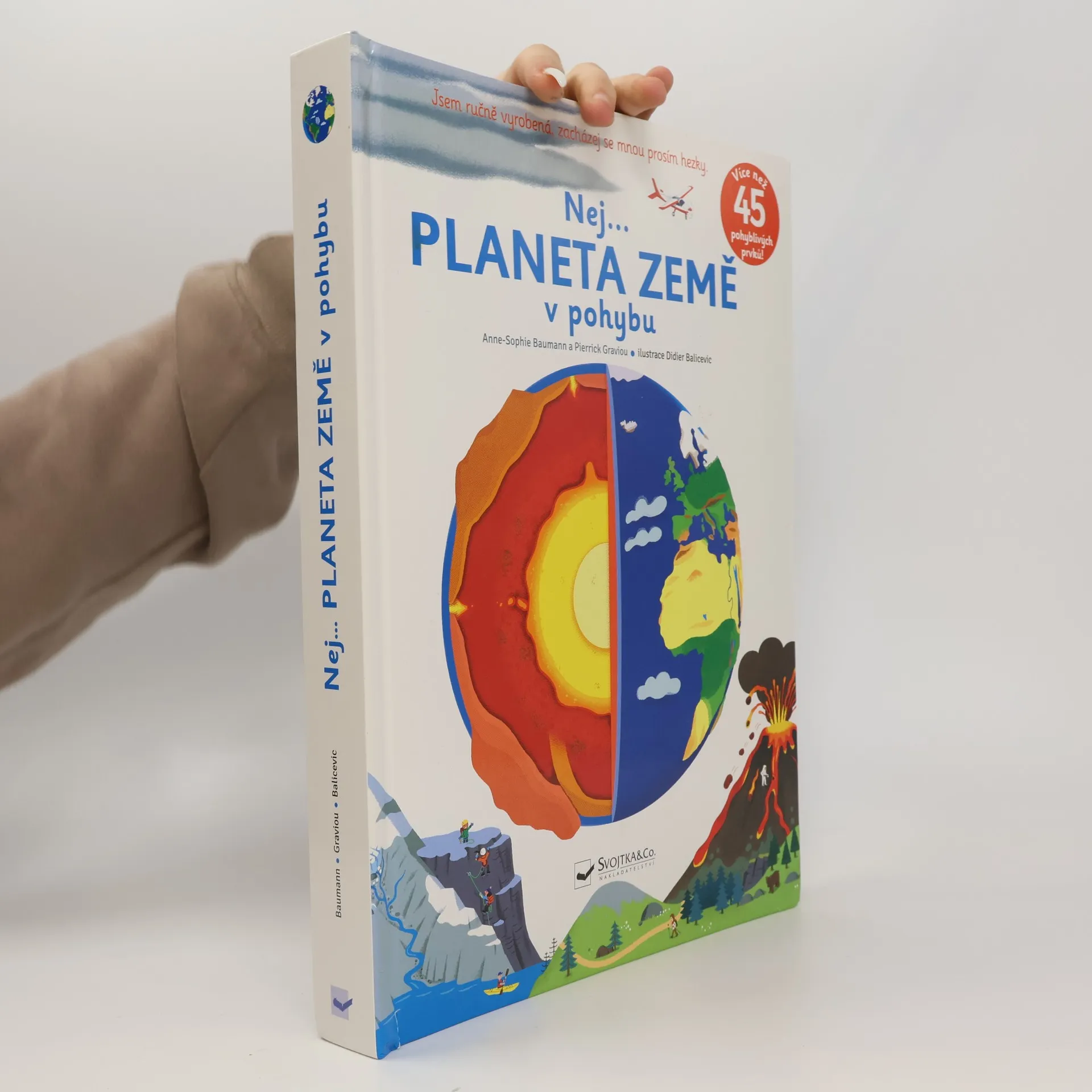Prozkoumej úchvatné a velice propracované stránky, při jejichž otáčení se doslova tají dech. Vystoupej po obloze až do výšky 12 000 metrů, rozevři stránku a nech vzniknout pohoří, zjisti, jak se pohybovaly tektonické desky, nahlédni do samotného jádra planety. Podívej se, jak člověk mění krajinu a využívá její zdroje k získání potravy, energie a nerostného bohatství. Jak se žije v různých částech naší planety - odklop okénka a zjisti, jaké rozdíly panují v jednotlivých podnebích na Zemi. Tato kniha z řady Nej... obsahuje více než 45 pohyblivých částí pro názorný zážitek z naší krásné planety, která nás nikdy nepřestane fascinovat a kterou je třeba chránit. Kniha je ručně vyrobená; aby pohyblivé prvky dlouho vydržely, vyžaduje jemnější zacházení.