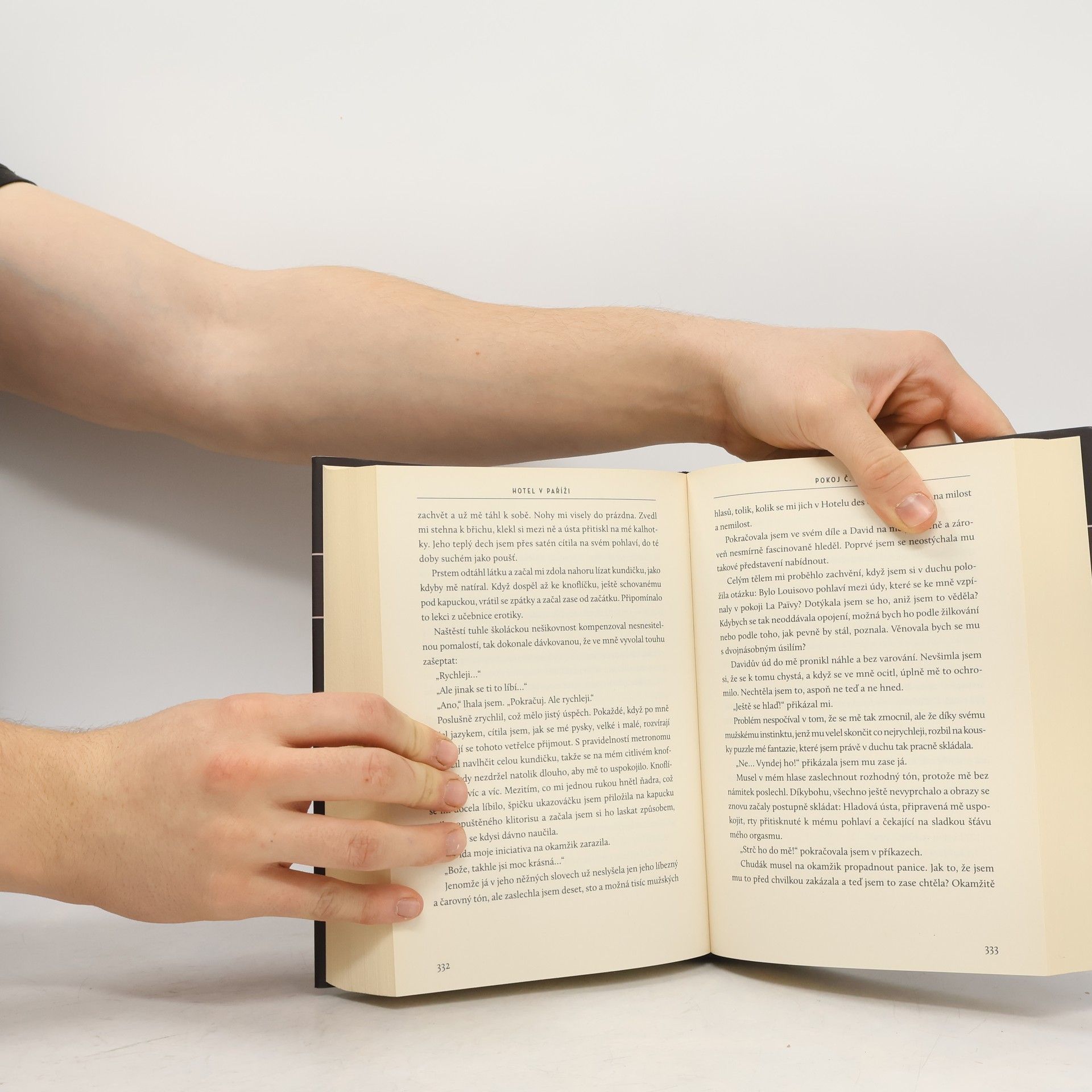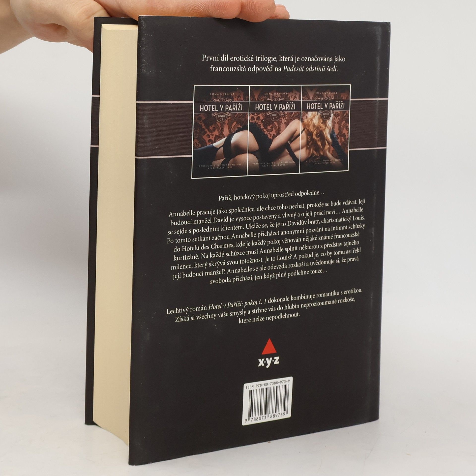 První díl erotické trilogie, která je označována jako francouzská odpověď na Fifty Shades. Paříž, hotelový pokoj uprostřed odpoledne… Tak začíná dekadentní příběh Annabelle, mladé společnice z Paříže, která přijme poslední práci před tím, než se stane ženou mocného a velkorysého muže. Tím je mediální magnát David Barlet, před kterým Annabelle, jinak studentka žurnalistiky, své noční povolání tají. Jejím posledním klientem je však Davidův charismatický bratr Louis. Ten se začne s Annabelle scházet v hotelu des Charmes. Každý z pokojů v hotelu je věnován nějaké historicky známé francouzské svůdkyni a v každém z nich musí Annabelle splnit některou z Louisových představ. Louisem vydíraná Annabelle se postupně dostane do bezvýchodné situace, jež ohrožuje její vysněnou, pohádkovou svatbu. Louis si Annabelle absolutně podmaní a ona si uvědomuje, že pravá svoboda přichází, jen když se plně odevzdá touze… Hotel v Paříži je lechtivý, vtipný, odvážný, smyslný román s detektivní zápletkou určený čtenářům, jež hledají něco víc než jen obvyklý romantický příběh.