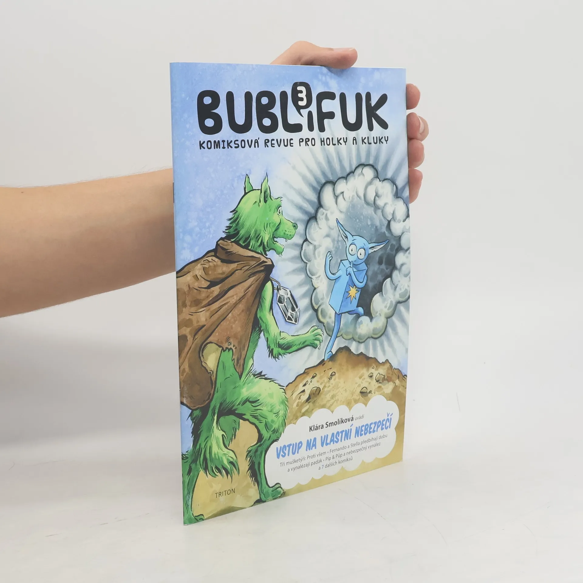 Bublifuk 3 – Vstup na vlastní nebezpečí Revue pro holky a kluky od 7 do 12 let opět představuje oblíbené hrdiny původních českých komiksů. V nových epizodách čeká čtenáře akce, napětí, legrace, dobrodružství a spousta bublin od českých komiksových scenáristů a kreslířů. Co se chystá do třetího čísla Bublifuku? Fernando a Stella předbíhají dobu a vynalézají padák! Napsal Jiří W. Procházka a kreslí Vojtěch Šeda. Piráti na suchu: Zlatý muž. Napsala Klára Smolíková a kreslí Lukáš Fibrich. Jak se dělá komiks, ve kterém myšák Chlup vysvětlí, jak je starý komiks. Napsala Klára Smolíková a kreslí Viktor Svoboda. Roboti Píp a Půp a nebezpečný vynález! Píše Martin Šinkovský a kreslí Ticho 762. Zelený vlk a díl s názvem „Odvážnému i hvězdy přejí“. Píše Kimea a kreslí Karel Jerie. Prakomiksy! Franka Morrise Howartha v českých časopisech představí Tomáš Prokůpek. Tři mušketýři a příhoda Proti všem. Píše a kreslí Petr Kopl. Hilfréd Hubertus Babočka a tajemná zásilka. Píše a kreslí Tomáš Kučerovský. Trampoty principála Piškoty a epizoda Velká cirkusová loupež! Napsal Jiří W. Procházka a kreslí Katka Čupová. Knihomol Bubu a příhoda Bubu vaří bubuláš. Podle námětu Ondřeje Buchala napsala a nakreslila Bára Buchalová.