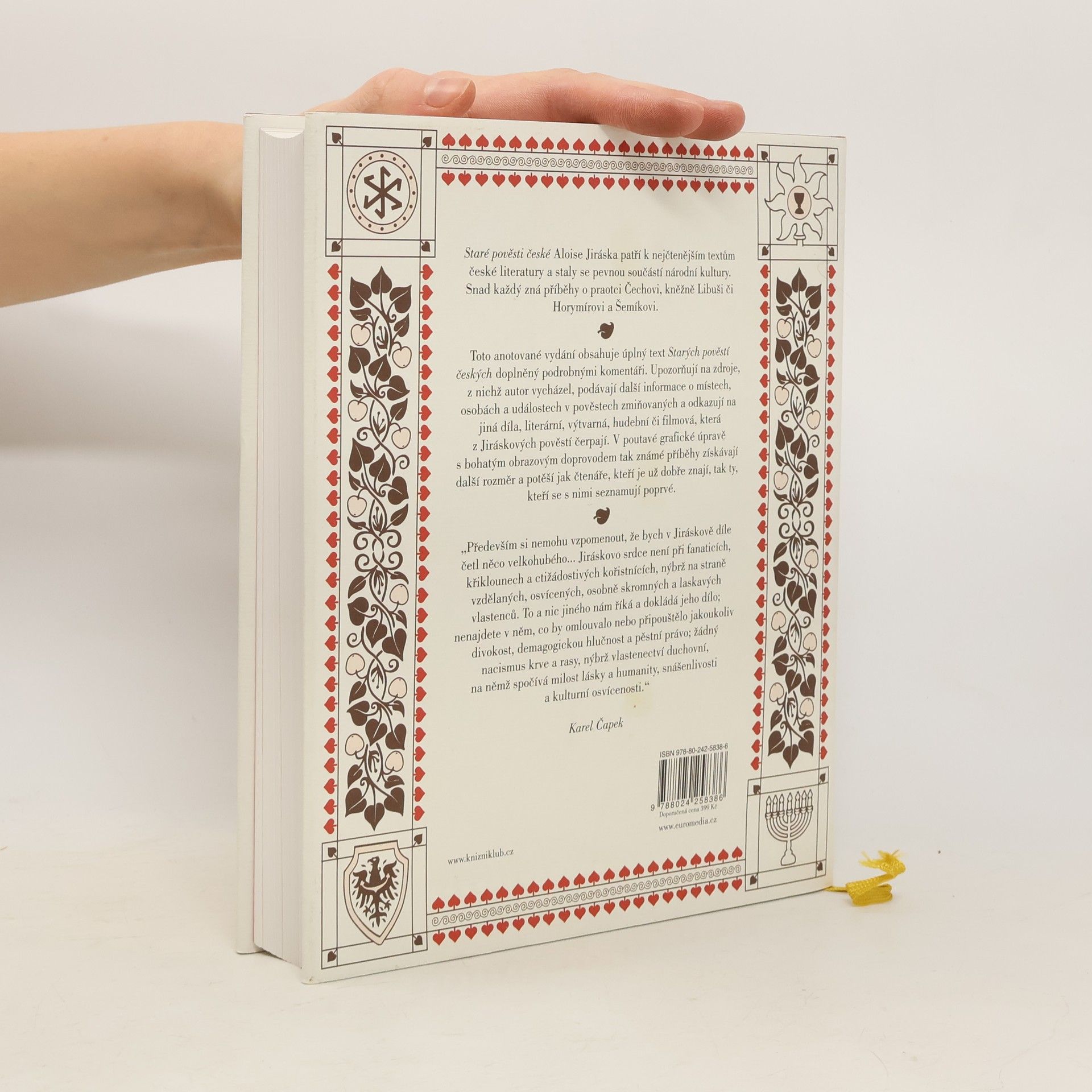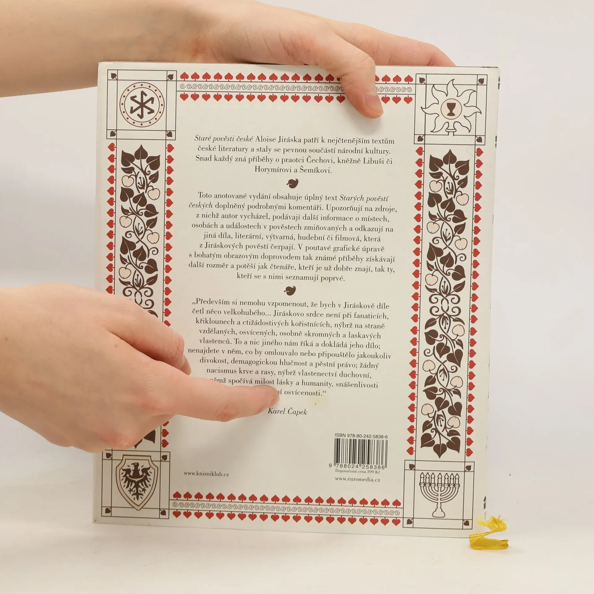 Staré pověsti české Aloise Jiráska patří k nejčtenějším textům české literatury a staly se pevnou součástí národní kultury. Snad každý zná příběhy o praotci Čechovi, kněžně Libuši či Horymírovi a Šemíkovi nebo výroky jako „země zaslíbená, zvěře a ptáků plná, medem oplývající“ a „město vidím veliké, jehož sláva hvězd se bude dotýkat“. Toto anotované vydání obsahuje úplný text Starých pověstí českých doplněný fundovanými komentáři. Ty upozorňují na zdroje, z nichž autor vycházel, podávají podrobnější informace o místech, osobách a událostech v pověstech zmiňovaných, a odkazují na další díla, literární, výtvarná, hudební či filmová, která z Jiráskových pověstí čerpají. V poutavé grafické úpravě s bohatým obrazovým materiálem tak získávají známé příběhy další rozměr a potěší jak čtenáře, kteří je už dobře znají, tak ty, kteří se s nimi seznamují poprvé.