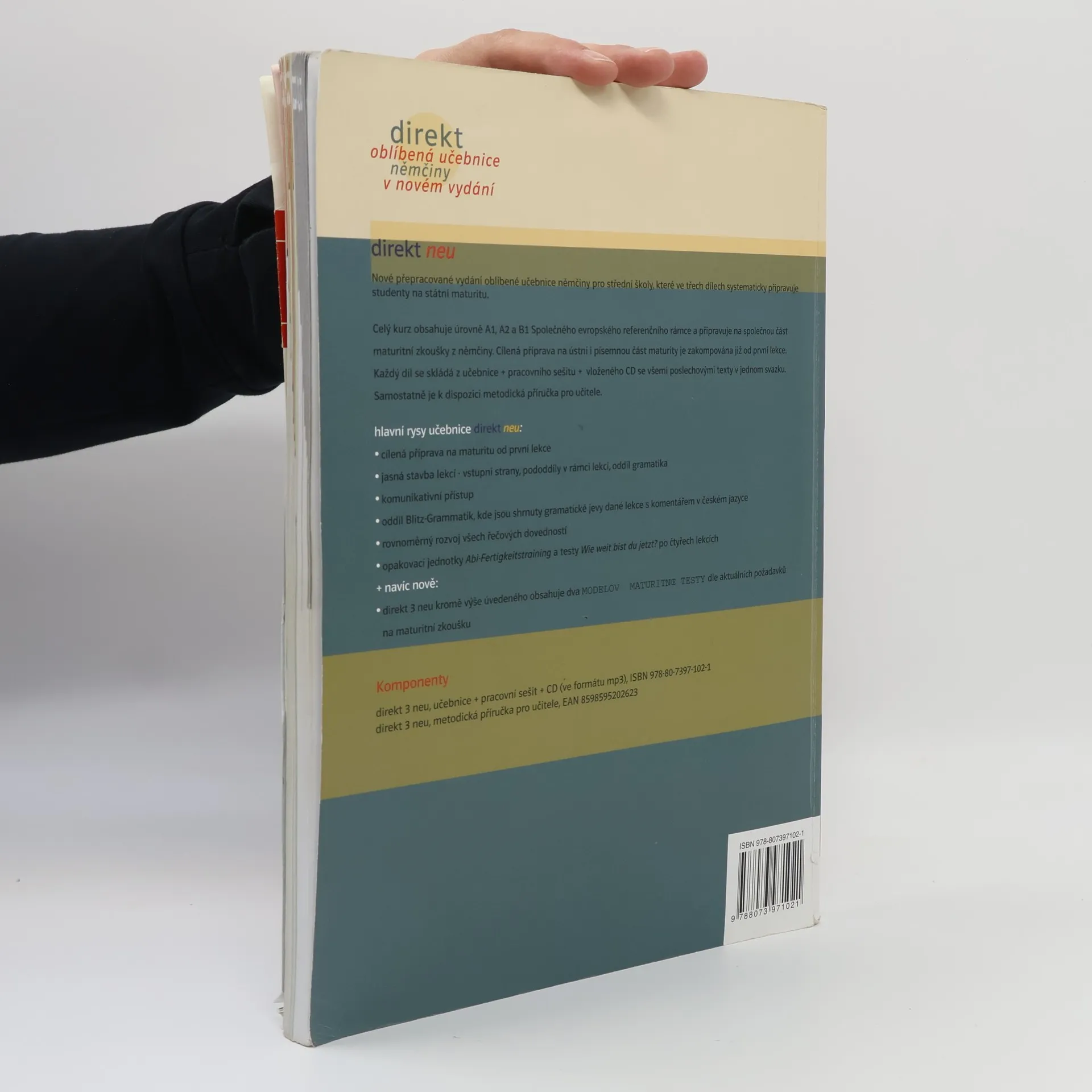 Nové přepracované vydání oblíbené učebnice němčiny pro střední školy, které ve třech dílech systematicky připravuje studenty na státní maturitu. Celý kurz obsahuje úrovně A1, A2 a B1 Společného evropského referenčního rámce a připravuje společnou část maturitní zkoušky z němčiny. Cílená příprava na ústní i písemnou část maturity je zakomponována již od první lekce. Samostatně je k dispozici metodická příručka pro učitele. Hlavní rysy učebnice direkt neu: - cílení příprava na maturitu od první lekce - jasná stavba lekcí - vstupní strany, pododdíly v rámci lekcí, oddíl gramatika - komunikativní přístup - oddíl Blitz-Grammatik, kde jsou shrnuty gramatické jevy dané lekce s komentářem v českém jazyce - rovnoměrný rozvoj všech řečových dovedností - opakovací jednotky Abi-Fertigkeitstraining a testy Wie weit bist du jetzt? po čtyřech lekcích + navíc nově: - direkt 3 neu kromě výše uvedeného obsahuje dva modelové maturitní testy dle aktuálních požadavků na maturitní zkoušku