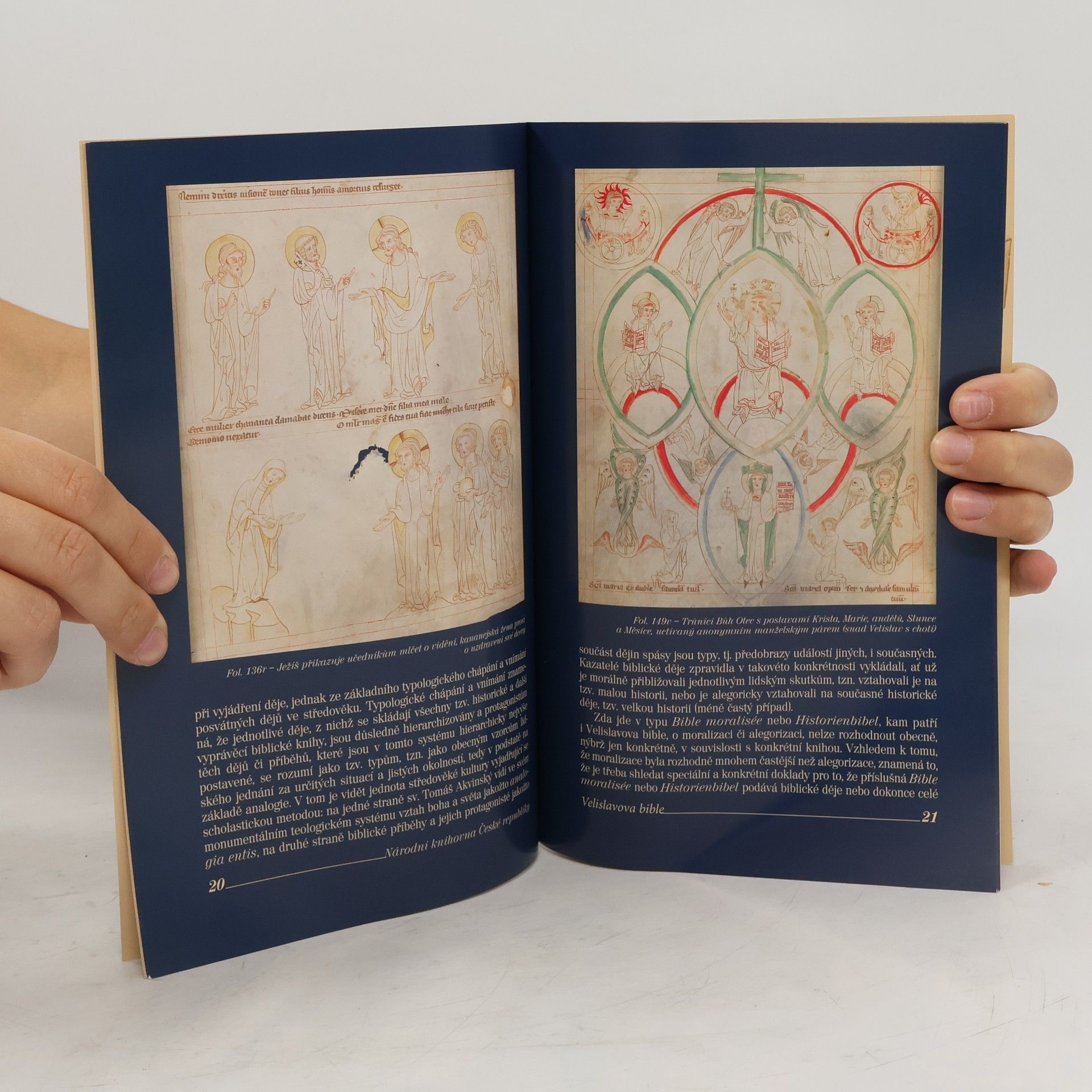 Bohatě výtvarně pojednaný rukopis (dochováno 747 vyobrazení) byl pojmenován po svém objednavateli, kanovníkovi a protonotáři Velislavovi. Výtvarná složka rukopisu výrazně převažuje nad textovým doprovodem (stručné výtahy z latinského textu bible). Velislavovu bibli uchovává dnes ve svých fondech Národní knihovna ČR. Doprovodná studie ozřejmuje okolnosti vzniku rukopisné památky a její obsahovou náplň.