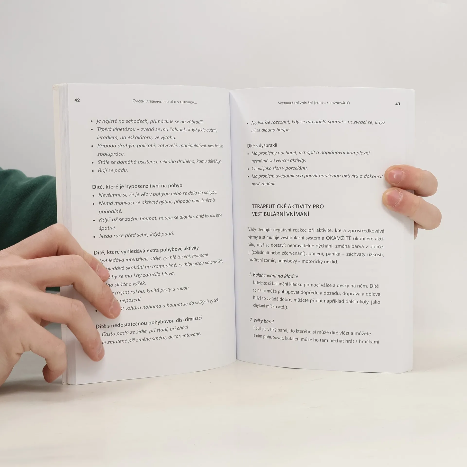 Cvičení a terapie pro děti s autismem, Aspergerovým syndromem, ADD, ADHD, Poruchou smyslového zpracování a jinými poruchami učení. Tuto knihu, která je zároveň cvičebním manuálem, napsala autorka pro rodiče s dětmi s autismem, Aspergerovým syndromem, ADD, ADHD, poruchou smyslového zpracování a jinými poruchami učení. Její snahou je rodičům popsat a jednoduše vysvětlit problémy v chování z pohledu fyzioterapeuta. V knize najdete stručné vysvětlení poruchy smyslového zpracování, rozdělení poruch, jak souvisí s vývojem a učením dítěte, jednoduchý popis jednotlivých smyslových systémů, charakteristiku jejich dysfunkce a náměty terapeutických aktivit a cvičení. Všechny uvedené aktivity jsou bezpečné, pokud se dodržují v knize uvedená doporučení a pravidla. Pro výběr vhodných cvičení a aktivit je třeba brát vždy v úvahu věk dítěte, rozsah jeho potíží, momentální fyzický a emocionální stav dítěte. Pokud si rodiče přece jen nebudou jistí nebo budou mít další dotazy, doporučuje autorka konzultaci s terapeutem. V ideáním případě jsou aktivity v této knize doplňkem pro léčebný program stanovený terapeutem.