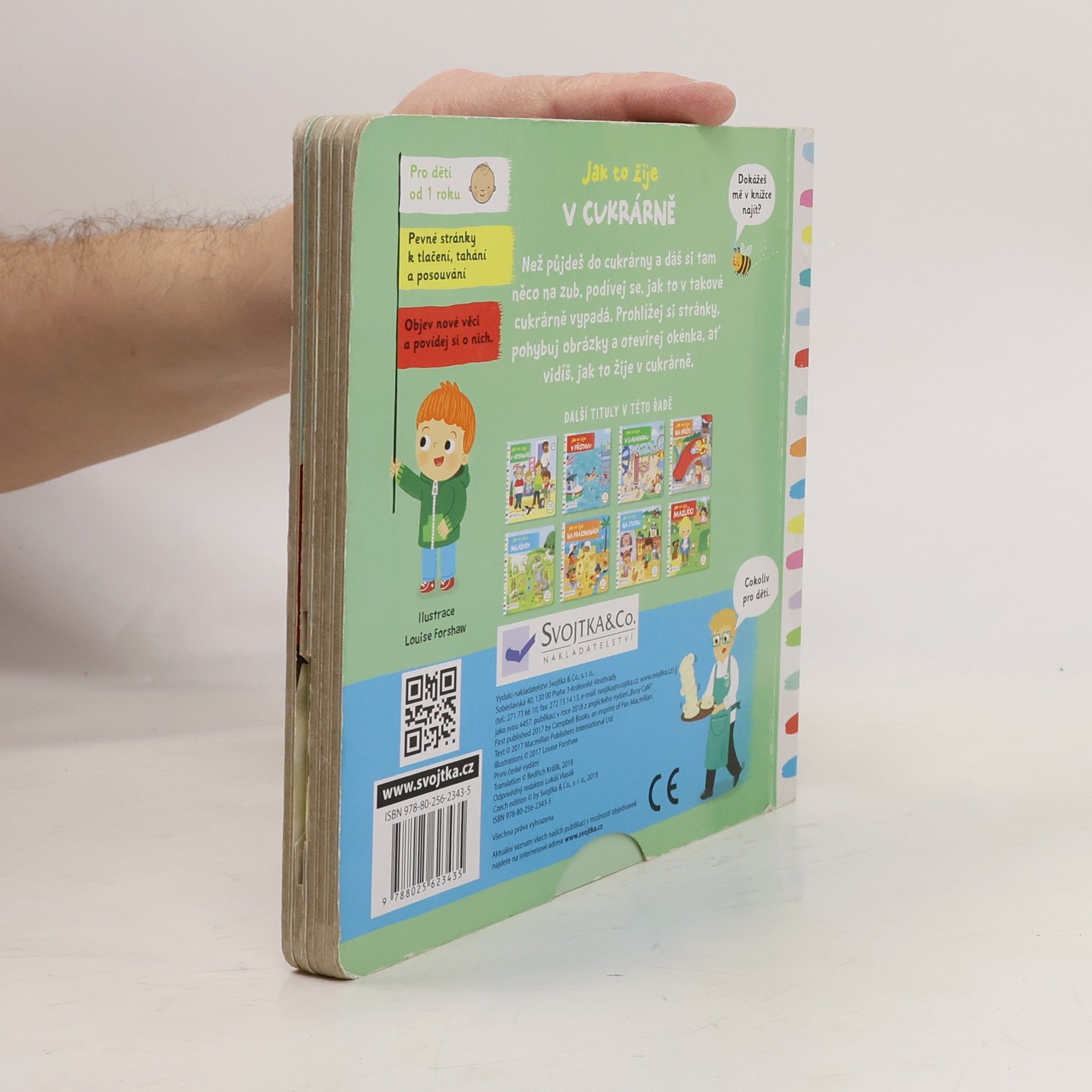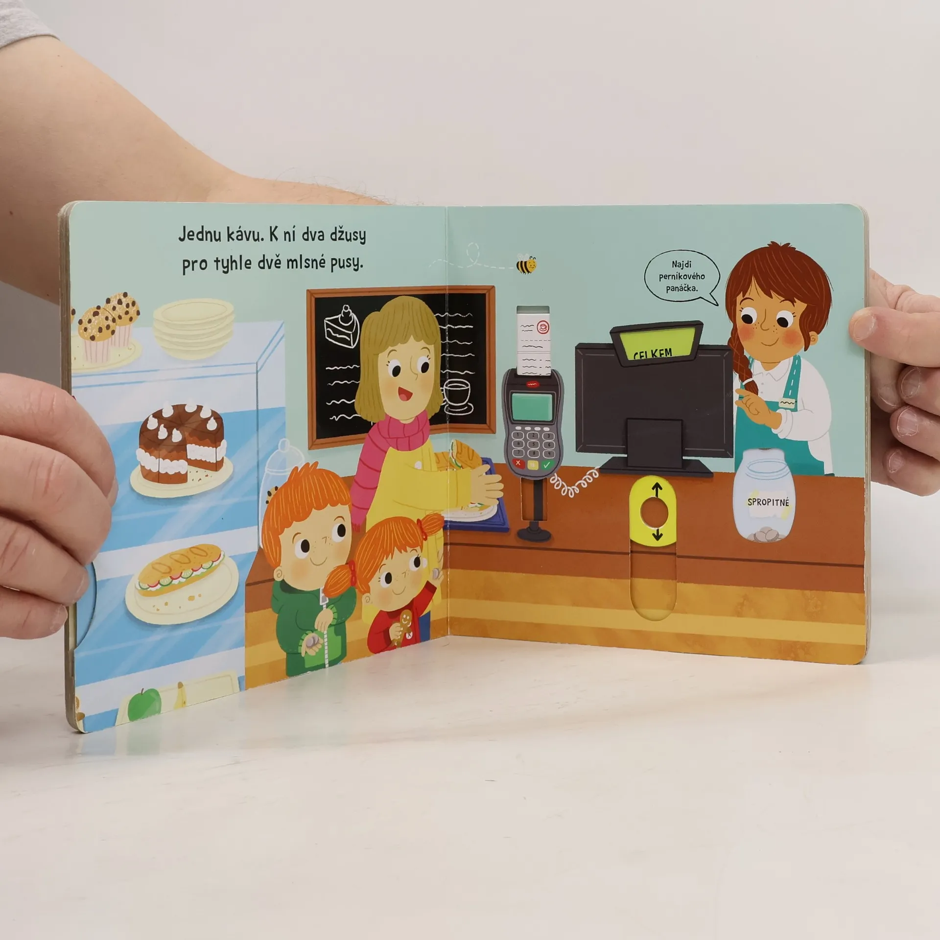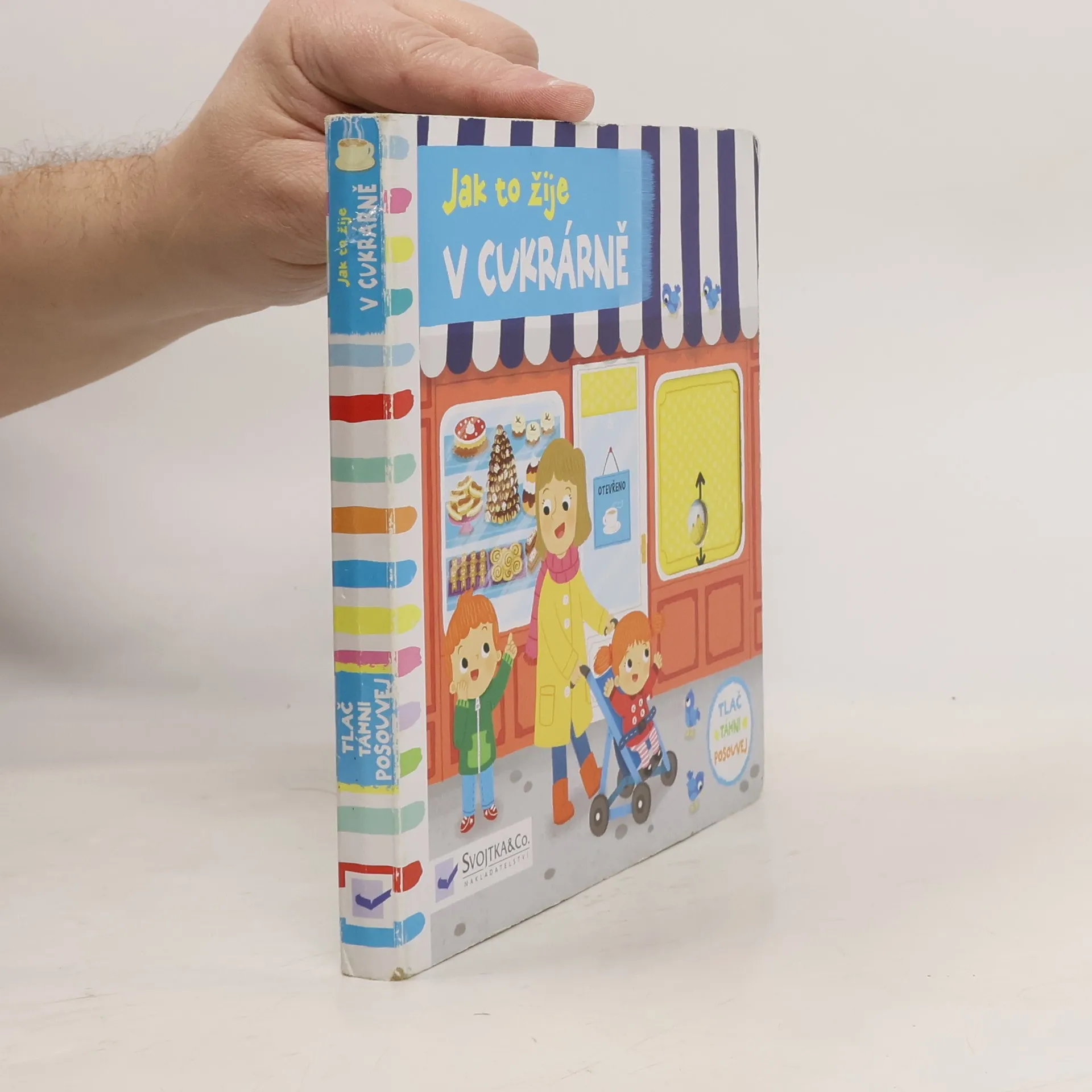 Dobré ráno. Co si dáte? Dortík? Čaj? Anebo latté? Najdeš perníkového panáčka? Než půjdeš do cukrárny a dáš si tam něco na zub, podívej se, jak to v takové cukrárně vypadá. Prohlížej si stránky, pohybuj obrázky a uvidíš, jak to žije v cukrárně. Toto veršované leporelo je určeno dětem od jednoho roku. Má pevné stránky s posuvnými a otočnými prvky, a tak si dítě při prohlížení knížky současně procvičí jemnou motoriku – může na jednotlivých stránkách posouvat, tahat, otáčet. Objeví nové věci a můžete si o nich společně povídat. Tak honem, v cukrárně je pěkně živo a taky spousta dobrot – pojď se na všechno podívat!