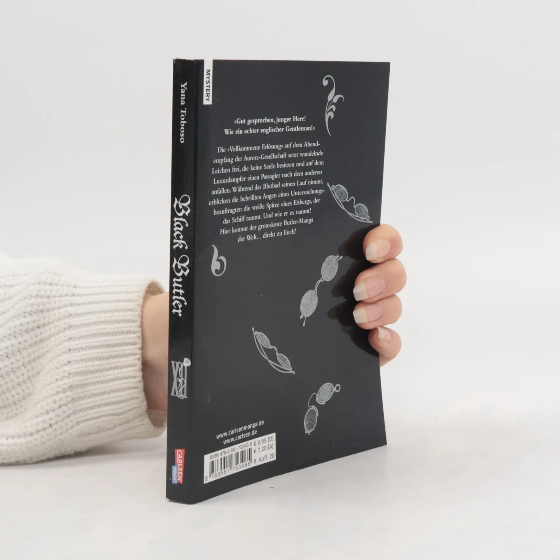 BLACK BUTLER verspricht atemberaubende Spannung im London des 19. Jahrhunderts.  Die »Vollkommene Erlösung« auf dem Abendempfang der Aurora-Gesellschaft setzt wandelnde Leichen frei, die keine Seele besitzen und auf dem Luxusdampfer einen Passagier nach dem anderen anfallen. Während das Blutbad seinen Lauf nimmt, erblicken die bebrillten Augen eines Untersuchungsbeauftragten die weiße Spitze eines Eisbergs, der das Schiff rammt.  Einzigartiger Mix aus Krimi, Action und Mystery, bei dem der Afternoon Tea nicht fehlen darf.  Weitere Informationen:  - empfohlen ab 14 Jahren - Artbook und Character Guide zum Manga - Anime auf Netflix - Anime-DVD/Blu-ray von KAZÉ Anime - Kinofilm - Live-Action-Film- Die Serie gilt als noch nicht abgeschlossen.