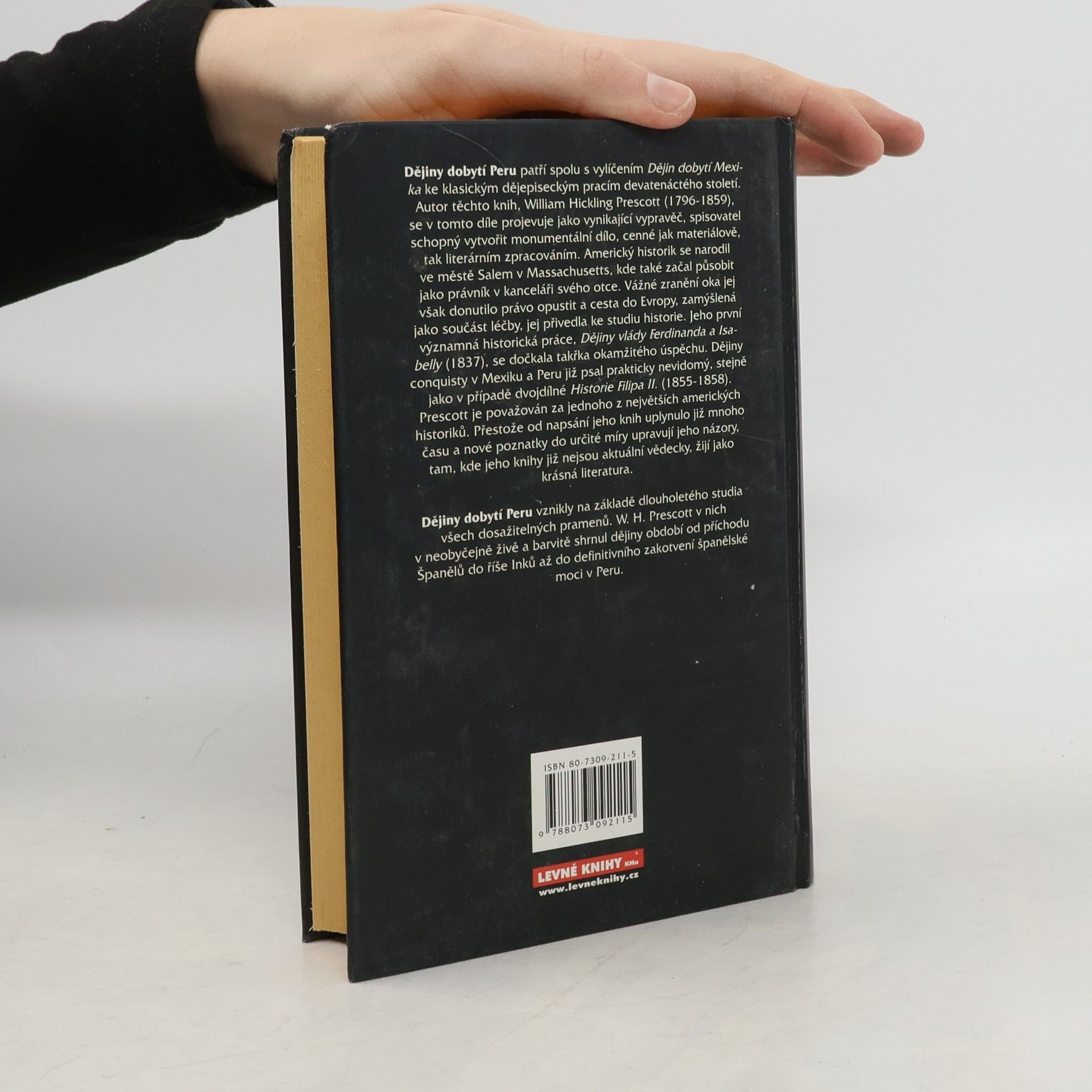 Dějiny dobytí Peru patří spolu s vylíčením Dějin dobytí Mexika ke klasickým dějepiseckým pracím devatenáctého století. Autor těchto knih, William Hickling Prescott (1796-1859), se v tomto díle projevuje jako vynikající vypravěč, spisovatel schopný vytvořit monumentální dílo, cenné jak materiálově, tak literárním zpracováním. Americký historik se narodil ve městě Salem v Massachusetts, kde také začal působit jako právník v kanceláři svého otce. Vážné zranění oka jej však donutilo právo opustit a cesta do Evropy, zamýšlená jako součást léčby, jej přivedla ke studiu historie. Jeho první významná historická práce, Dějiny vlády Ferdinanda a Isabelly (1837), se dočkala takřka okamžitého úspěchu. Dějiny conquisty v Mexiku a Peru již psal prakticky nevidomý, steně jako v případě dvojdílné Historie Filipa II. (1855-1858). Prescott je považován za jednoho z největších amerických historiků. Přestože od napsání jeho knih uplynulo již mnoho času a nové poznatky do určité míry upravují jeho názory, tam, kde jeho knihy již nejsou aktuální vědecky, žijí jako krásná literatura. Dějiny dobytí Peru Vznikly na základě dlouholetého studia všech dosažitelných pramenů. W. H. Prescott v nich v neobyčejně živě a barvitě shrnul dějiny období od příchodu Španělů do říše Inků až do definitivního zakotvení španělské moci v Peru.