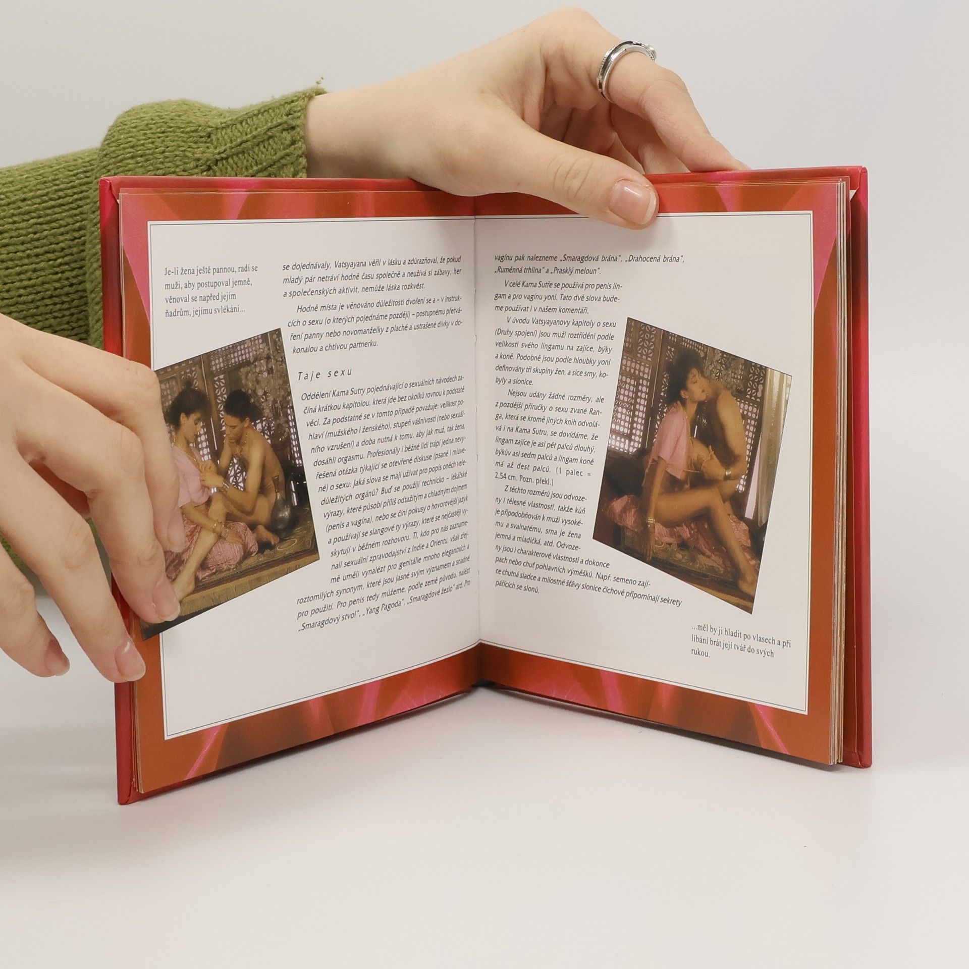 Kniha seznamuje čtenáře se vším podstatným z úplného znění této knihy o smyslných rozkoších. Průvodce je bohatě ilustrován fotografiemi, které moderním způsobem ztělesňují návody z příruček o sexuálních tajemnostech ze starověkého Orientu. Fotografie byly pořízeny speciálně za účelem této publikace a poskytují dokonalý zážitek, který je inspirující a informativní zároveň.
