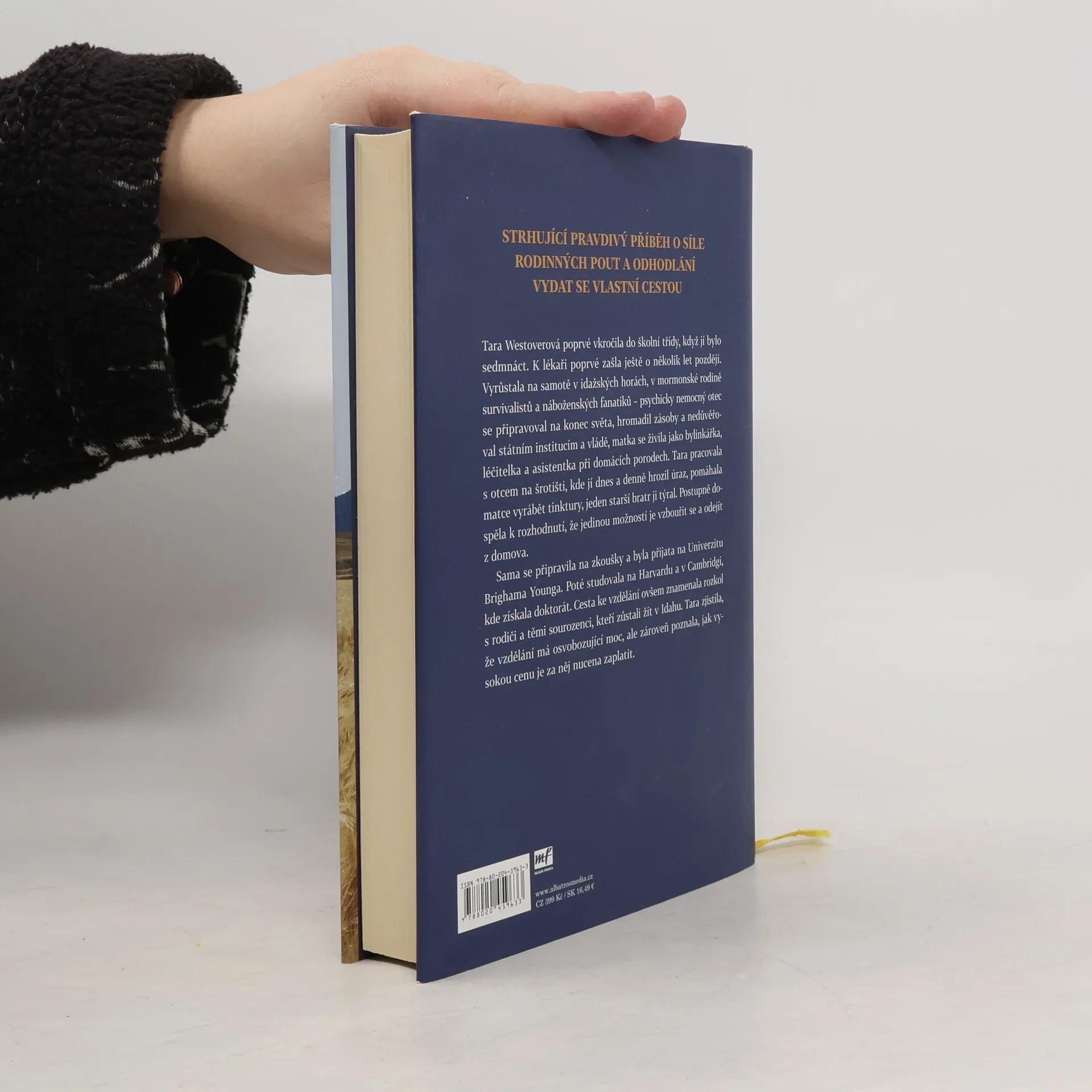 Strhující pravdivý příběh o síle rodinných pout a odhodlání vydat se vlastní cestou. Tara Westoverová poprvé vkročila do školy, když jí bylo sedmnáct. Vyrůstala na samotě v rodině survivalistů a náboženských fanatiků a až v dospívání našla odvahu hledat si vlastní cestu. Studovala na Harvardu a v Cambridgi a zjistila, že vzdělání má osvobozující moc, ale že za něj bude muset zaplatit vysokou cenu.