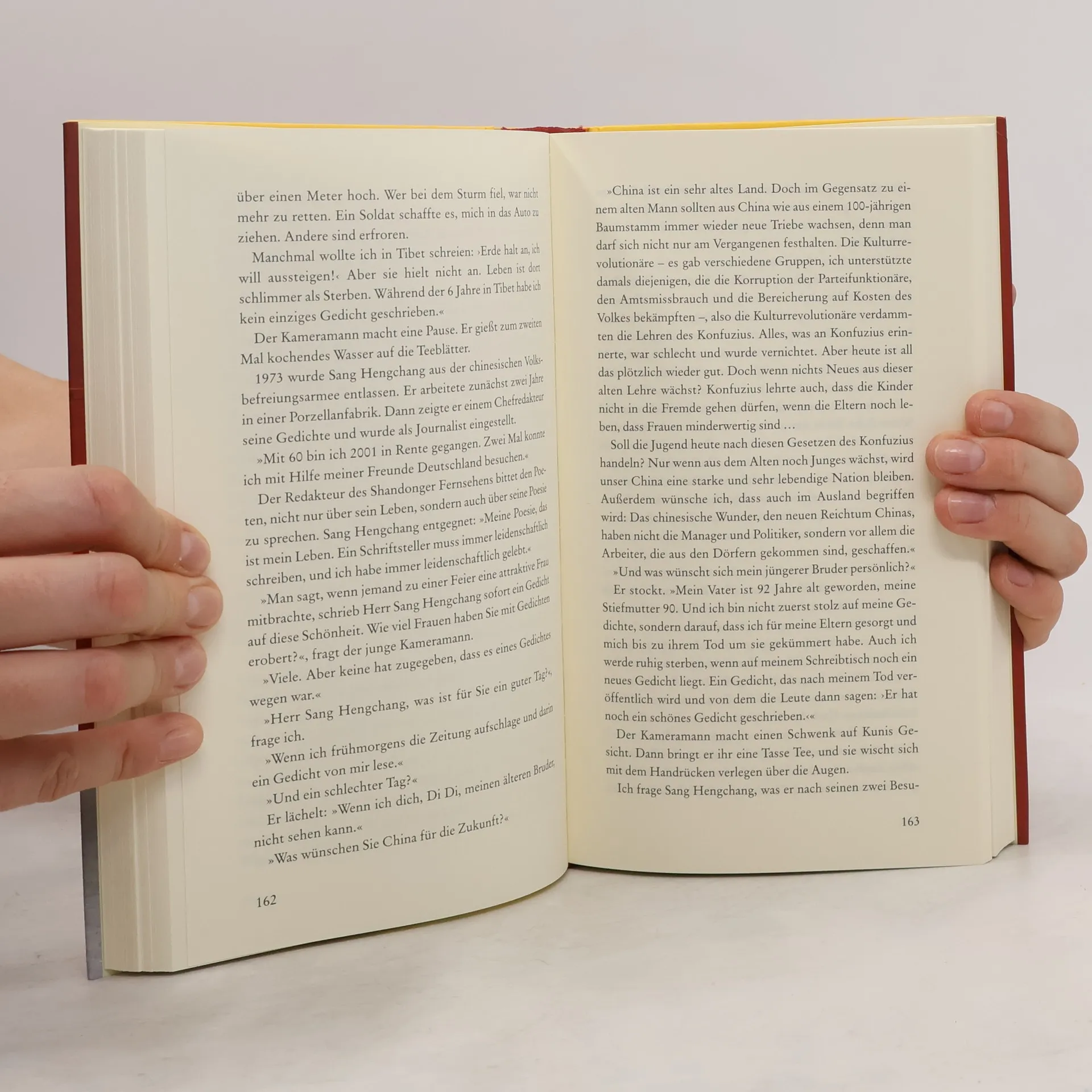 Mit deutscher Ungeduld kommst du in China nicht weit, wird Scherzer zu Beginn seines Aufenthalts gewarnt. Also übt er sich im Straßenverkehr ebenso in Gelassenheit wie beim Tempelbesuch. Aber er sieht umso genauer hin, wer und was ihm begegnet. Und er stellt jedem vier Fragen, ob taoistischer Priester, Koch, Heiler oder Gefängniswärterin: Was ist für Sie ein guter Tag? Was ein schlechter? Was wünschen Sie sich für Ihre Zukunft? Was für die Zukunft Ihres Landes? Der Fremde kann alles fragen, wird aber nicht alles erfahren und noch weniger begreifen, sagt man ihm. Scherzer jedoch gelingt es, dem fernen Land mit einer höchst originellen Reportage erstaunlich nahezukommen.