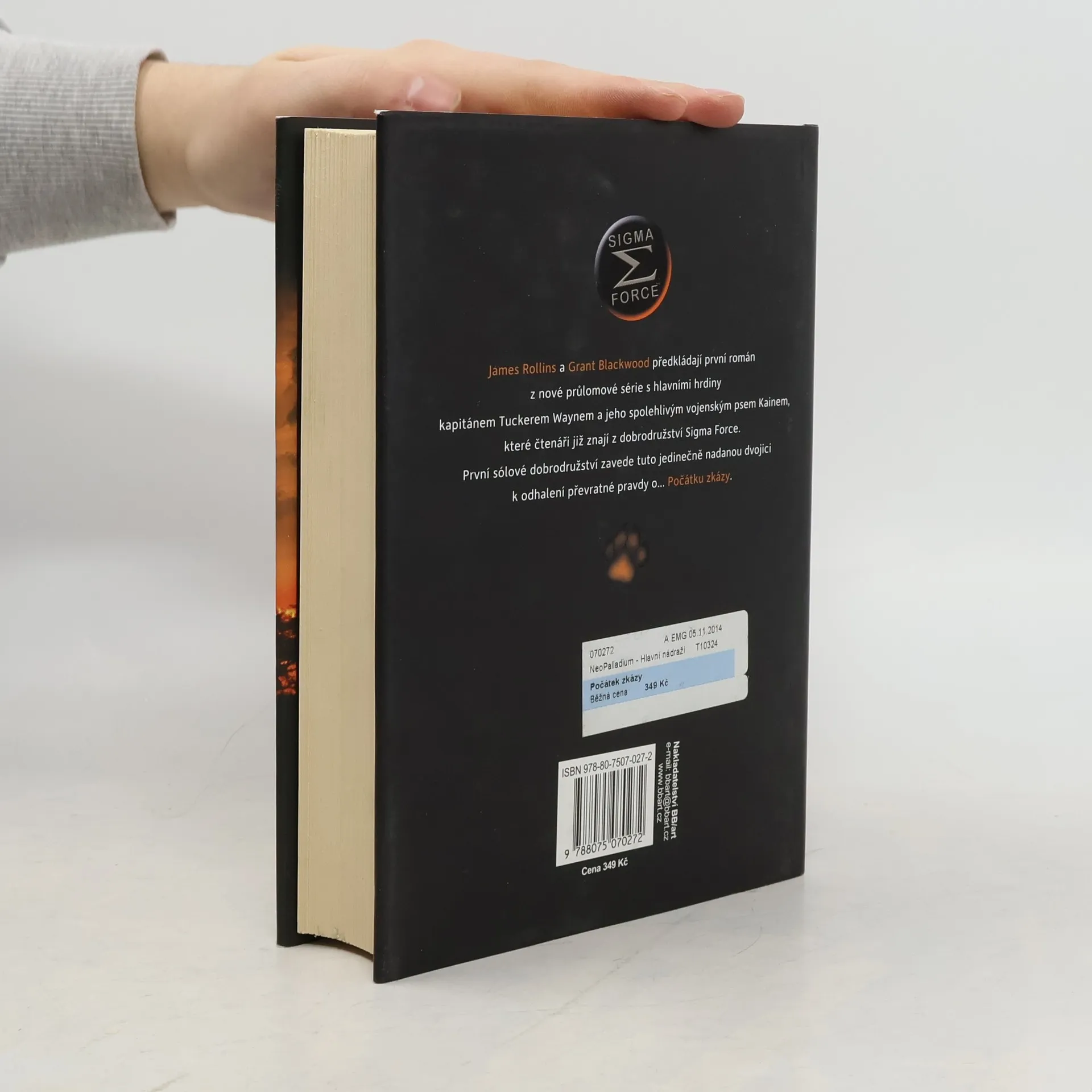 James Rollins a Grant Blackwood předkládají první román z nové průlomové série s hlavními hrdiny kapitánem Tuckerem Waynem a jeho spolehlivým vojenským psem Kainem, které čtenáři již znají z dobrodružství Sigma Force. První sólové dobrodružství zavede tuto jedinečně nadanou dvojici k odhalení převratné pravdy o… Počátku zkázy. Nejnovější člen Sigmy kapitán Tucker Wayne dostane od ředitele Crowea za úkol, aby se svým vycvičeným psem Kainem odvezl ze Sibiře ruského farmaceutického magnáta a vědeckého génia Abrama Bukolova, který má v rukou klíč k nové biologické zbrani, jež ohrožuje život na celé planetě. Při zběsilé honičce od zamrzlých ruských stepí po žhavé jihoafrické savany, od válkou zmítaných hor Namibie po zasněžená Velká jezera ve Spojených státech, musejí Tucker s Kainem společně vyřešit odvěkou záhadu, jejíž kořeny sahají až k počátkům života na Zemi, a ještě k tomu unikat před nástrahami zkušených nájemných zabijáků a ruského generála toužícího po pomstě a moci. Pevné pouto mezi člověkem a psem bude podrobeno extrémní zatěžkávací zkoušce. Nalezení řešení a odvrácení globální apokalypsy bude vyžadovat jejich veškeré dovednosti, talent a především vzájemnou důvěru.