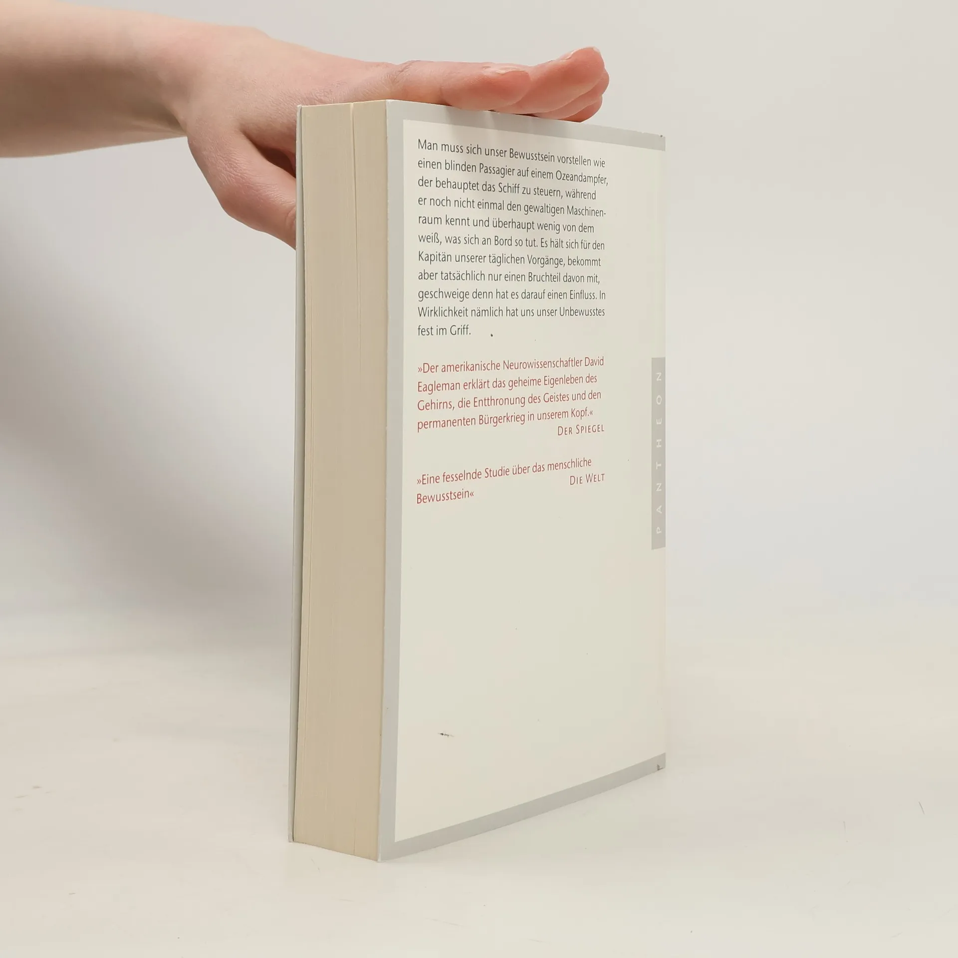 Wissen Sie, wer die Entscheidungen in Ihrem Leben trifft? Sie oder Ihr Unterbewusstsein? Mit wem führen wir innere Dialoge? Wer tritt auf die Bremse, noch bevor wir ein Hindernis bewusst wahrgenommen haben? David Eagleman führt uns mit grandioser Leichtigkeit durch die mysteriösen Tiefen unseres Gehirns und lässt das, was wir bislang für die Wirklichkeit gehalten haben, in einem völlig neuen Licht erscheinen. Unser Bewusstsein – das »Ich«, das den Motor anwirft, wenn wir morgens aufwachen – macht nur den kleinsten Teil dessen aus, was in unserem Gehirn den ganzen Tag über abläuft. Das Gehirn ist zwar die Grundlage unseres Innenlebens, aber es unterhält seinen eigenen Betrieb. Die allermeisten Abläufe werden von unserem Bewusstsein noch nicht einmal abgenickt. Man muss sich unser Bewusstsein vorstellen wie einen blinden Passagier auf einem Ozeandampfer, der behauptet das Schiff zu steuern, während er noch nicht einmal den gewaltigen Maschinenraum kennt und überhaupt nur wenig wahrnimmt. Es hält sich für den Kapitän unserer täglichen Vorgänge, bekommt aber tatsächlich nur einen Bruchteil davon mit, geschweige denn hat es darauf einen Einfluss. In Wirklichkeit nämlich hat uns unser Unbewusstes fest im Griff. Ausstattung: mit s/w-Abbildungen