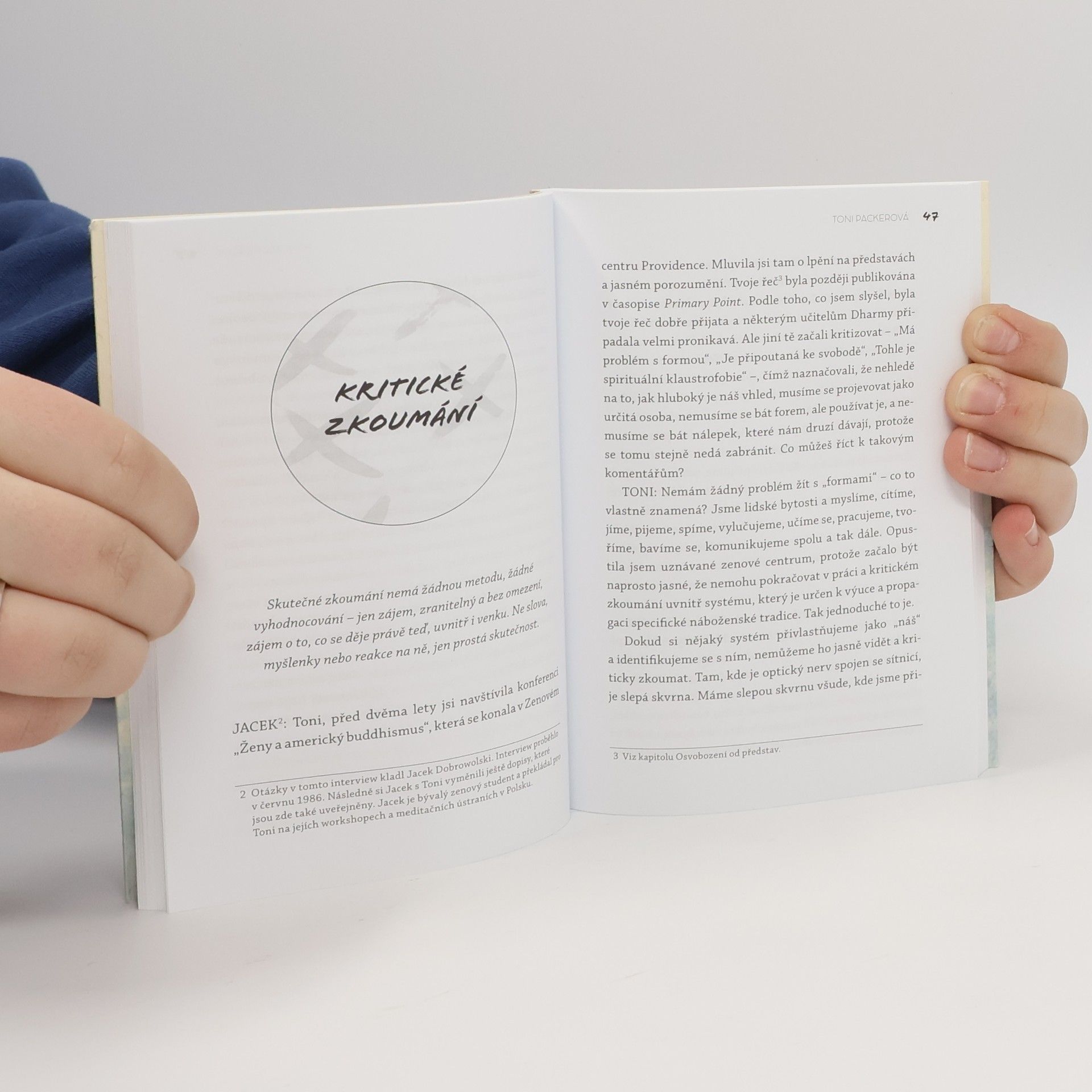 Život nám často určuje plno představ o tom, jací bychom měli být a jak by náš život měl vypadat. Toni Packerová proslula svojí schopností pomoci této představy rozlišit a dostat se za ně. Tato vzrušující knížečka složená z rozhovorů, esejí, otázek a odpovědí i dopisů představuje radikálně prostý a originální přístup cesty spirituálního růstu, aniž by se hlásila k nějakému náboženství nebo duchovní tradici. „Je možné se na sebe navzájem dívat a naslouchat si zcela novým způsobem – aniž by nás naše zvyky nutily opravovat a měnit druhé podle toho, co se nám líbí a nelíbí? Můžeme znovu objevovat, co se děje právě teď, a reagovat spíše díky jasnému porozumění a ne na základě představ?“