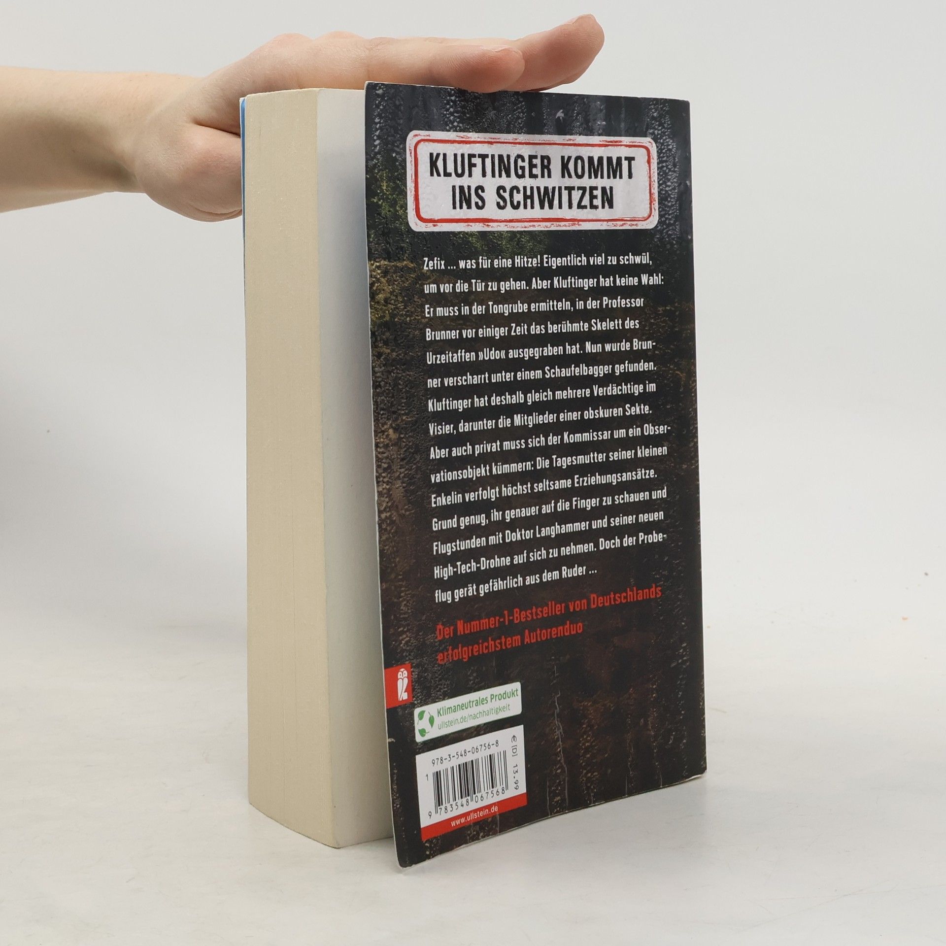 Kluftinger kommt ins Schwitzen Zefix ... was für eine Hitze! Eigentlich viel zu schwül, um vor die Tür zu gehen. Aber Kluftinger hat keine Wahl: Er muss in der Tongrube ermitteln, in der Professor Brunner vor einiger Zeit das berühmte Skelett des Urzeitaffen „Udo“ ausgegraben hat. Nun wurde Brunner verscharrt unter einem Schaufelbagger gefunden. Der Wissenschaftler, der mit seinem Fund beweisen wollte, dass die Wiege der Menschheit im Allgäu liegt, hatte viele Feinde. Kluftinger hat deshalb gleich mehrere Verdächtige im Visier, darunter die Mitglieder einer obskuren Sekte. Aber auch privat muss sich der Kommissar um ein Observationsobjekt kümmern: Die Tagesmutter seiner kleinen Enkelin verfolgt höchst seltsame Erziehungsansätze. Grund genug, ihr genauer auf die Finger zu schauen und Flugstunden mit Doktor Langhammer und seiner neuen High-Tech-Drohne auf sich zu nehmen. Doch der Probeflug gerät gefährlich aus dem Ruder ...