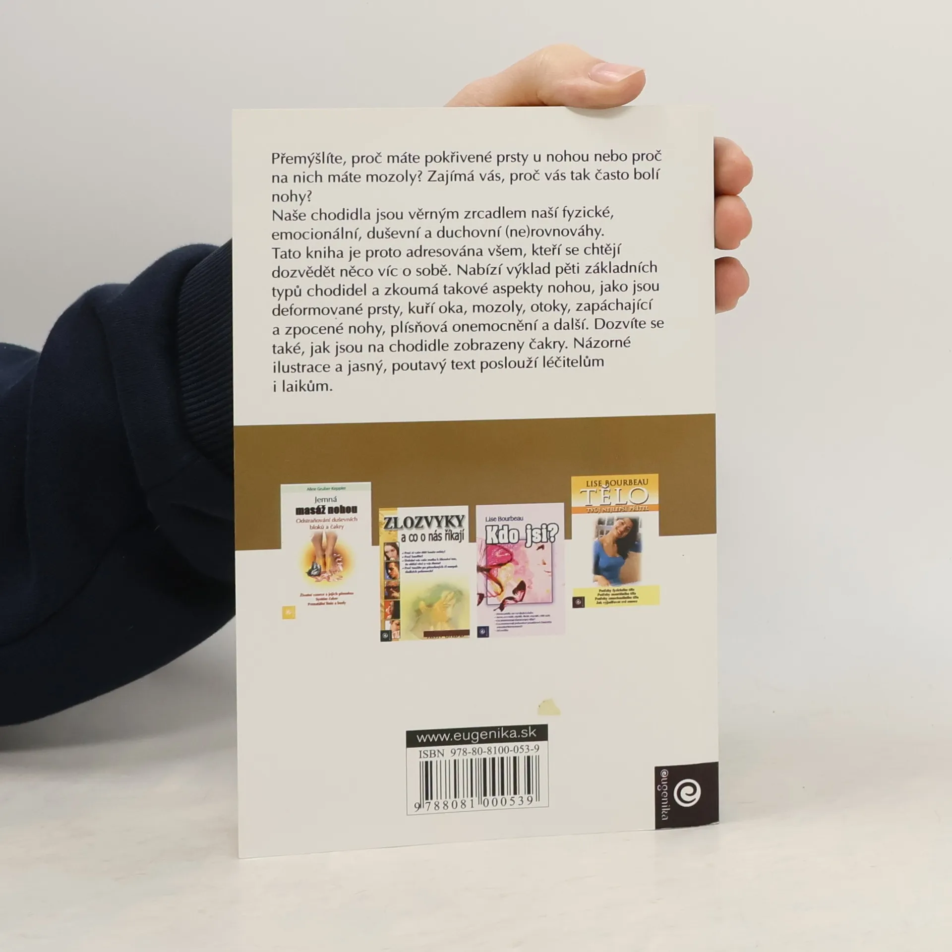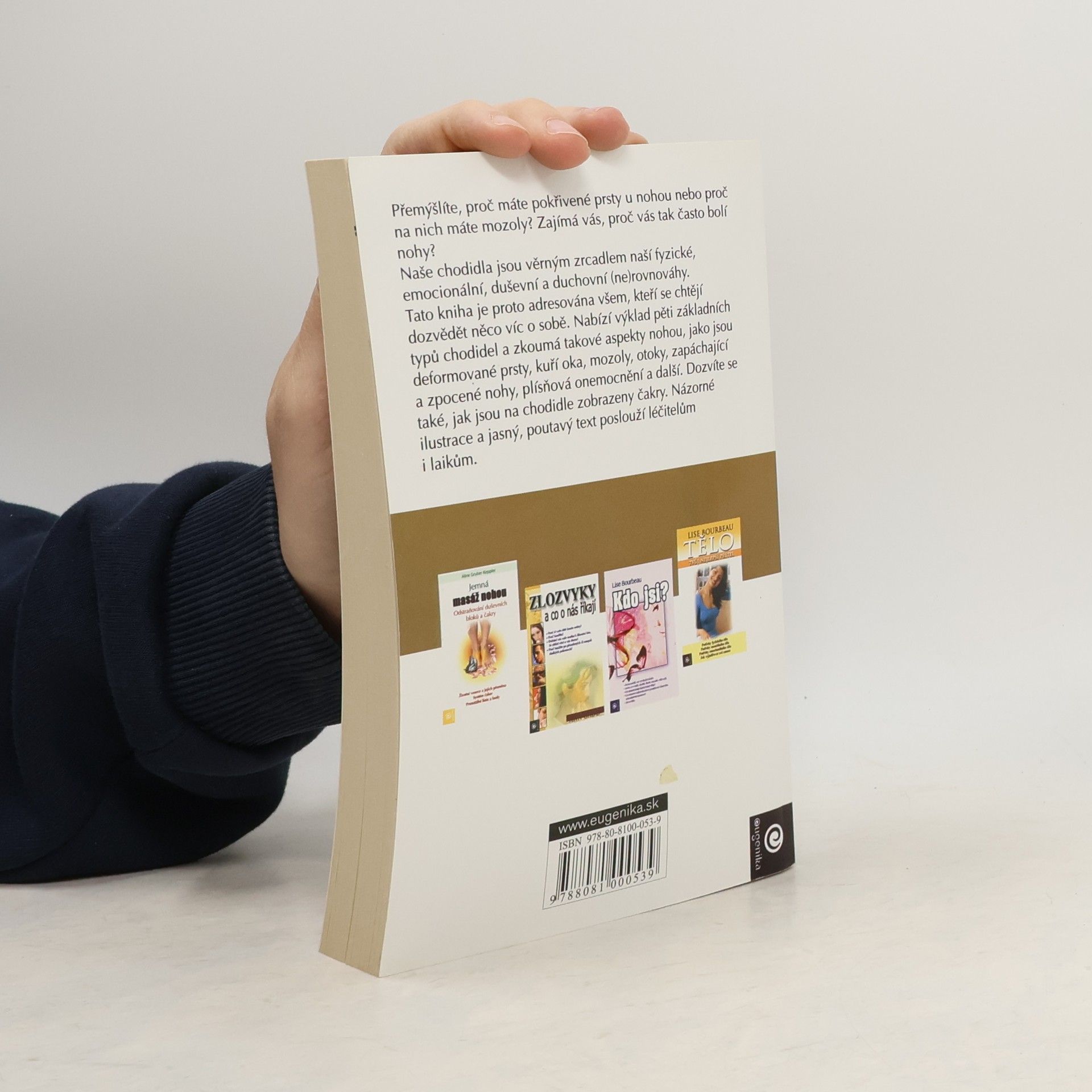 aneb Jak chodidla zrcadlí naši duši Přemýšlíte, proč máte pokřivené prsty u nohou nebo proč na nich máte mozoly? Zajímá vás, proč vás tak často bolí nohy? Naše chodidla jsou věrným zrcadlem naší fyzické, emocionální, duševní a duchovní (ne)rovnováhy. Tato kniha je proto adresována všem, kteří se chtějí dozvědět něco víc o sobě. Nabízí výklad pěti základních typů chodidel a zkoumá takové aspekty nohou, jako jsou deformované prsty, kuří oka, mozoly, otoky, zapáchající a zpocené nohy, plísňová onemocnění a další. Dozvíte se také, jak jsou na chodidle zobrazeny čakry. Názorné ilustrace a jasný, poutavý text poslouží léčitelům i laikům. Rozbor různých typů nohou. Význam chloupků na prstech, kuřích ok, mozolů a jiných běžných aspektů nohou. Čakry a chodidla.