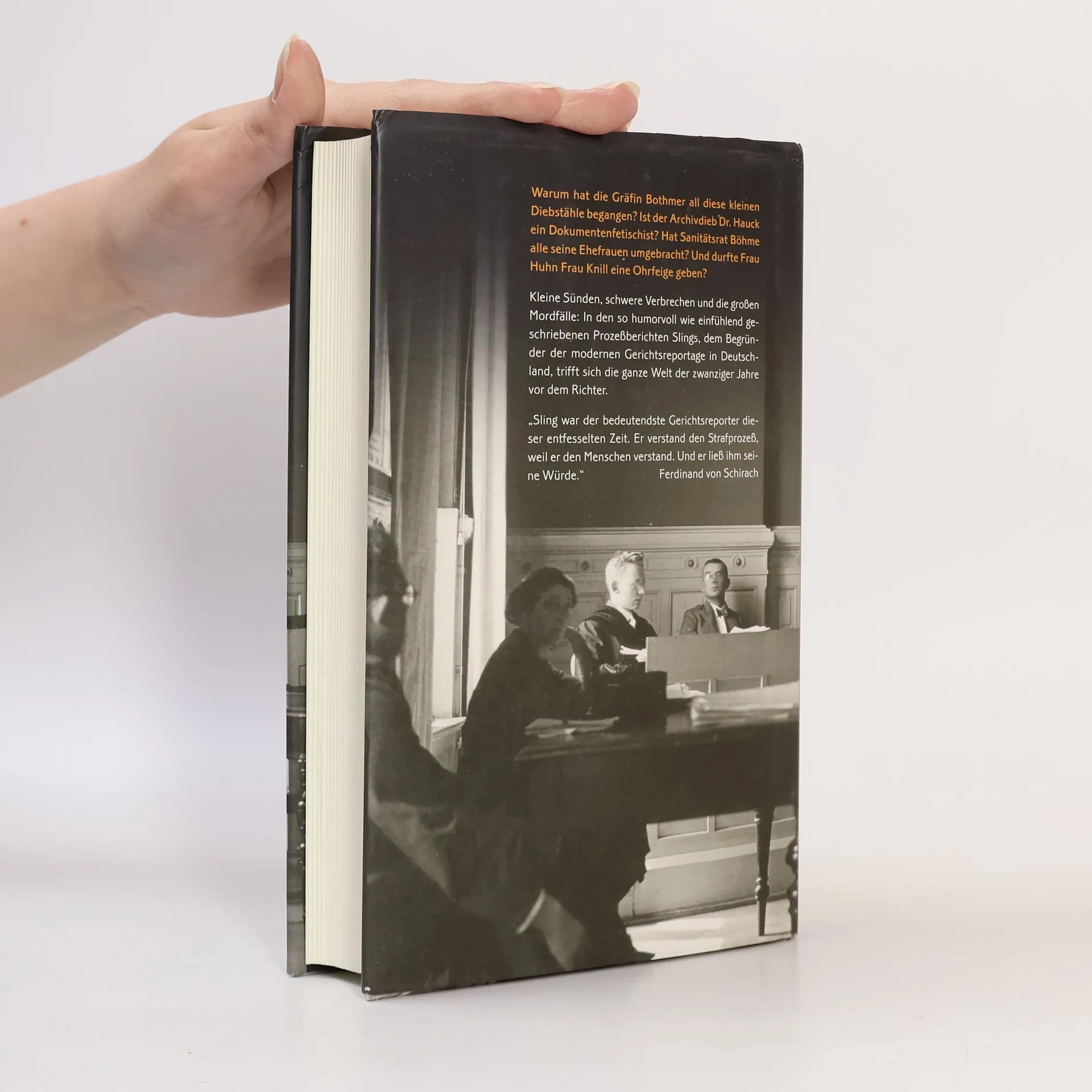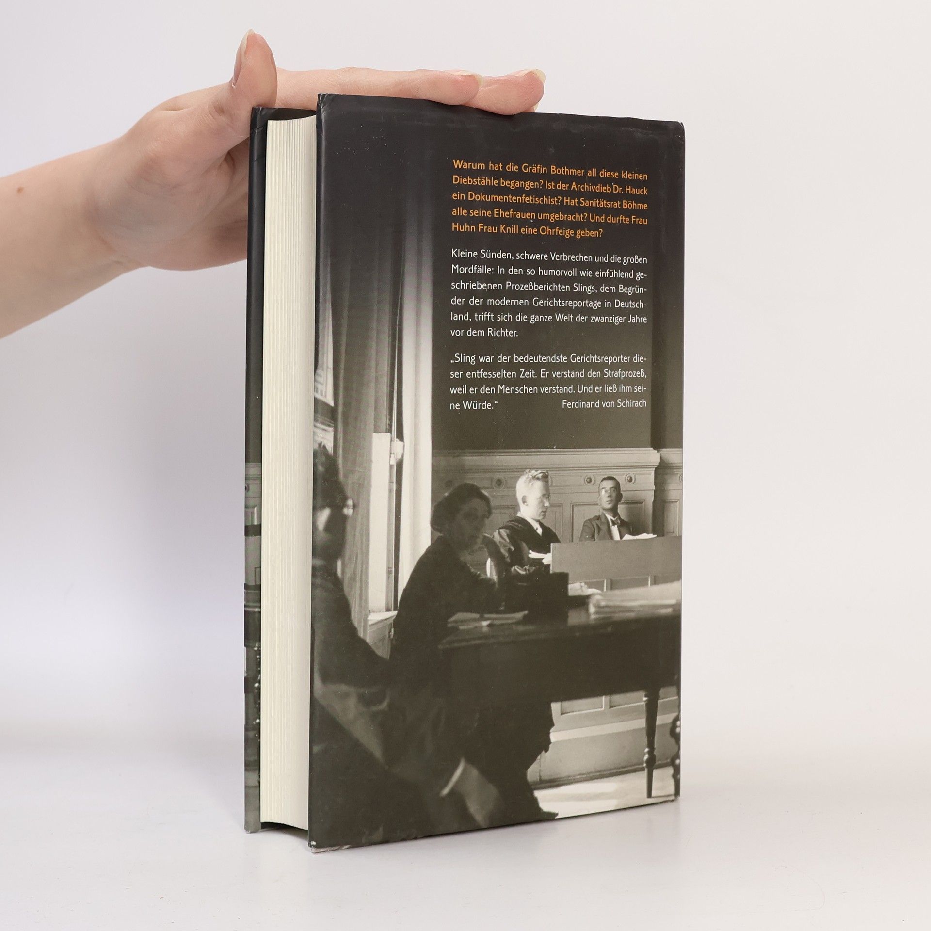Kleine Sünden, schwere Verbrechen: Die ganze Gesellschaft der zwanziger Jahre trifft sich vor Gericht – humorvoll und einfühlend beschrieben vom Begründer der modernen Gerichtsreportage in Deutschland. Warum hat die Gräfin Bothmer all diese kleinen Diebstähle begangen? Ist der Archivdieb Dr. Hauck ein Dokumentenfetischist? Hat Sanitätsrat Boehme alle seine Ehefrauen umgebracht? Und durfte Frau Huhn Frau Knill eine Ohrfeige geben wegen der Behauptung, sie habe etwas mit ihrem Gatten Herrn Knill? Von der Verleumdungsklage unter Nachbarn, dem Erbschaftsstreit im Hochadel, über Glücksspielbetrug, Meineidsverfahren, aufgedeckte Korruption sowie geniale Fälschungen bis hin zum Verdacht auf Gattinnenmord, zu erschossenen Söhnen, tödlichen Eifersuchtsdramen und müden Richtern: Die Gerichtsreportagen von Sling führen mitten hinein in das Leben, wie es sich vor den Schranken der Gerichte sammelt, mitten hinein in die Welt der zwanziger Jahre. Das Kürzel „Sling“ stand dabei für eine neuartige Berichterstattung, die geprägt war von einem menschenfreundlichen Humor und ihren Urheber zu einem der berühmtesten Journalisten der Weimarer Republik und zum Vorbild für viele nach ihm machte. Hans Holzhaider, als Gerichtsreporter der Süddeutschen Zeitung ein „Nachfahre“ Slings, trägt das Nachwort bei.