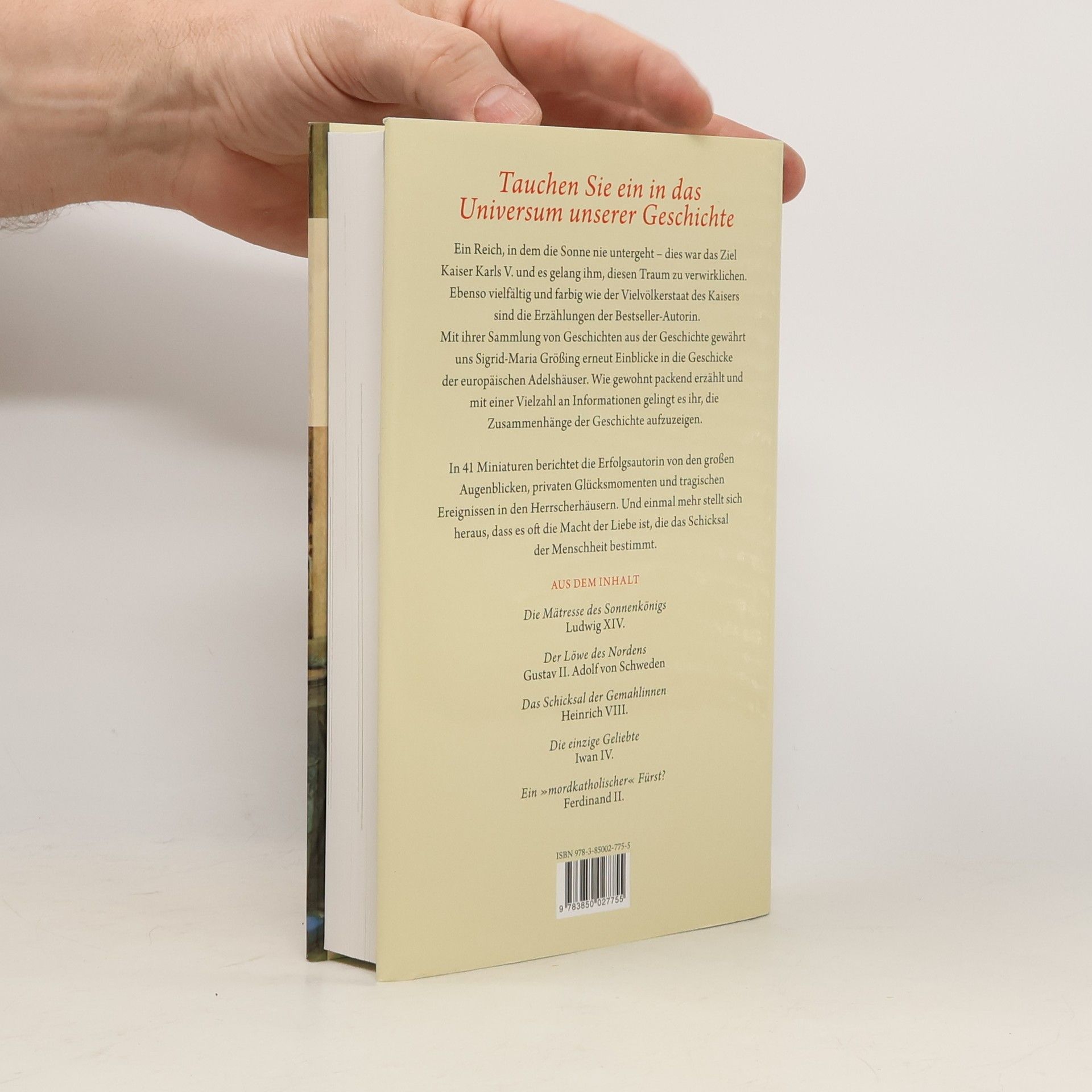 Ein Reich, in dem die Sonne nie untergeht – dies war das Ziel Kaiser Karls V. und es gelang ihm, diesen Traum zu verwirklichen. Ebenso vielfältig und farbig wie der Vielvölkerstaat des Kaisers sind die Erzählungen der Bestseller-Autorin. In ihrer neuen Sammlung von Geschichten aus der Geschichte gewährt uns Sigrid-Maria Größing einmal mehr private Einblicke in die Geschicke der europäischen Adelshäuser. In packender Erzählweise und mit einer Vielzahl an Informationen gelingt es ihr, die großen Zusammenhänge der Geschichte verständlich aufzuzeigen. Sie berichtet unter anderem vom Leben am Hof von König Heinrich VIII. und seinen sechs Ehefrauen, beleuchtet die Liebesgeschichte des russischen Zaren Iwan des Schrecklichen und schildert ebenso spannend wie berührend das Schicksal des Sonnenkönigs Ludwig XIV. Mit Liebe zum Detail entwirft die Erfolgsautorin 41 Miniaturen von Europas Herrschern, ihren großen Augenblicken, den privaten Glücksmomenten und tragischen Geschehnissen