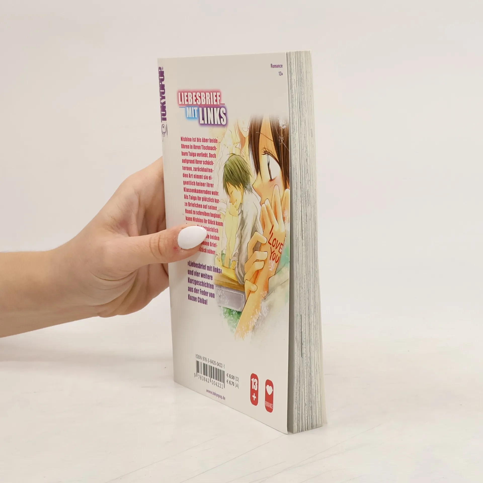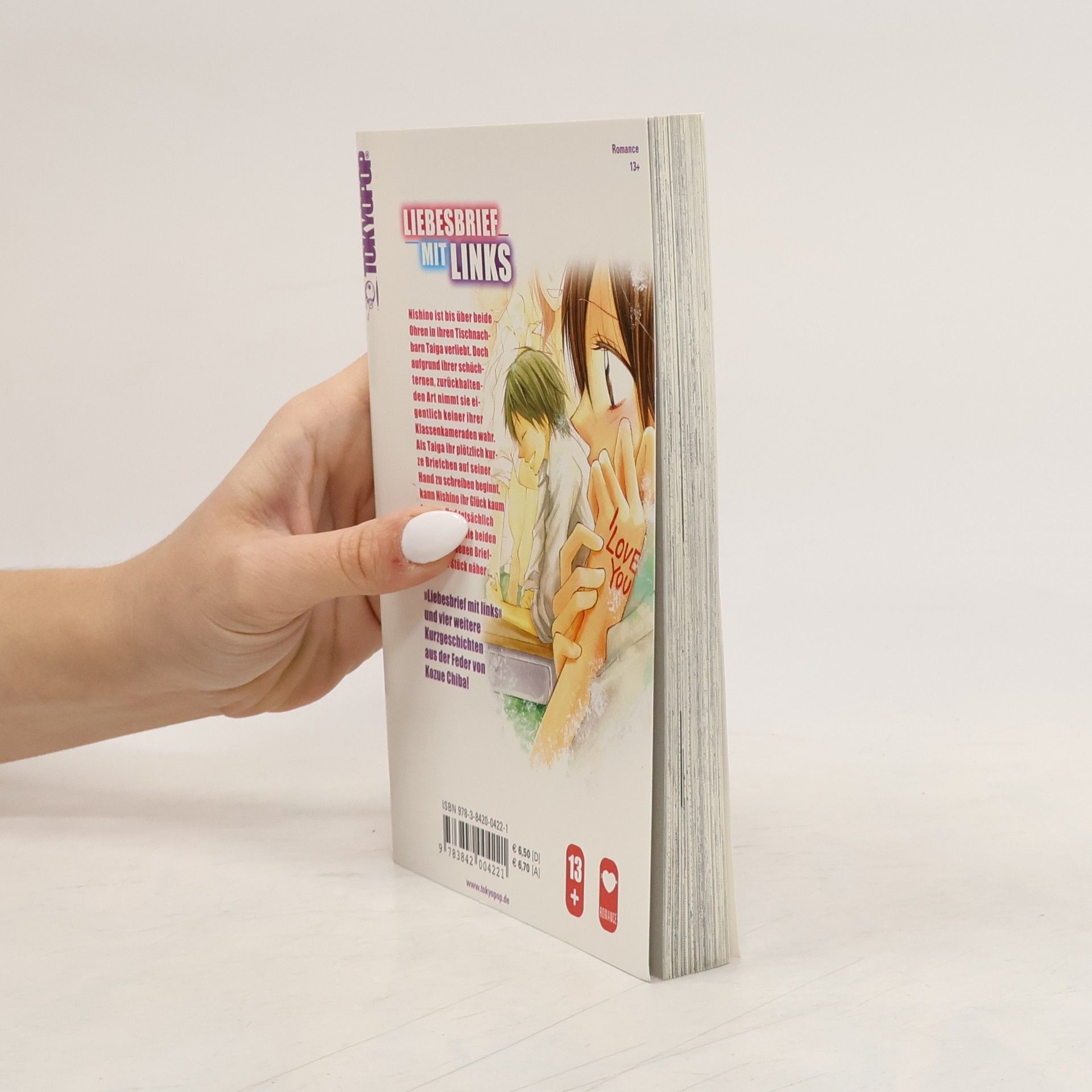Nishino ist superschüchtern und so zurückhaltend, dass sie von ihren Klassenkameraden kaum wahrgenommen wird – mit Ausnahme von Mädchenschwarm Taiga, der sie stets fröhlich begrüßt. Kein Wunder, dass sich Nishino Hals über Kopf in ihn verliebt hat. Als er plötzlich per Handnotizen mit ihr zu kommunizieren beginnt, kann Nishino ihr Glück kaum fassen. Und mit jedem kleinen Briefchen kommen sich die beide ein Stück näher. Lass dich von 'Liebesbrief mit links' und vier weiteren Kurzgeschichten aus der Feder von Kozue Chiba verzaubern.