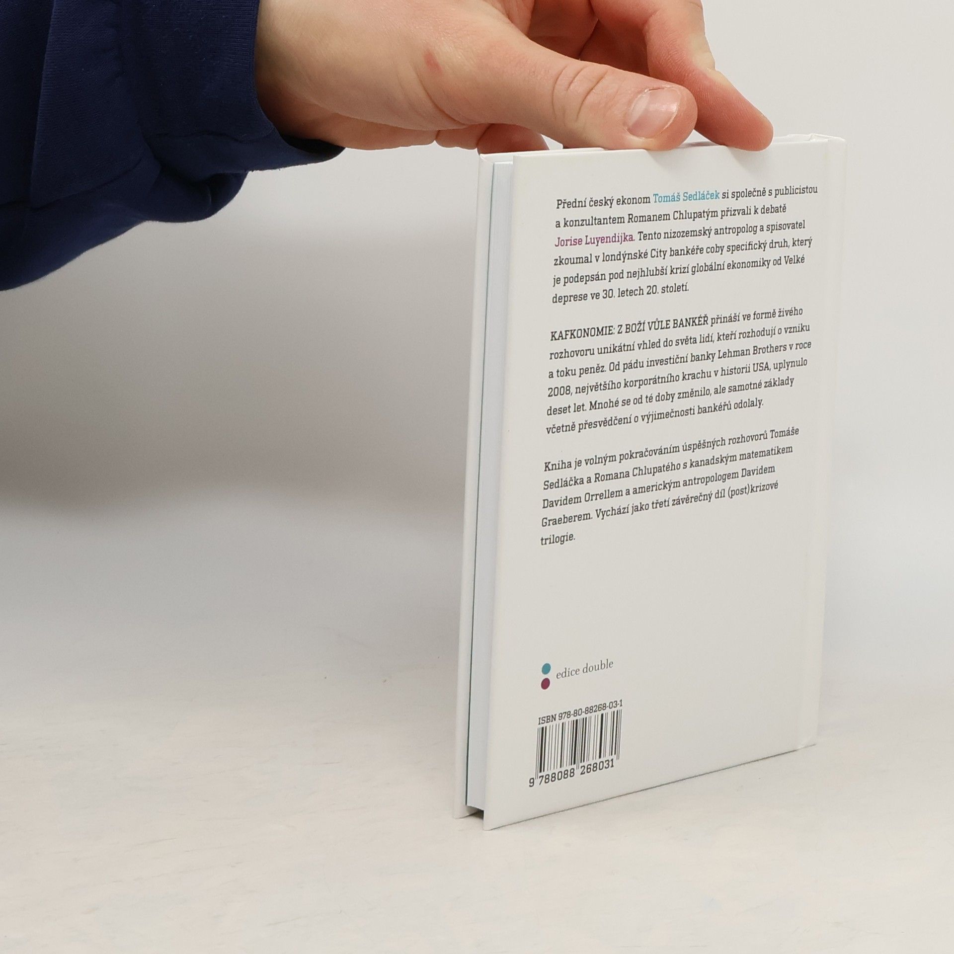 Přední český ekonom Tomáš Sedláček si společně s publicistou a konzultantem Romanem Chlupatým přizvali k debatě Jorise Luyendijka. Tento nizozemský antropolog a spisovatel zkoumal v londýnské City bankéře coby specifický druh, který´ je podepsán pod nejhlubší krizí globální ekonomiky od Velké deprese ve 30. letech 20. století. Kafkonomie: Z boží vůle bankéř: přináší ve formě živého rozhovoru unikátní vhled do světa lidí, kteří rozhodují o vzniku a toku peněz. Od pádu investiční banky Lehman Brothers v roce 2008, největšího korporátního krachu v historii USA, uplynulo deset let. Mnohé se od té doby změnilo, ale samotné základy včetně přesvědčení o výjimečnosti bankéřů odolaly. Kniha je volným pokračováním úspěšných rozhovorů Tomáše Sedláčka a Romana Chlupatého s kanadským matematikem Davidem Orrellem a americkým antropologem Davidem Graeberem. Vychází jako třetí závěrečný díl (post)krizové trilogie.