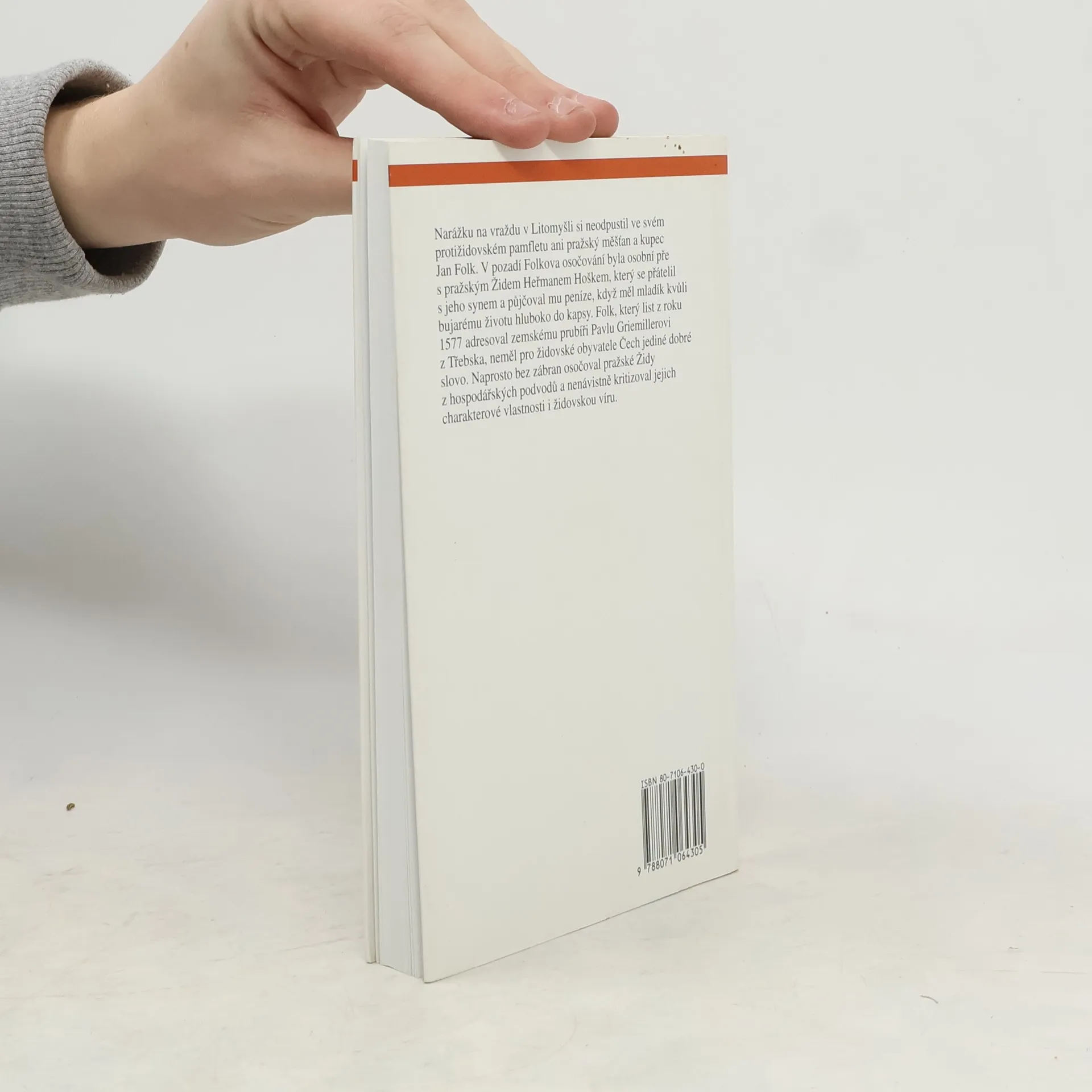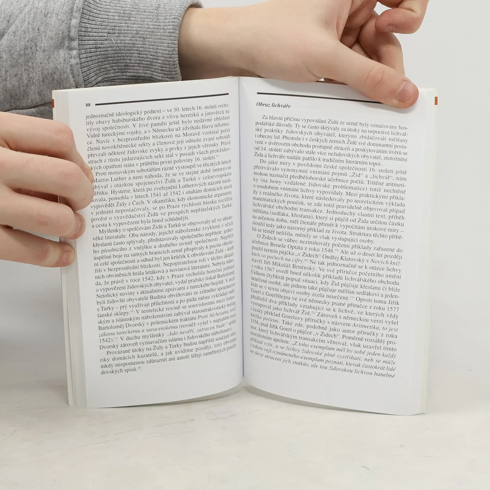 Podtitul: Od středověku k počátkům emancipace Mladá autorka se věnuje již několik let sledování názorů na židy v české společnosti. Těžiště její práce leží v rozboru zpráv a postojů v tištěné literatuře 16. a 17. století, a to v širokém rozpětí od učeného zájmu o hebrejské texty přes zprávy současných kronikářů a moralizující literaturu až po nepřátelské pamflety a stereotypní obviňování. Autorčin pohled sahá zároveň od vnímání židů jako historického etnika až po bezprostřední "stýkání a potýkání" se židovskými současníky. Setkáváme se tu s kořeny moderního antisemitismu, mnoha "neměnnými" názory, ale i zajímavým vývojem pohledu na židovské současníky od středověku až po osvícenství.