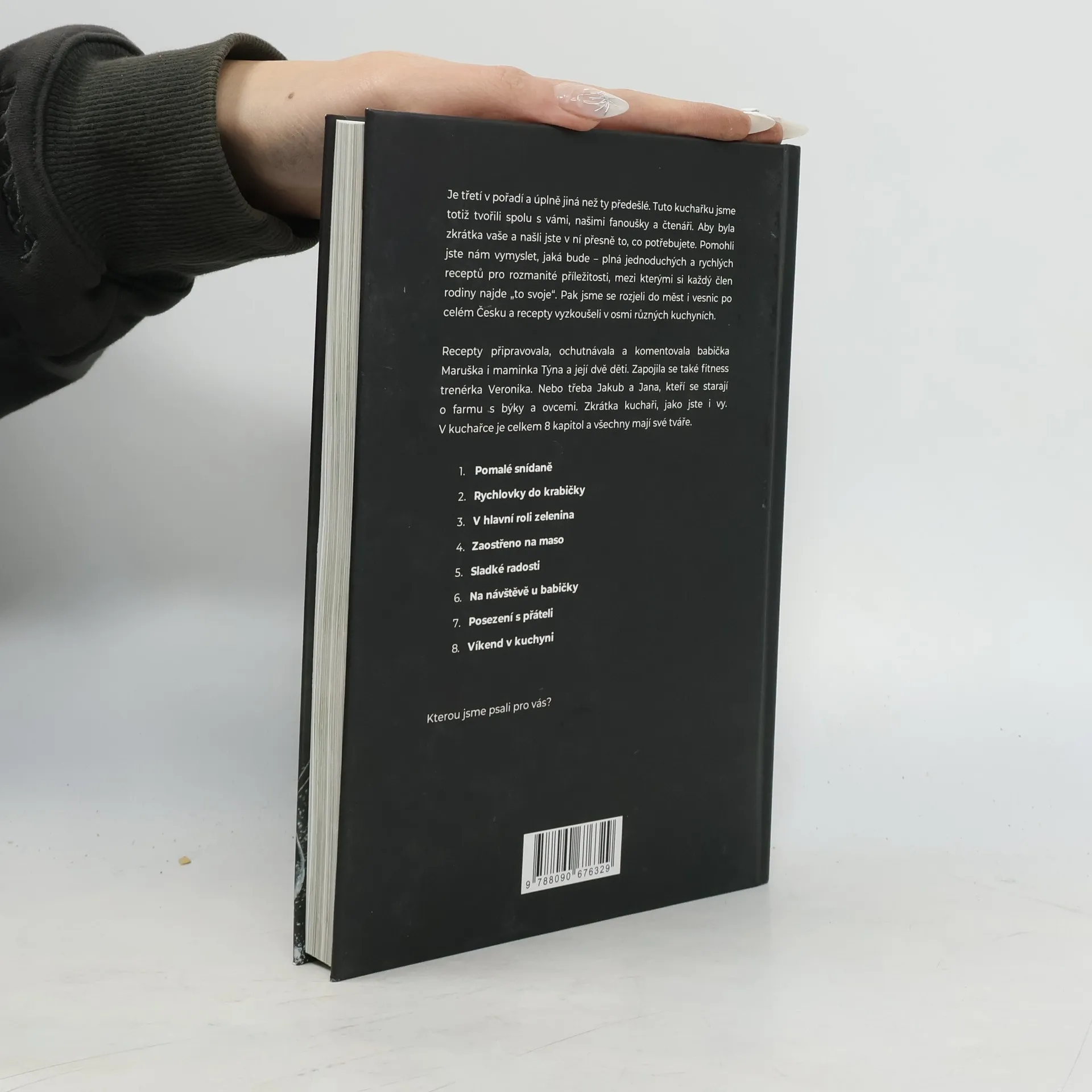 Máme za sebou pěkný kus cesty. Slíbili jsme, že připravíme kuchařku podle vašich přání. Tak jsme pracovali 8 měsíců, ujeli 1 438 kilometrů, vařili v osmi kuchyních po různých koutech Česka – a nezapomněli se radit s vámi. Děkujeme vám za pomoc a podporu! V kuchařce najdete od každého něco – péct budete s mámou Týnou a jejími dětmi. S babičkou Maruškou a její vnučkou ochutnáte tradiční recepty v netradiční podobě. A s fitness trenérkou Verčou se podíváte na to, jaké recepty si můžete zabalit s sebou do krabičky. V celkem 8 kapitolách najdete 110 receptů pro různé příležitosti.
